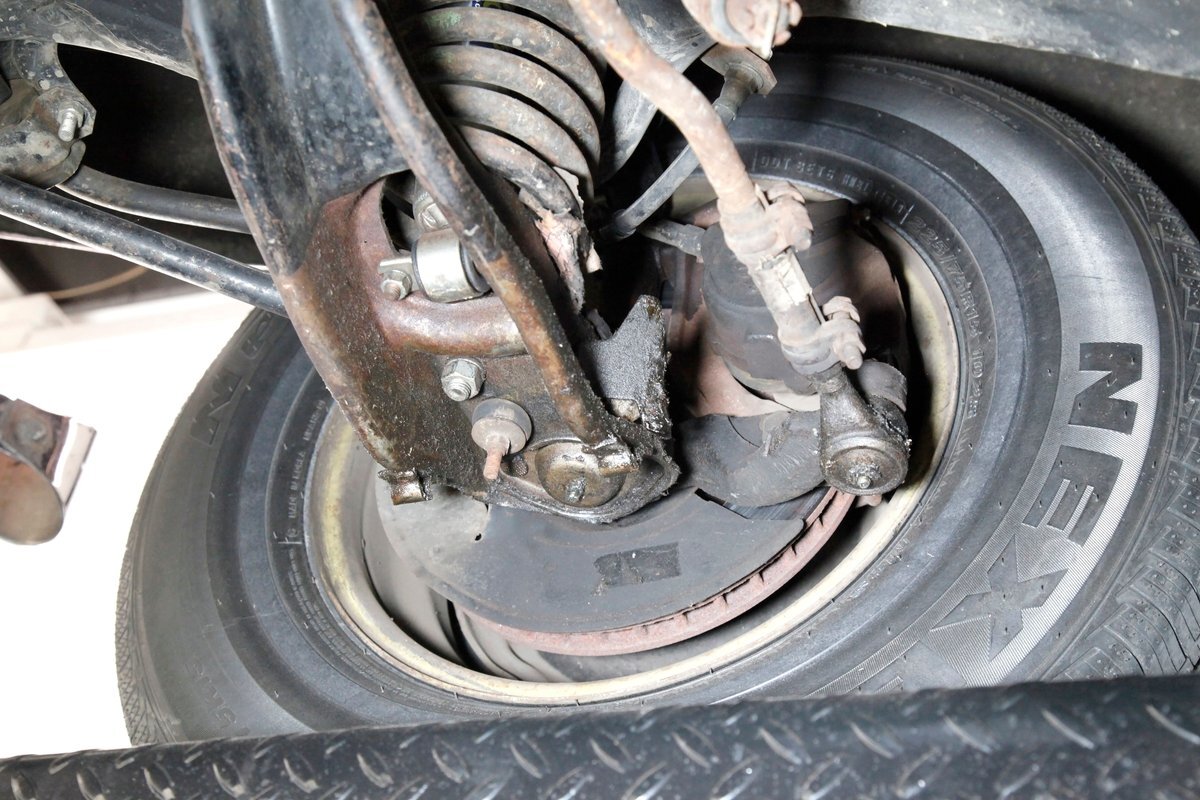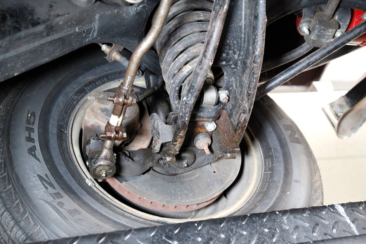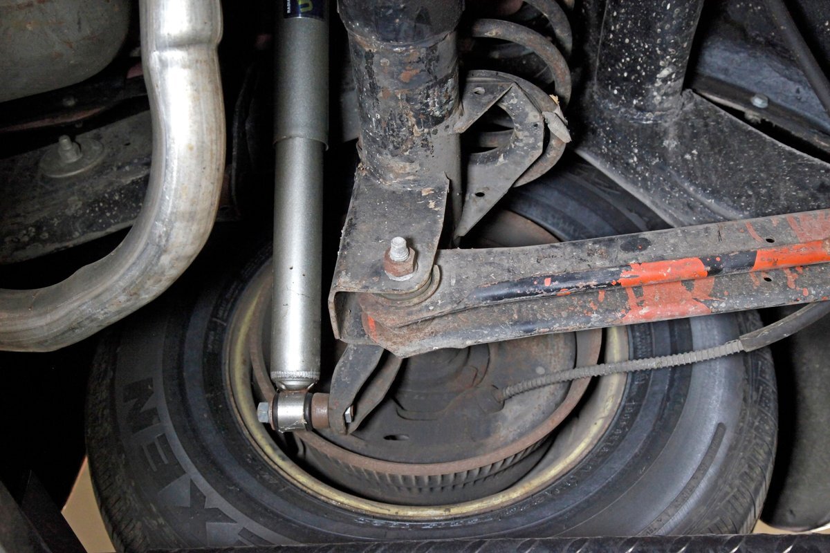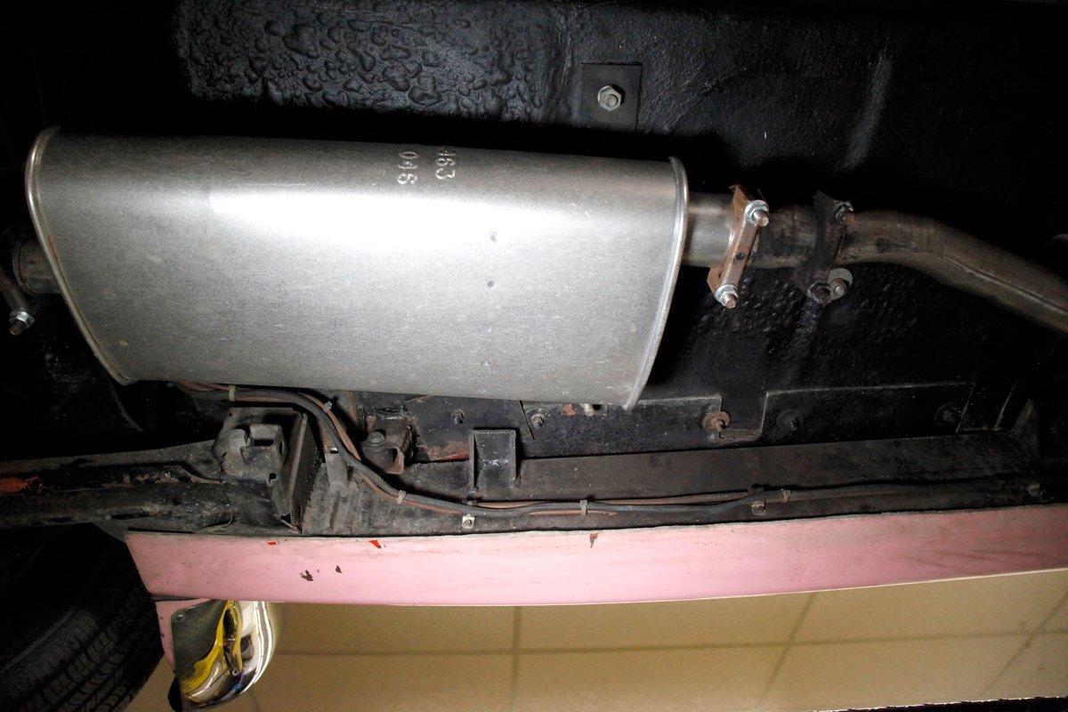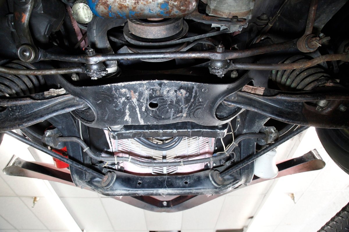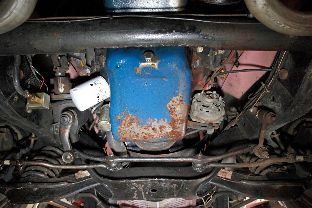 Some light patina is noted on the steel underpinnings of the black heavy coated fiberglass floor pans and wheel wells. Independent coil springs are on front and a 4 link with coil springs is reserved for the back. Power disc braking is up front, and power drums for the rear. Mostly nicely clean underneath.