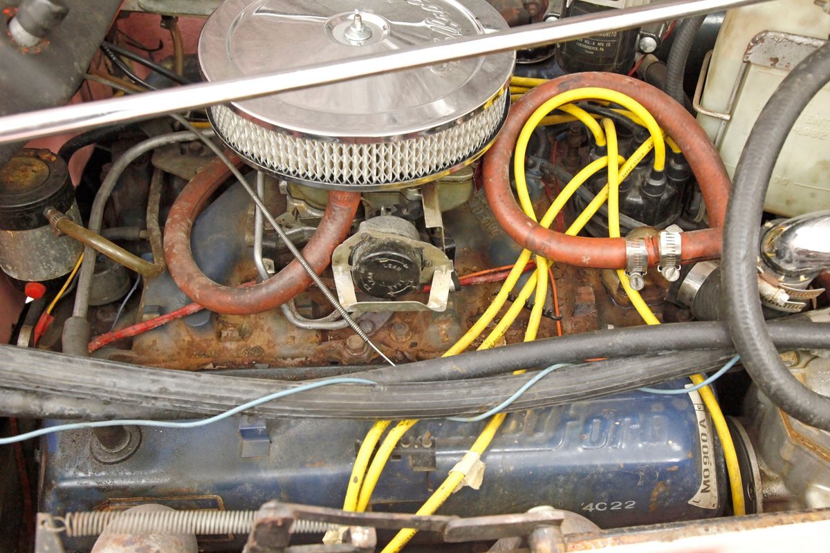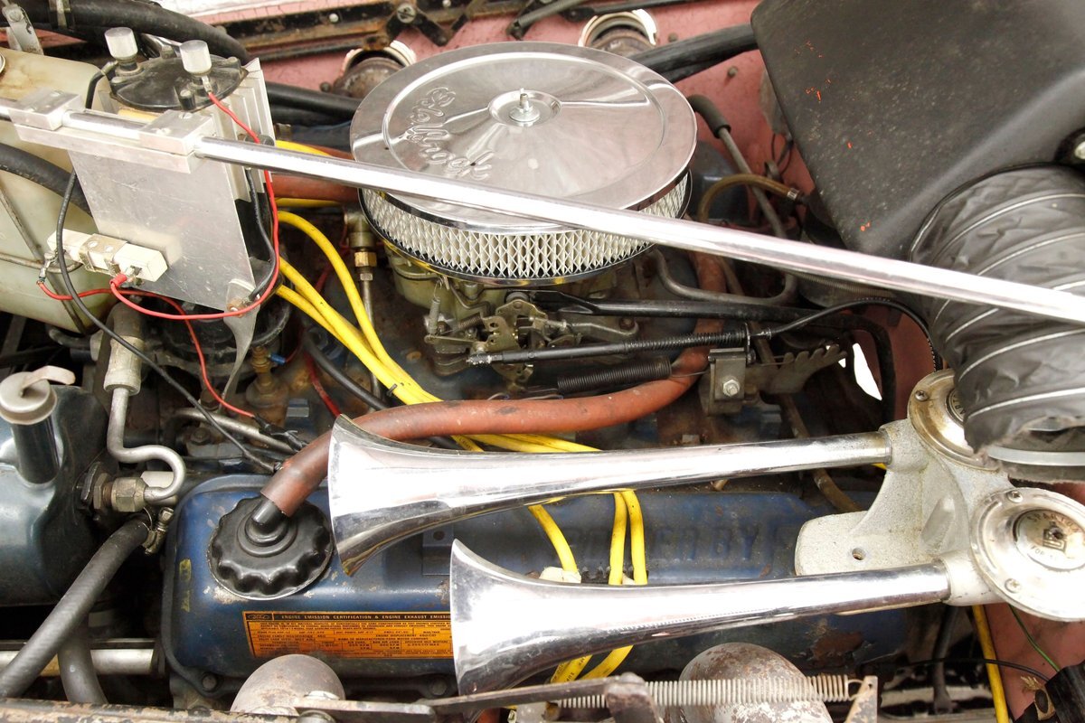 Under the flip to the passengers side hood sits a Ford 460ci V8 fed by a single 4-barrel carburetor. On the back is a 3-speed C6 automatic transmission, and spinning the rear tires is a Ford 9 inch rear. Stock dual exhaust is currently used for the exhale and is fed by the functional cowl piping.