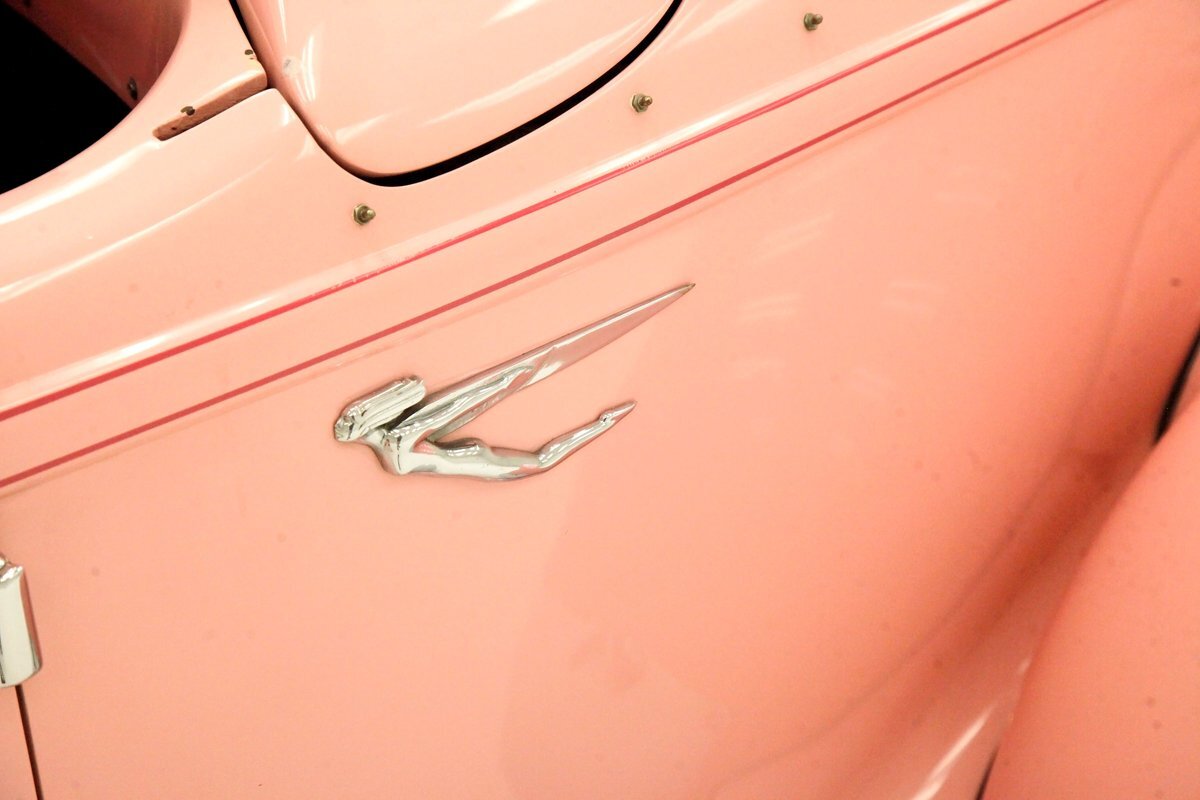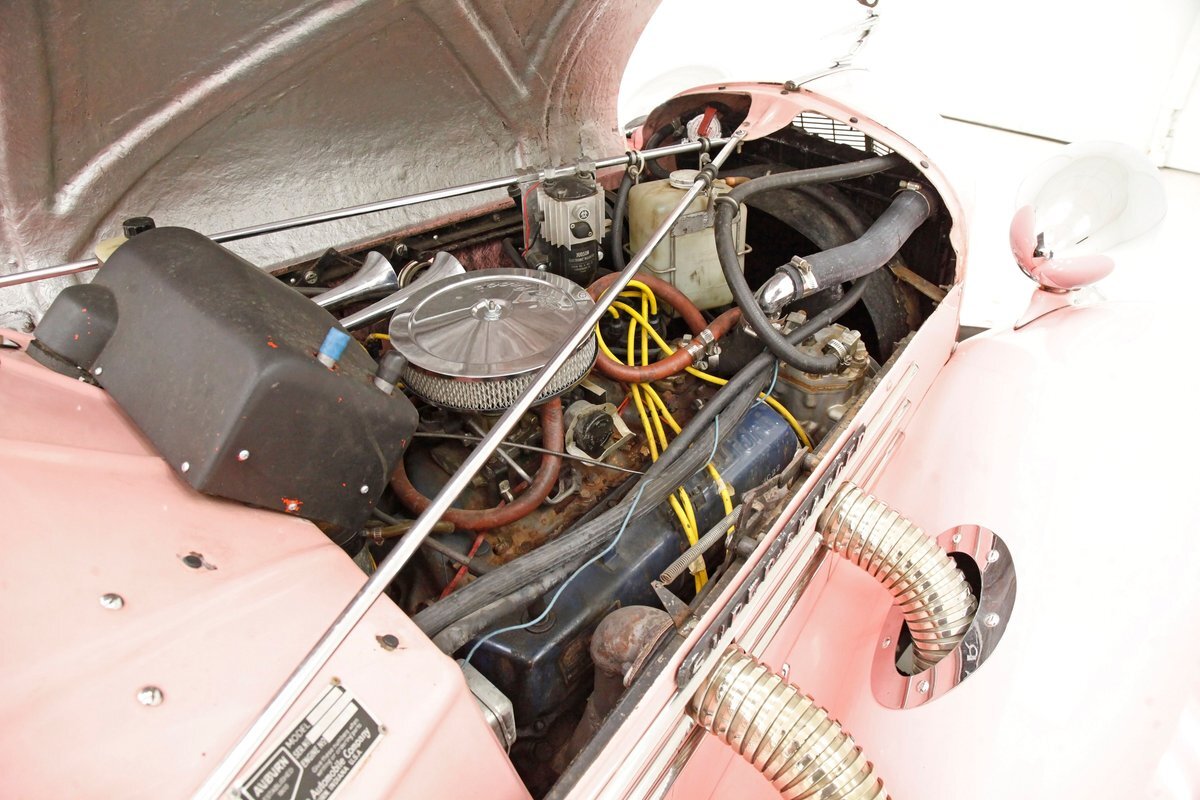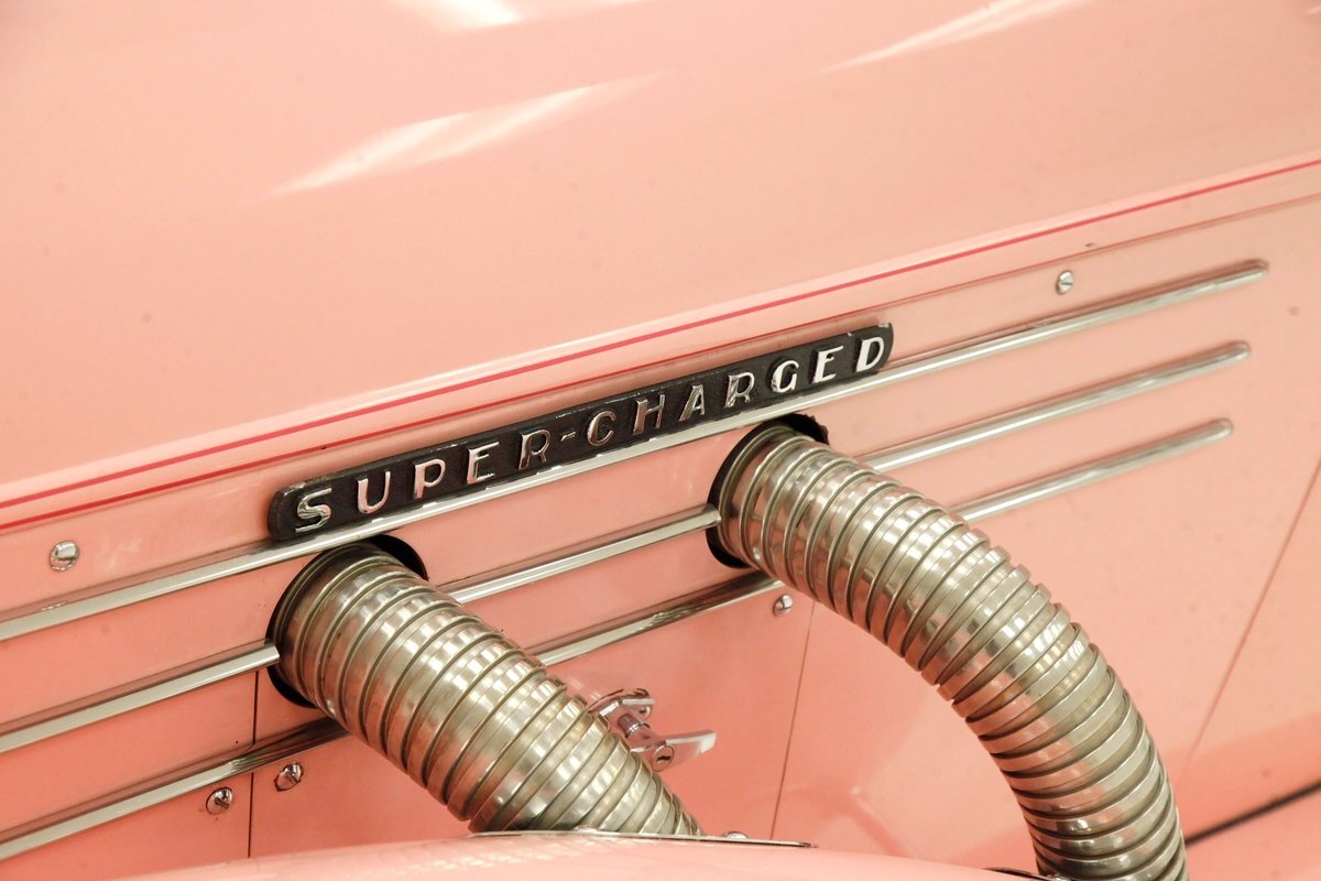 Of course borrowing from the original design, we can lead off with the rear raked shield styled grille in chrome flanked by a single headlight on either side. Curvaceous pink bodywork surrounds the chromed grille, and just below we see an eyebrow shiny chrome bumper. A loooooong cowled hood makes its way back to a chromed surrounded raked back windscreen and on either side of that hood are bulbous pontoon style fenders. Functional dual stainless steel exhaust pipes make their way through the hood and eventually through the fenders and running boards to a rear exit. A nice suicide door offers up entry to the drivers cockpit. Bring on more long slightly curved upward fiberglass to form the back of the car and flank this with more pontoon fenders for the rear tire coverings. These fenders will eventually move away from the inward curving to a point boattail trunk top, giving the car its namesake. Round Tamil lights are in bullet styled bezels just inside the fenders, and below another curved bumper frames the bottom of the car. Small running boards are attaching the front and rear fenders and the rear fenders have a chromed plate on the leading edge that curves around the actual fender. Add on a SUPERCHARGED badge to the venting on the sides of the hood,and some flat aero dog dish chrome wheels wrapped in wide whites and we have the look..of love? Oh and oldest I forget, under that hot pink tonneau, there is a slightly soiled and torn tan canvas convertible top.