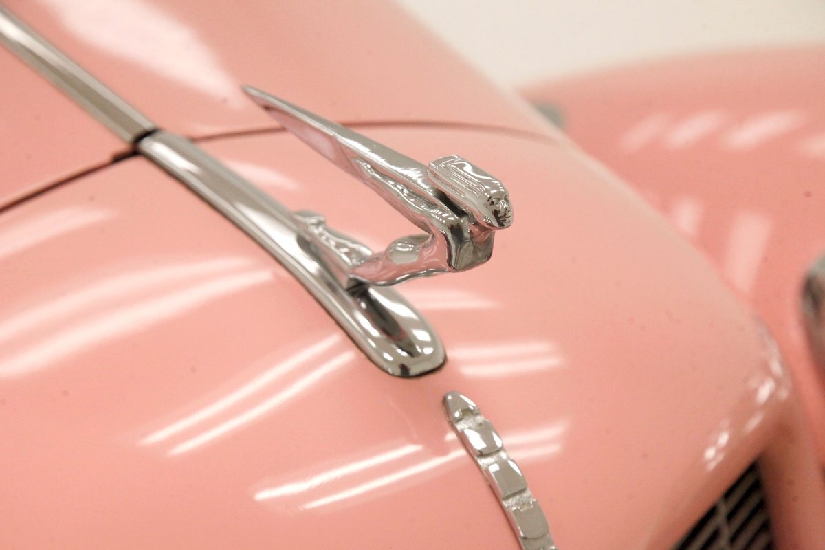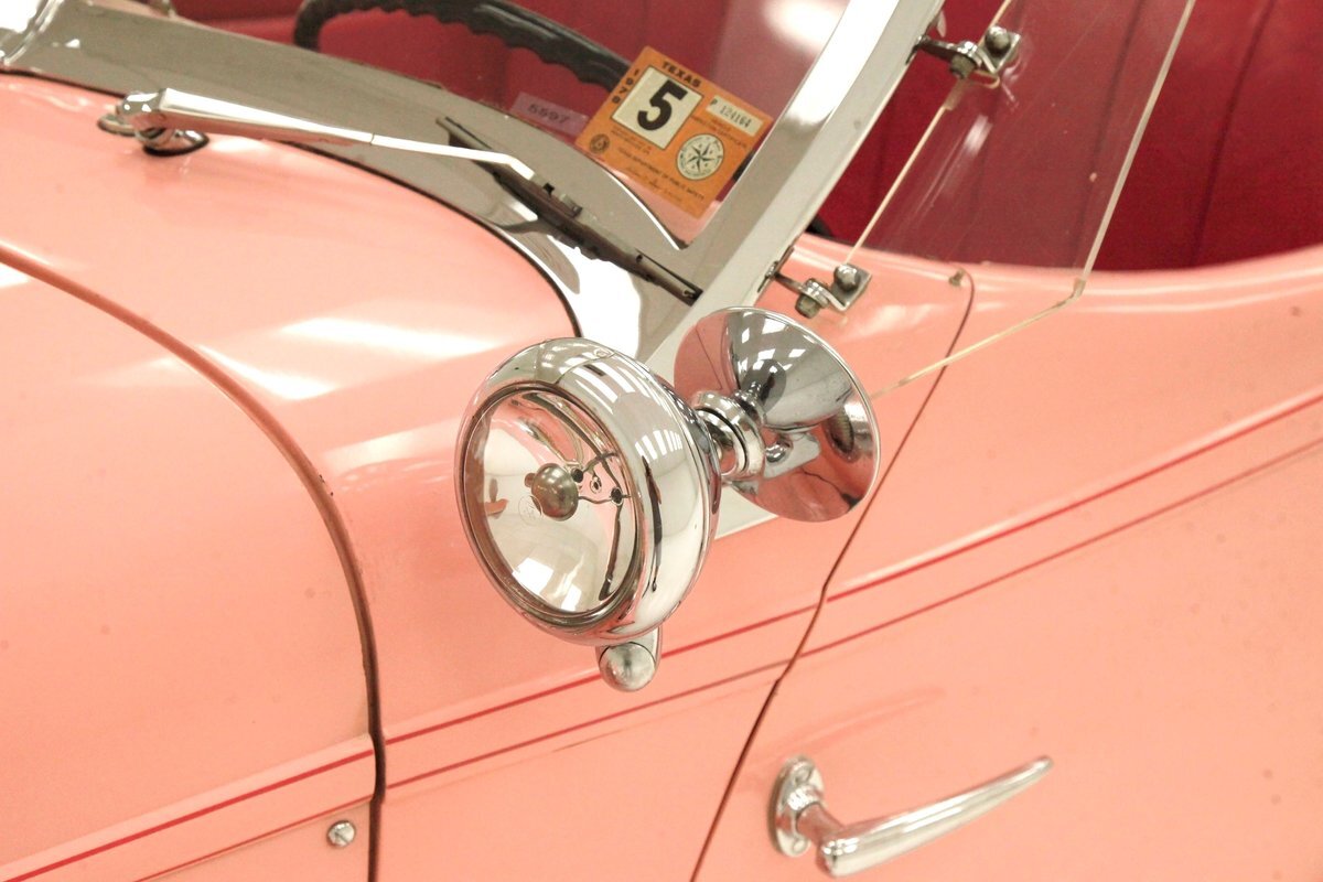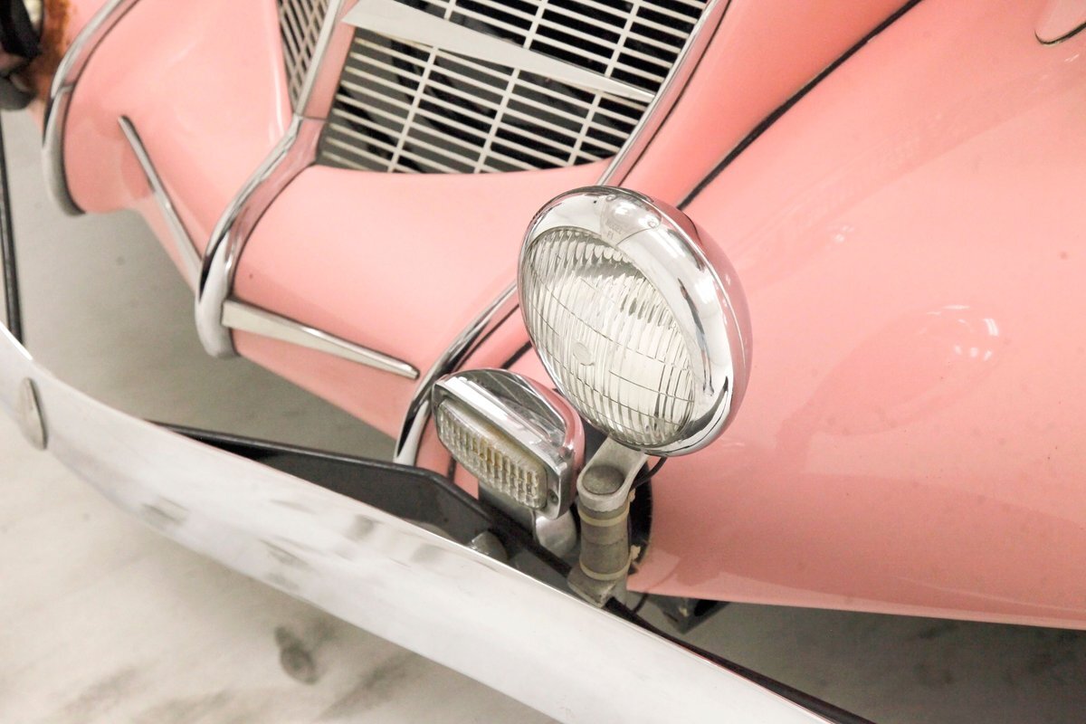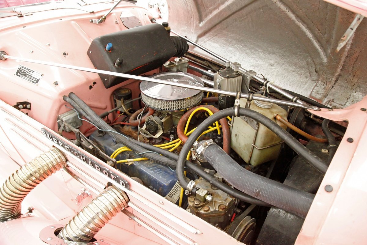 Of course borrowing from the original design, we can lead off with the rear raked shield styled grille in chrome flanked by a single headlight on either side. Curvaceous pink bodywork surrounds the chromed grille, and just below we see an eyebrow shiny chrome bumper. A loooooong cowled hood makes its way back to a chromed surrounded raked back windscreen and on either side of that hood are bulbous pontoon style fenders. Functional dual stainless steel exhaust pipes make their way through the hood and eventually through the fenders and running boards to a rear exit. A nice suicide door offers up entry to the drivers cockpit. Bring on more long slightly curved upward fiberglass to form the back of the car and flank this with more pontoon fenders for the rear tire coverings. These fenders will eventually move away from the inward curving to a point boattail trunk top, giving the car its namesake. Round Tamil lights are in bullet styled bezels just inside the fenders, and below another curved bumper frames the bottom of the car. Small running boards are attaching the front and rear fenders and the rear fenders have a chromed plate on the leading edge that curves around the actual fender. Add on a SUPERCHARGED badge to the venting on the sides of the hood,and some flat aero dog dish chrome wheels wrapped in wide whites and we have the look..of love? Oh and oldest I forget, under that hot pink tonneau, there is a slightly soiled and torn tan canvas convertible top.