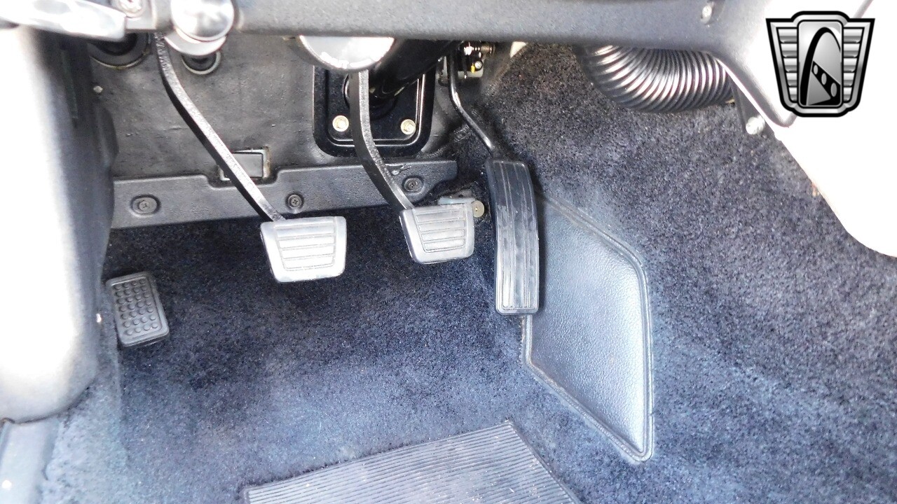 The cockpit features bucket seats trimmed in black vinyl with color-coordinated door panels and carpets. Amenities include air conditioning, a Hitachi AM/FM radio, a wooden shift knob, and a map light. A factory vinyl-trimmed shift knob with a green reflective shift-pattern cap is included in the sale and can be seen in the gallery.
