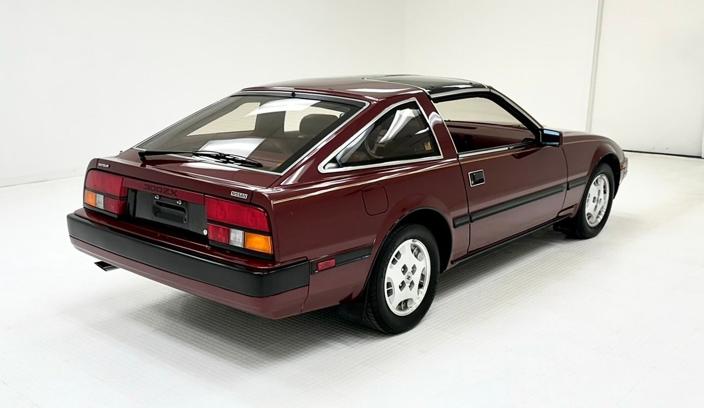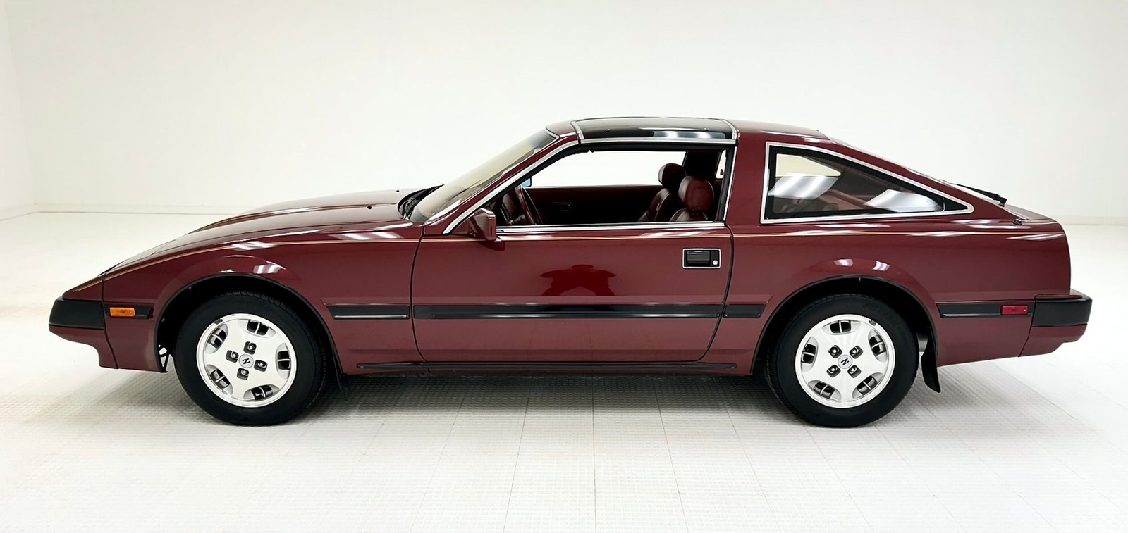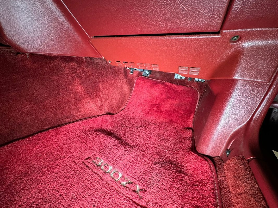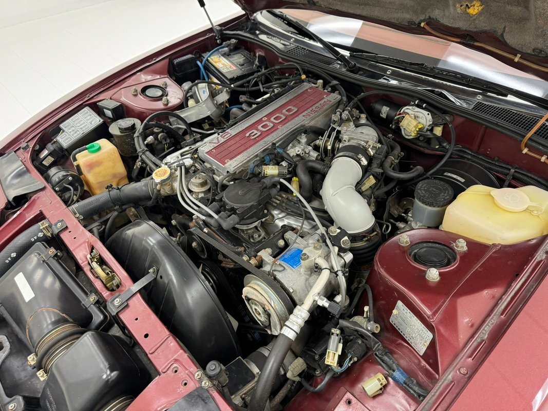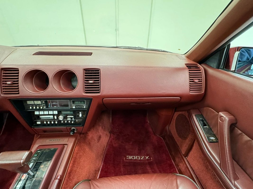 Like a fine merlot, this vintage car is bathed in a coat of Wine paint, a shade of red that is cool enough to be sporty but not so bright as to attract law enforcement. The low, long nose and raked windshield are striking. The small bit of extension on the 2+2 adds to the wheelbase and in some Z-cars circled is preferred for claims of better handling that the shorter wheelbase of the 2 seater. Long doors and that angular rear quarter window create a dramatic profile. The headlights are a unique combination of exposed lenses and flip up and give the car its distinct face. The rear taillights are joined by a center reflector piece with 300ZX printed on it. During this transitional period, both the Datsun badge and the Nissan badge appear on the rear hatch lid. A gold double pinstripe shoots down the side of the car and the T-tops provide for open air driving or a bright, enclosed cabin. The paint and body are near immaculate, and we note one scratch on the rocker panel. The 4-lug vented wheels are original and are one of those design features that just work!