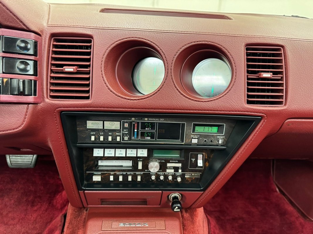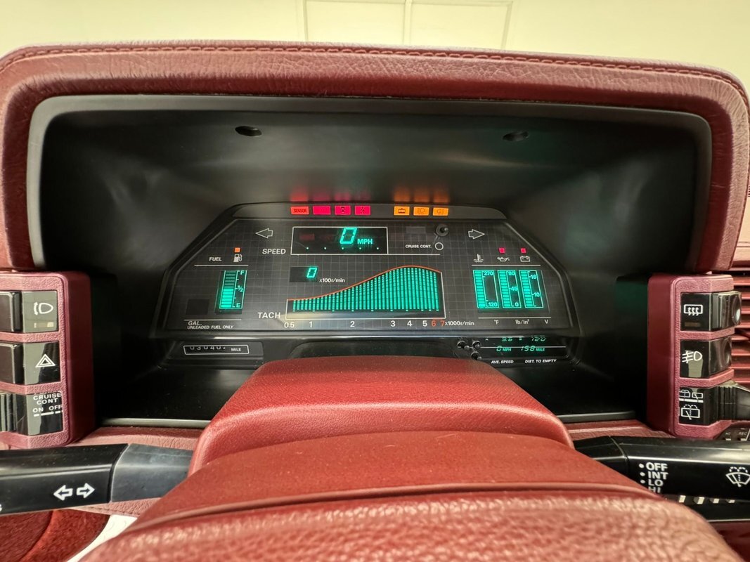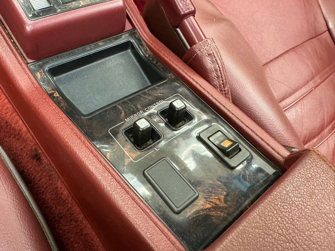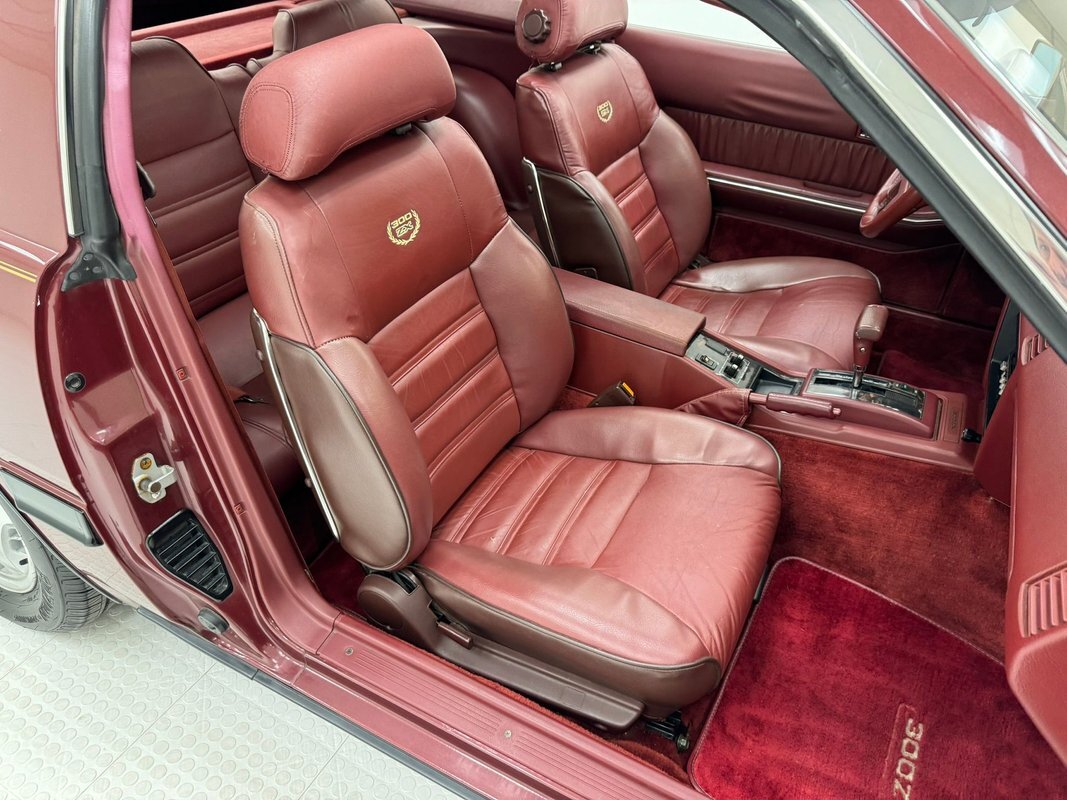 There's an 80's vibe in here but damn those seats are nice and that's where our eyes are drawn. Brown and burgundy leather in mixed panels and pads create a dramatic presentation. The sport stitched inserts are flanked by lumbar supports in a smooth leather. The gold 300ZX crest is embroidered into the seat backs and an adjustable headrest rises above it. The electric seat controls are housed in a stunning dark wood applique and have 8 way adjustments. The simple door panels contain a pleated leather insert and a long armrest with integrated door pull and window controls. The carpeted door bottoms include speakers. Lest we forget, the back seats are firm leather buckets and look brand new. The burgundy leather wrapped steering wheel has a pure 80's plastic center that connects at the bottom only. The dash looks like an arcade game from the era, awash in green digital readouts and red and orange idiot lights. Pods to each side of the gauge cluster contain various controls and in pure Z-car fashion, the center gauges for direction, acceleration and MPG's, are canted towards the driver and backlit in green. Below them are the climate controls with more green digital numbers and the integrated radio with more silver buttons than the tin man's jacket. The automatic shifter is the typical T-shape for the period and housed in the center console, where more faux dark wood leans towards the grand touring aspirations of the car. The red carpet and headliner around the T-tops and rear are in wonderful condition.