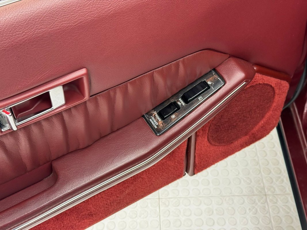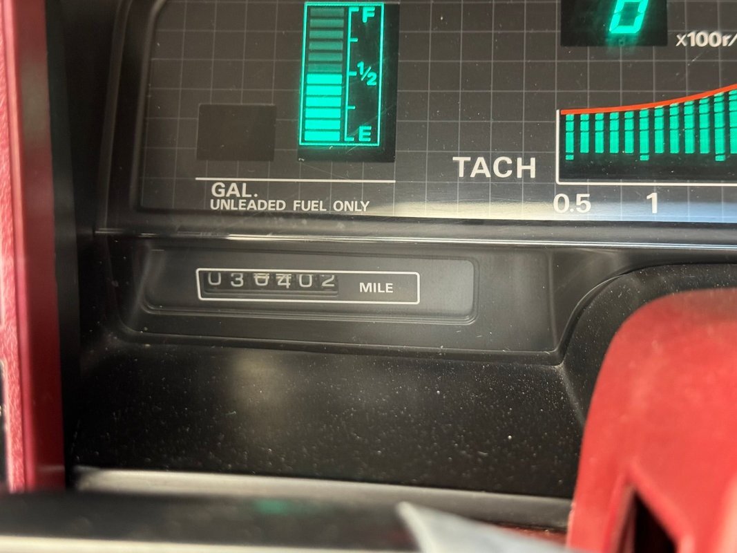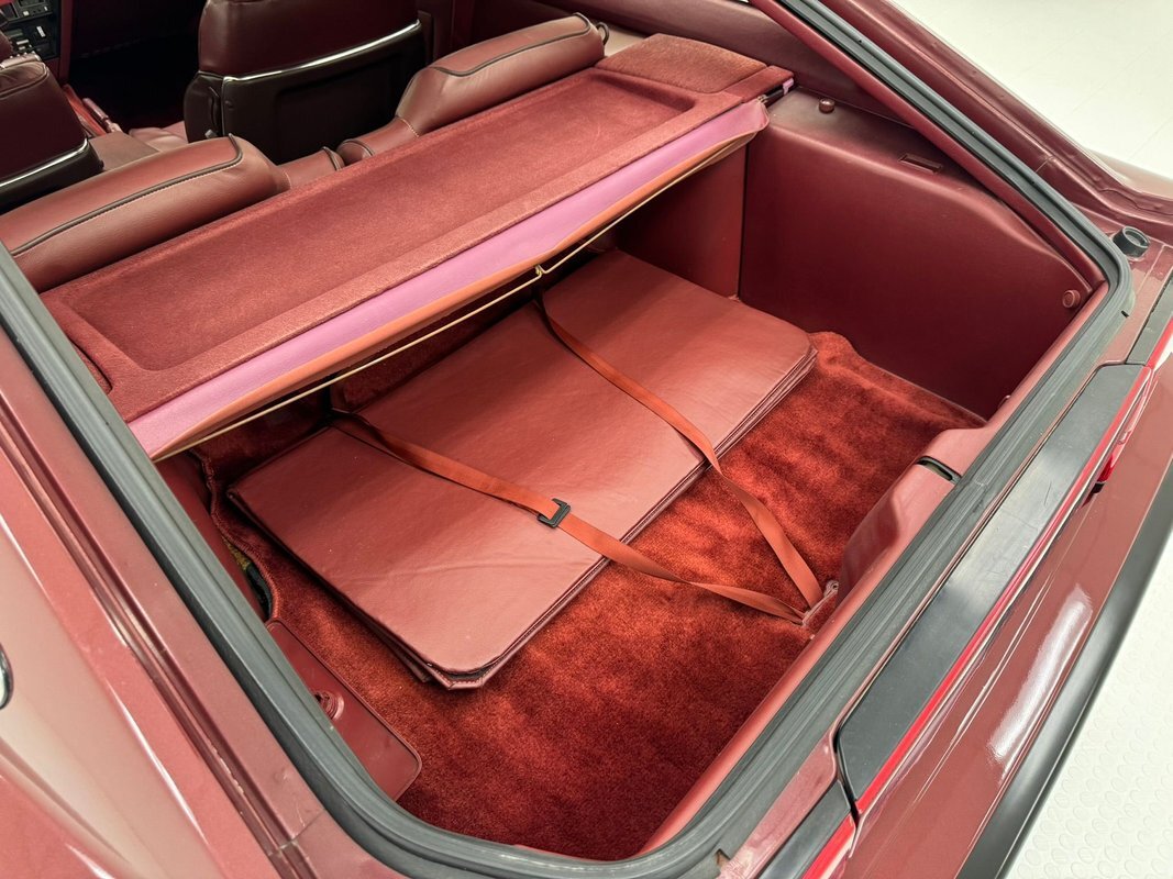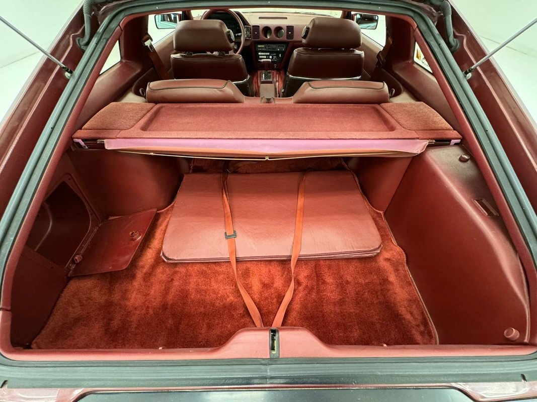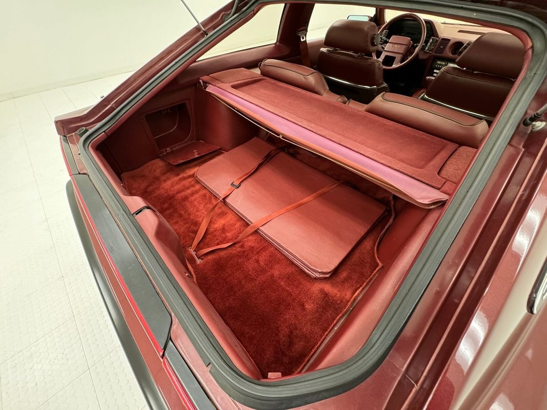 There's an 80's vibe in here but damn those seats are nice and that's where our eyes are drawn. Brown and burgundy leather in mixed panels and pads create a dramatic presentation. The sport stitched inserts are flanked by lumbar supports in a smooth leather. The gold 300ZX crest is embroidered into the seat backs and an adjustable headrest rises above it. The electric seat controls are housed in a stunning dark wood applique and have 8 way adjustments. The simple door panels contain a pleated leather insert and a long armrest with integrated door pull and window controls. The carpeted door bottoms include speakers. Lest we forget, the back seats are firm leather buckets and look brand new. The burgundy leather wrapped steering wheel has a pure 80's plastic center that connects at the bottom only. The dash looks like an arcade game from the era, awash in green digital readouts and red and orange idiot lights. Pods to each side of the gauge cluster contain various controls and in pure Z-car fashion, the center gauges for direction, acceleration and MPG's, are canted towards the driver and backlit in green. Below them are the climate controls with more green digital numbers and the integrated radio with more silver buttons than the tin man's jacket. The automatic shifter is the typical T-shape for the period and housed in the center console, where more faux dark wood leans towards the grand touring aspirations of the car. The red carpet and headliner around the T-tops and rear are in wonderful condition.