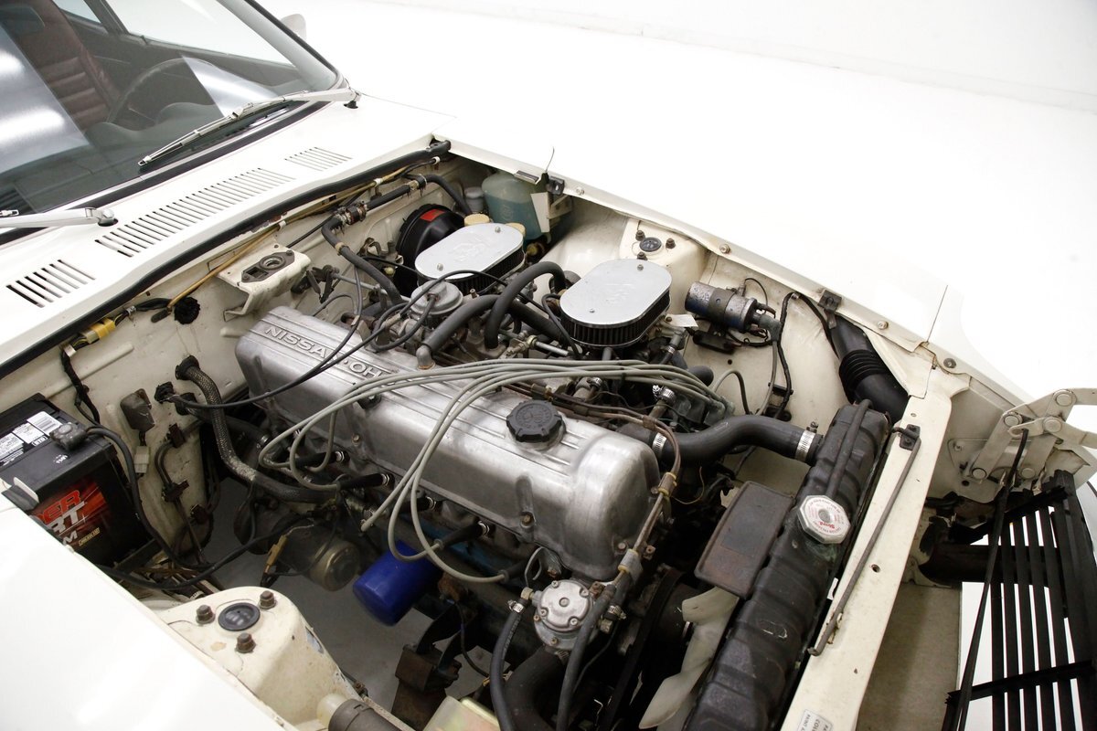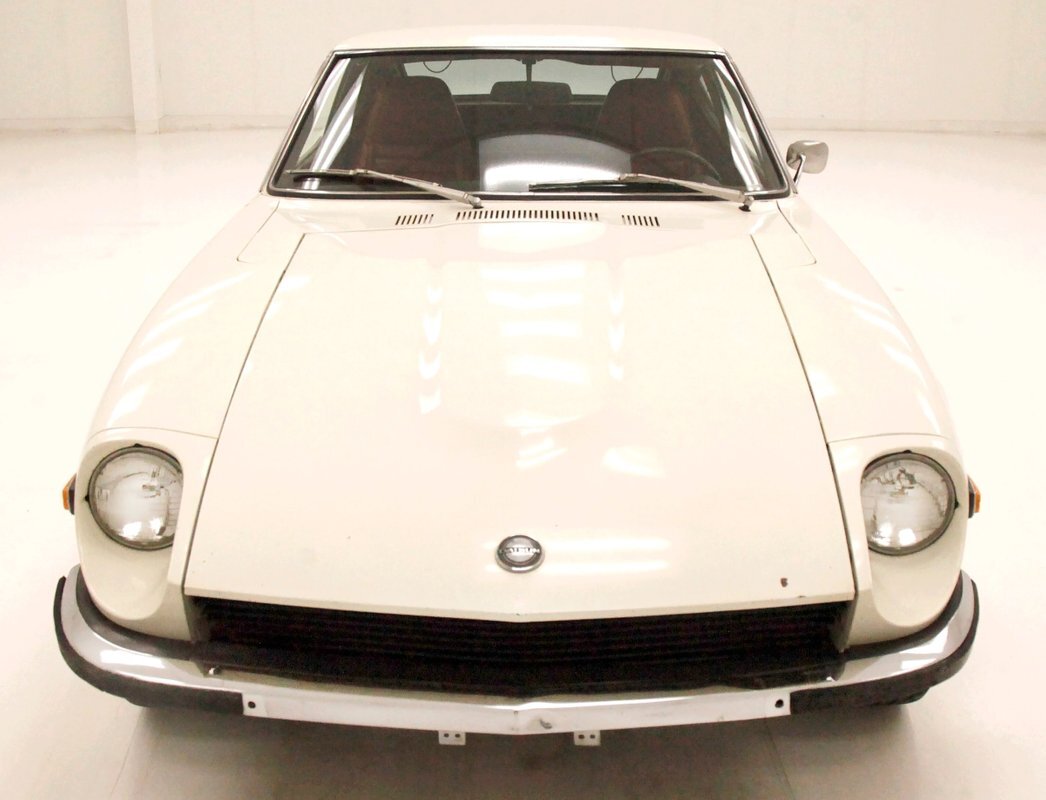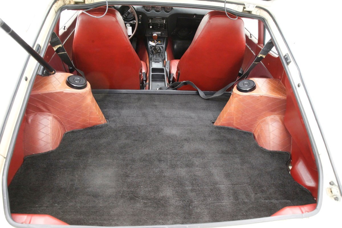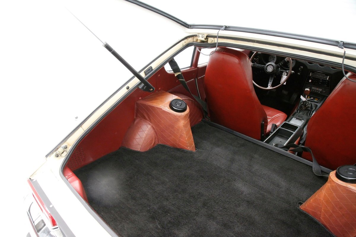 With gaps that remain consistent, we can see the consignor stated original white as the driven snow paint. It is a fair paint job and shines nicely but does have a few areas of overspray in the door jambs leading us to believe there was at minimum some spot in work performed in the past. The quintessential pony car with Japanese influence, its long hood, inset head lighting, black contrasting egg crate grille and long sloping hatchback the side view sells this car. I can see why it was so wildly popular in its heyday. Take this design, throw in plenty of reliability and some sporty performance and we have a winner winner chicken dinner! Black accenting, chrome bumpers with non stock California bumper bars, as well as the aforementioned black grille and the black rear roll pan give it a sporty yet sophisticated look. Some surface and beginnings of invasive rust on nearly all of the lowers on this car, some dents and paint peeling off are pretty typical with a car of this age. Aluminum slotted wheels are wrapped 185/70R14 rubber all around. These tires are older, although look good, and the consignor states that the left front has a slow leak.