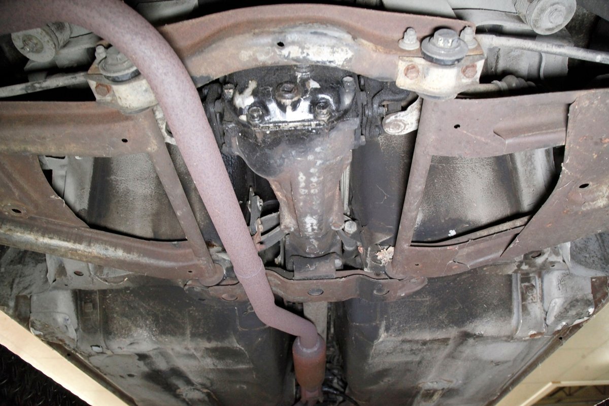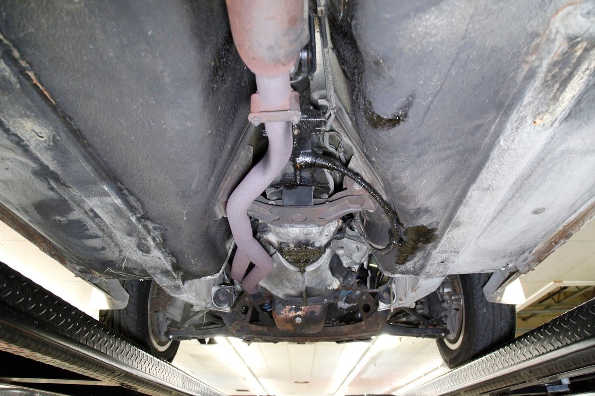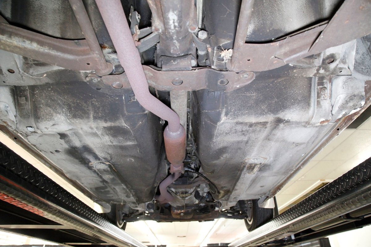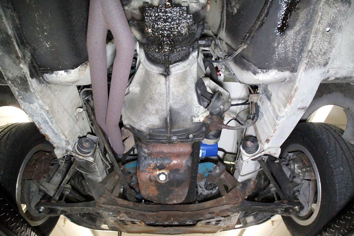 Road dirt, patina and some surface rust abounds although it is not seen as invasive. Some oil blowback is noted on the transmission and rear gear housing.n All around, Macpherson strut independent suspension is on along with power disc brakes in front and power drums in back. The single exhaust has a glass pack style muffler.