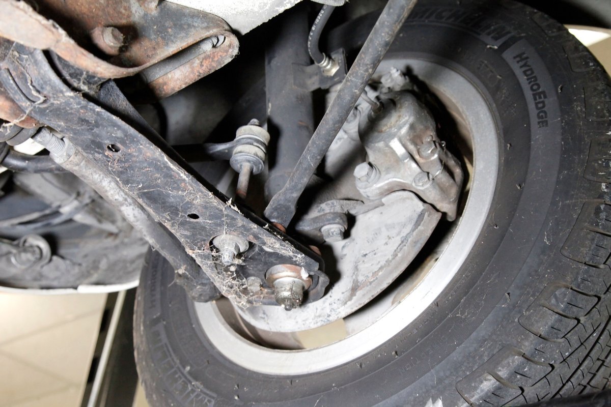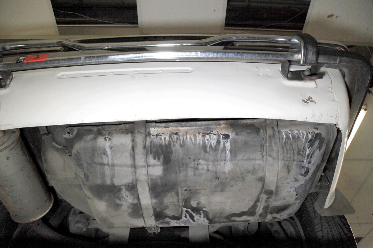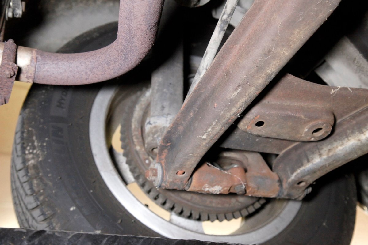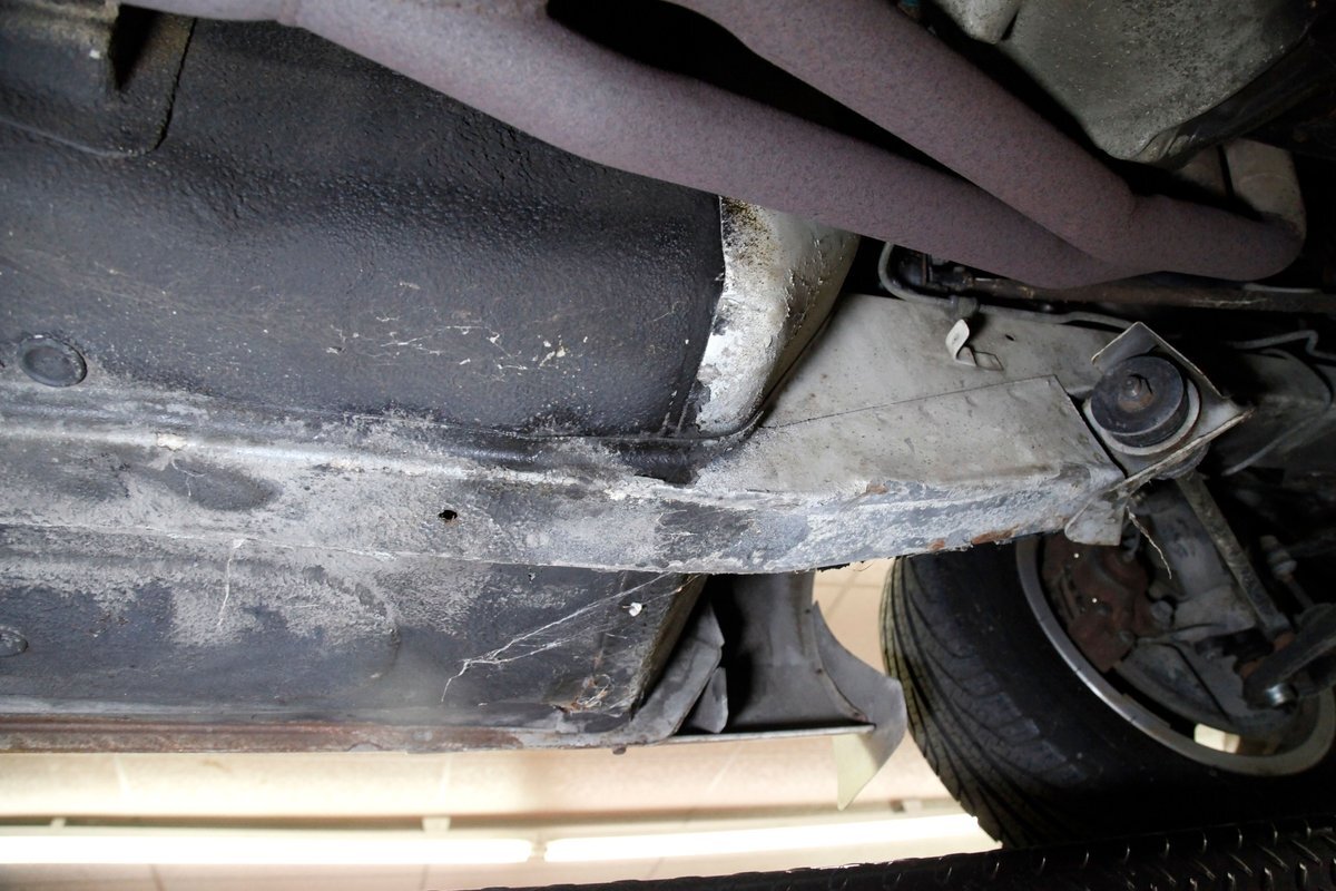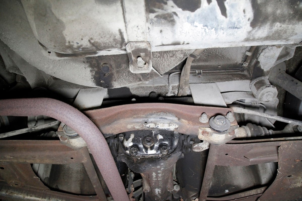 Road dirt, patina and some surface rust abounds although it is not seen as invasive. Some oil blowback is noted on the transmission and rear gear housing.n All around, Macpherson strut independent suspension is on along with power disc brakes in front and power drums in back. The single exhaust has a glass pack style muffler.