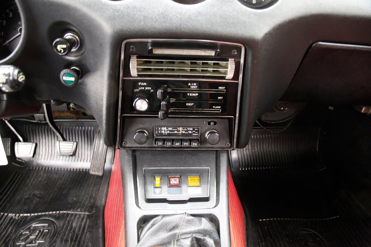 The word original looking crops up with sleek styled high back bucket seats that have new recovered red vinyl tuck and roll inserts and smooth red bolsters. Small round air venting is seen on the bucket lowers of the uprights. A black plastic deep inset instrument molded dash is original and shows with 3 small cracks. There is a factory wood rimmed steering wheel, inset round sweep gauges are in the front of the driver, and within top of center dash is a trio of deep inset round gauges. Just below is an AC vent, temp sliders, and factory AM/FM radio. This panel melts into the center console where the shifter and handbrake reside along with an open tray storage area in the back. The sides of the console covering the hump we note triangulated stitched vinyl in red covering. Behind these seats is a carpeted storage area, ready to hold nearly anything you can throw in. This carpet as well as flooring carpeting is very clean. The remainder of the rear cargo area is covered in a nice black carpet, the headliner is smooth red vinyl and tight, and door panels are smooth and in good condition.
