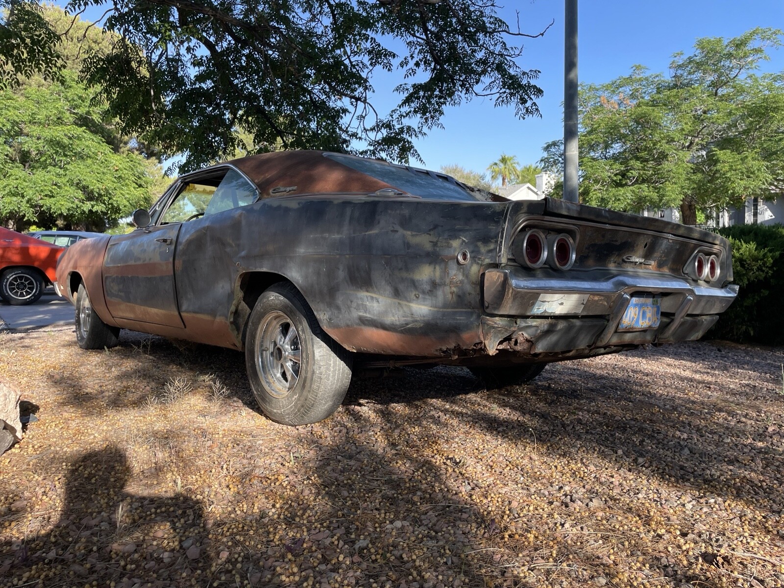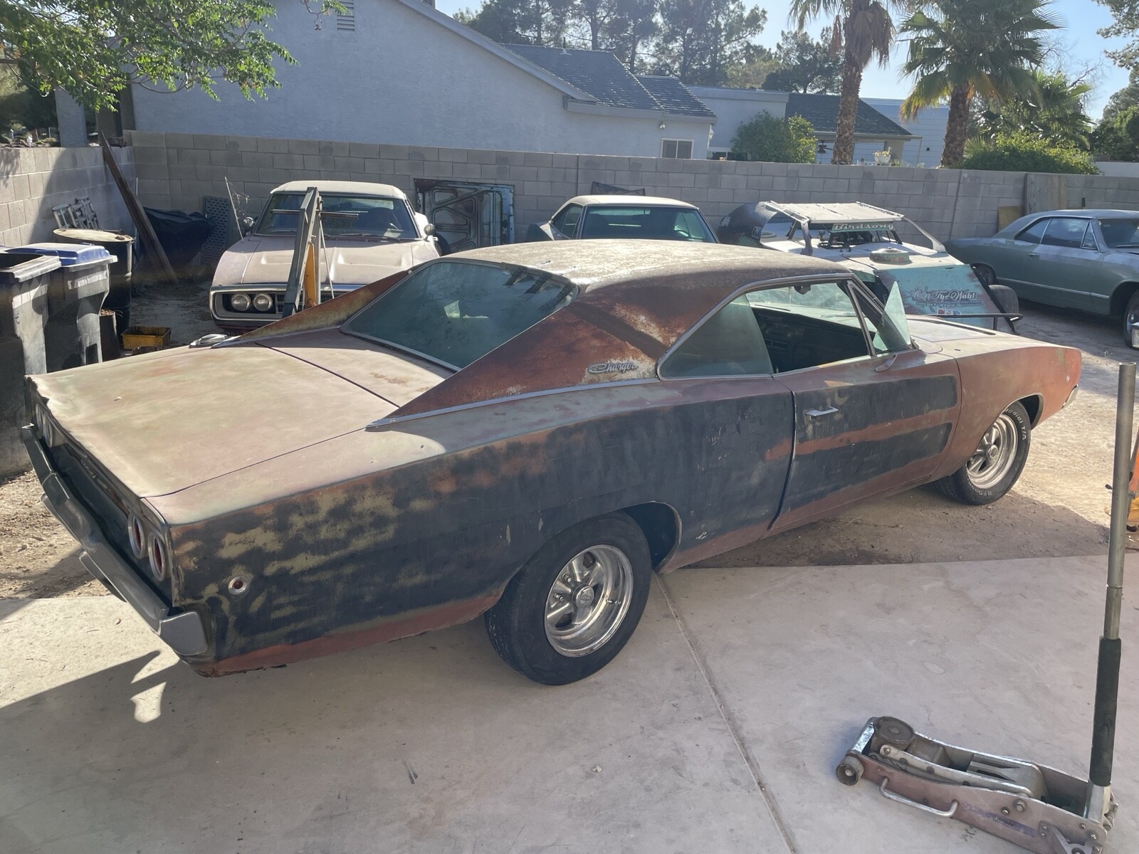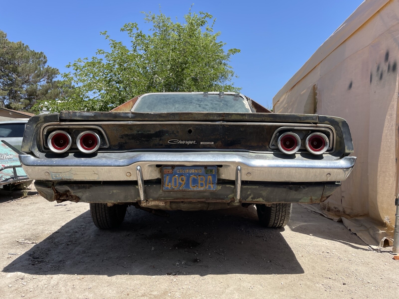 This 68 charger has been sitting since 1984 in central California. We got it running and driving to be a yard driver and just have fun with. it needs rear brakes, exhaust and electrical work to be what I would call roadworthy… Can you fire it up do burnouts and have fun yes. It’s an original light green metallic with black interior, 318 column shift automatic (now 3 speed manual on floor), 3 speed wiper, wood grain wheel, a/c, power steering and power brakes. Fender tag is still attached to inner fender. It’s pretty solid car except for typical lower 1/4’s and rear valance. There is a few hole spots floor board aswell. We did a YouTube video on getting it running and driving just for fun on YouTube if you would like to see more of the car on “Junkerup” https://youtu.be/-9vbWudf4vE?si=AbsjPvxNC6oIA9QA