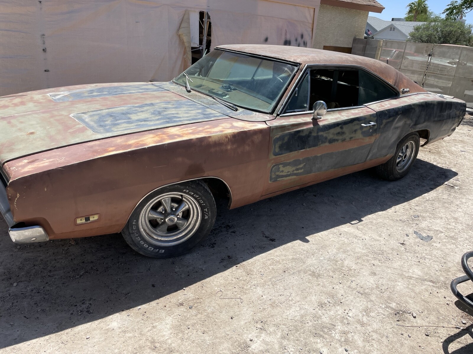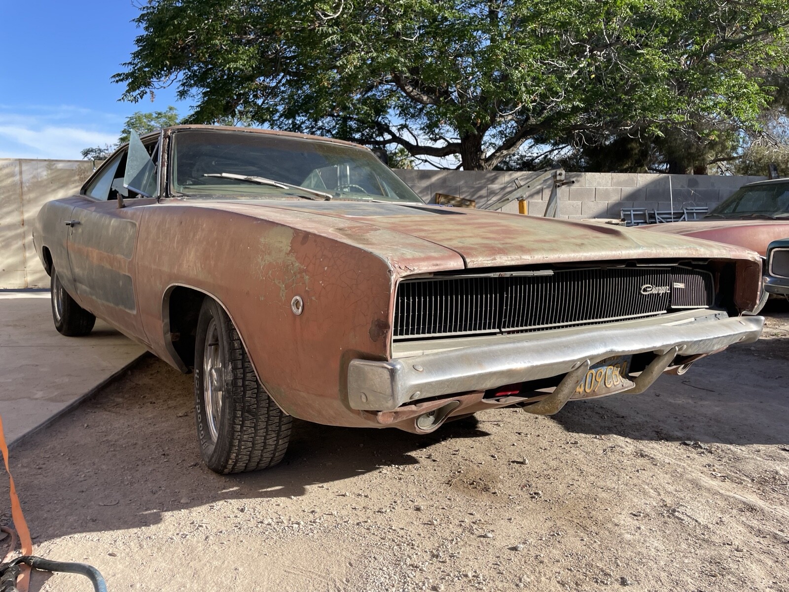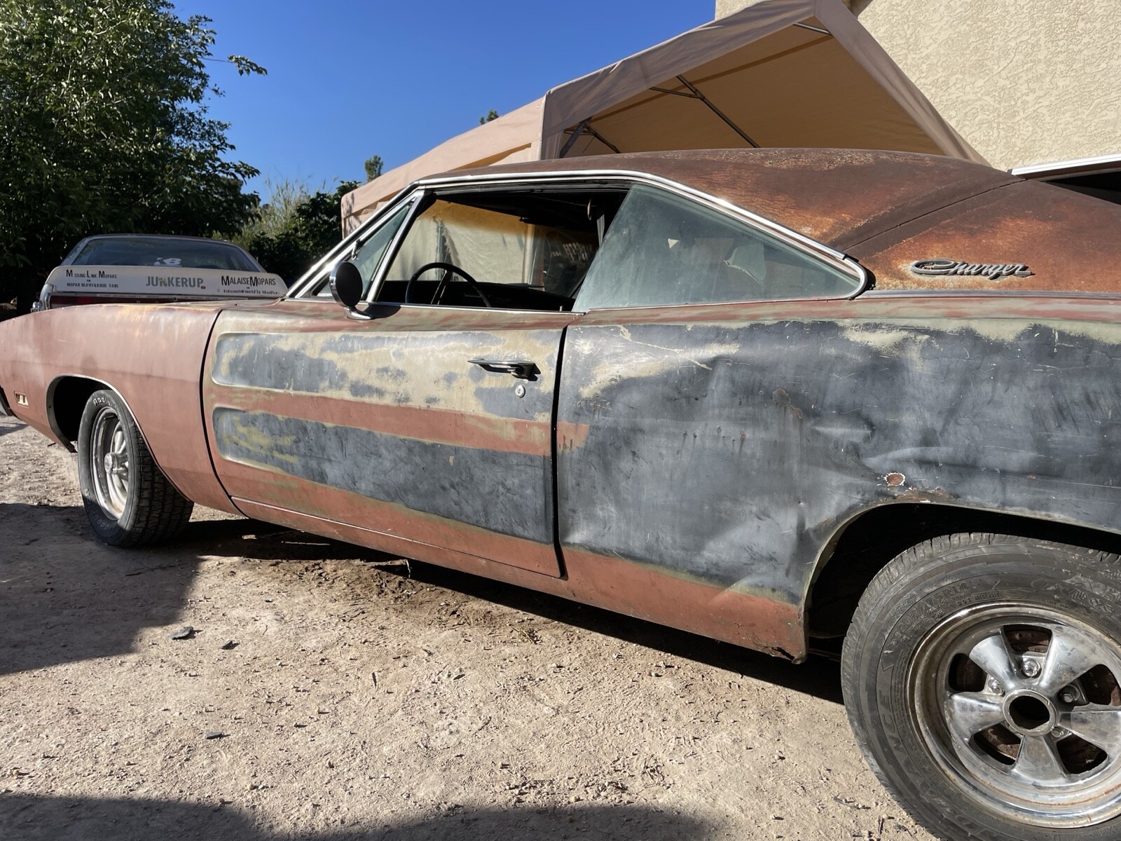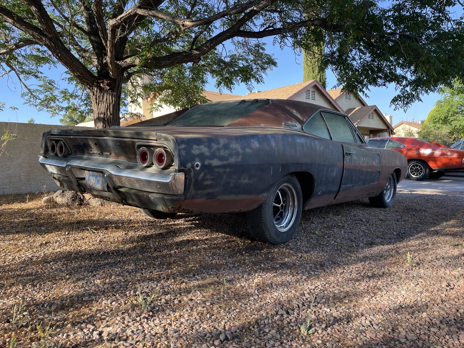 This 68 charger has been sitting since 1984 in central California. We got it running and driving to be a yard driver and just have fun with. it needs rear brakes, exhaust and electrical work to be what I would call roadworthy… Can you fire it up do burnouts and have fun yes. It’s an original light green metallic with black interior, 318 column shift automatic (now 3 speed manual on floor), 3 speed wiper, wood grain wheel, a/c, power steering and power brakes. Fender tag is still attached to inner fender. It’s pretty solid car except for typical lower 1/4’s and rear valance. There is a few hole spots floor board aswell. We did a YouTube video on getting it running and driving just for fun on YouTube if you would like to see more of the car on “Junkerup” https://youtu.be/-9vbWudf4vE?si=AbsjPvxNC6oIA9QA