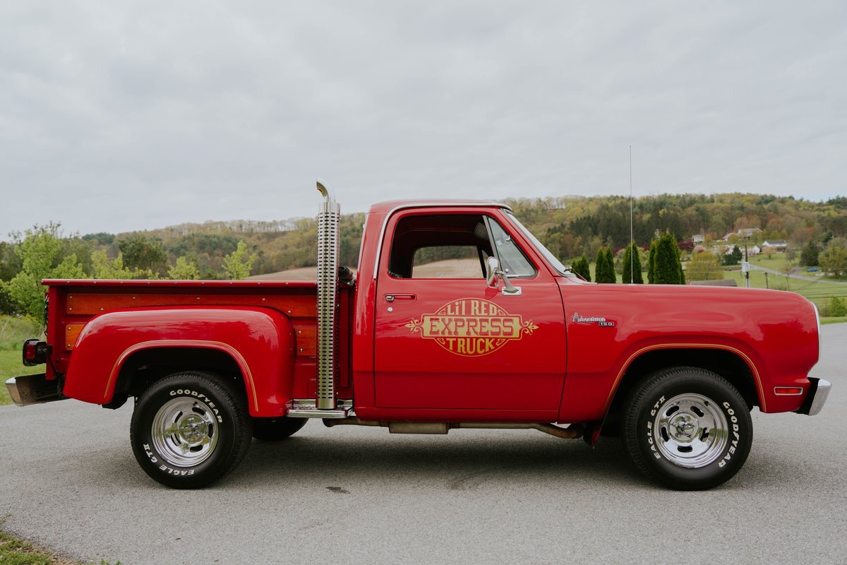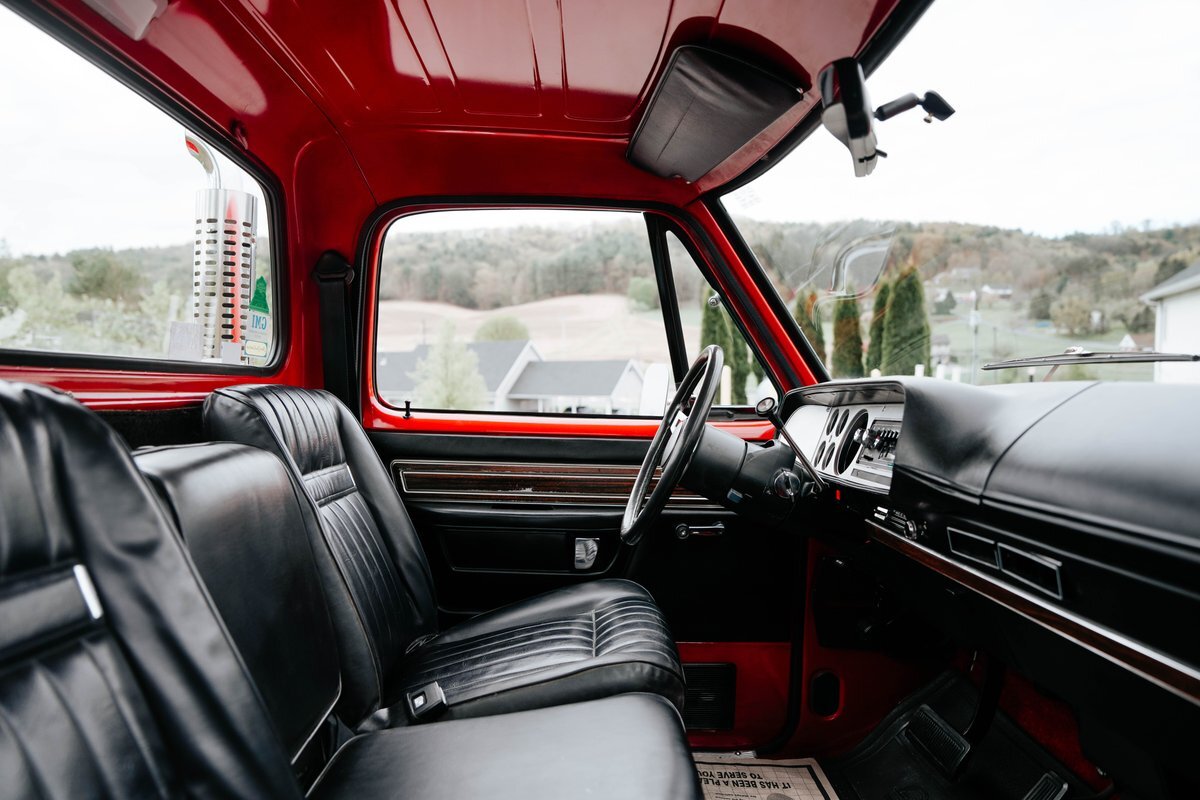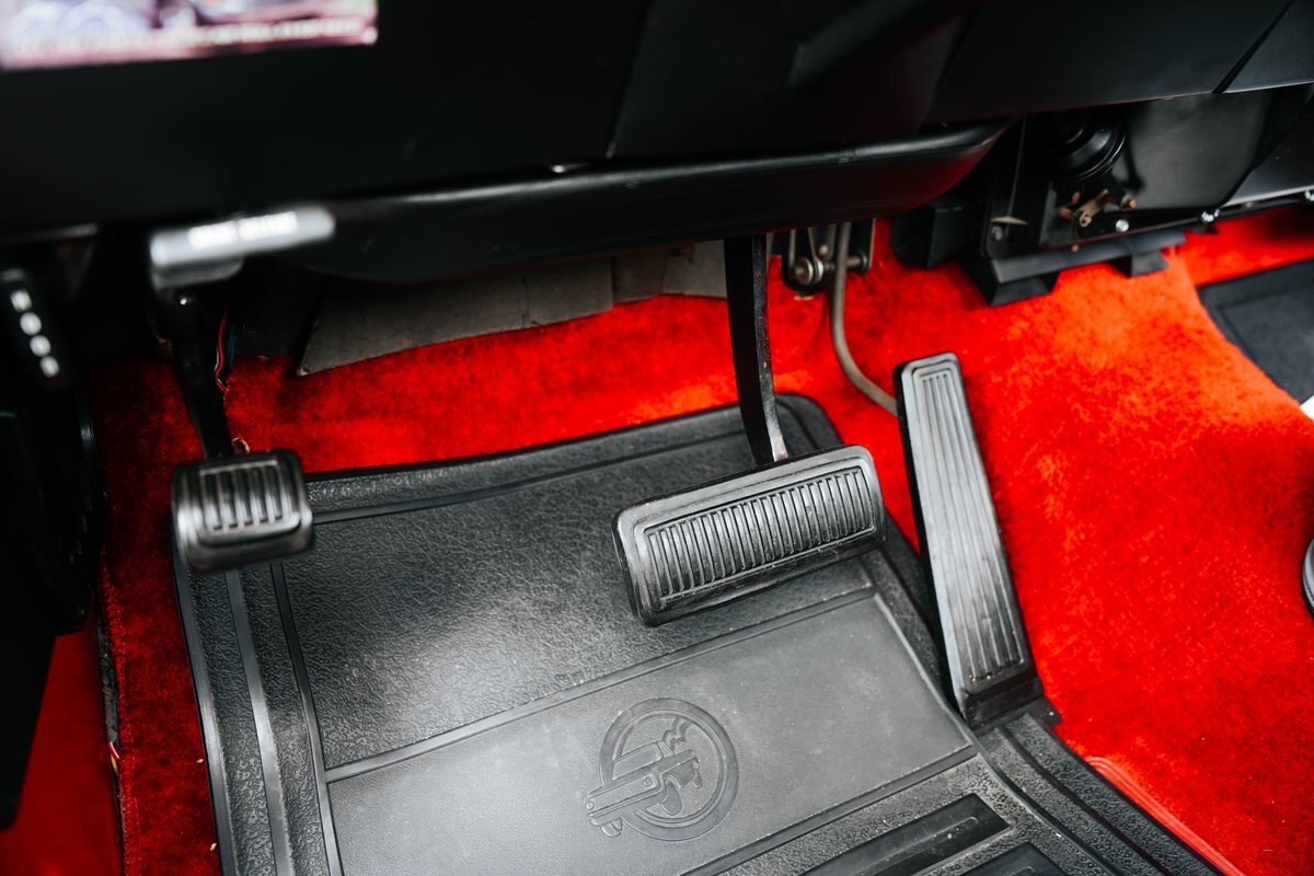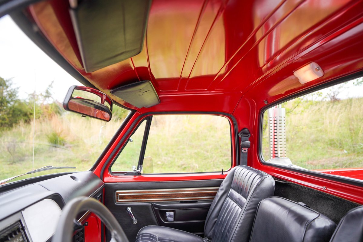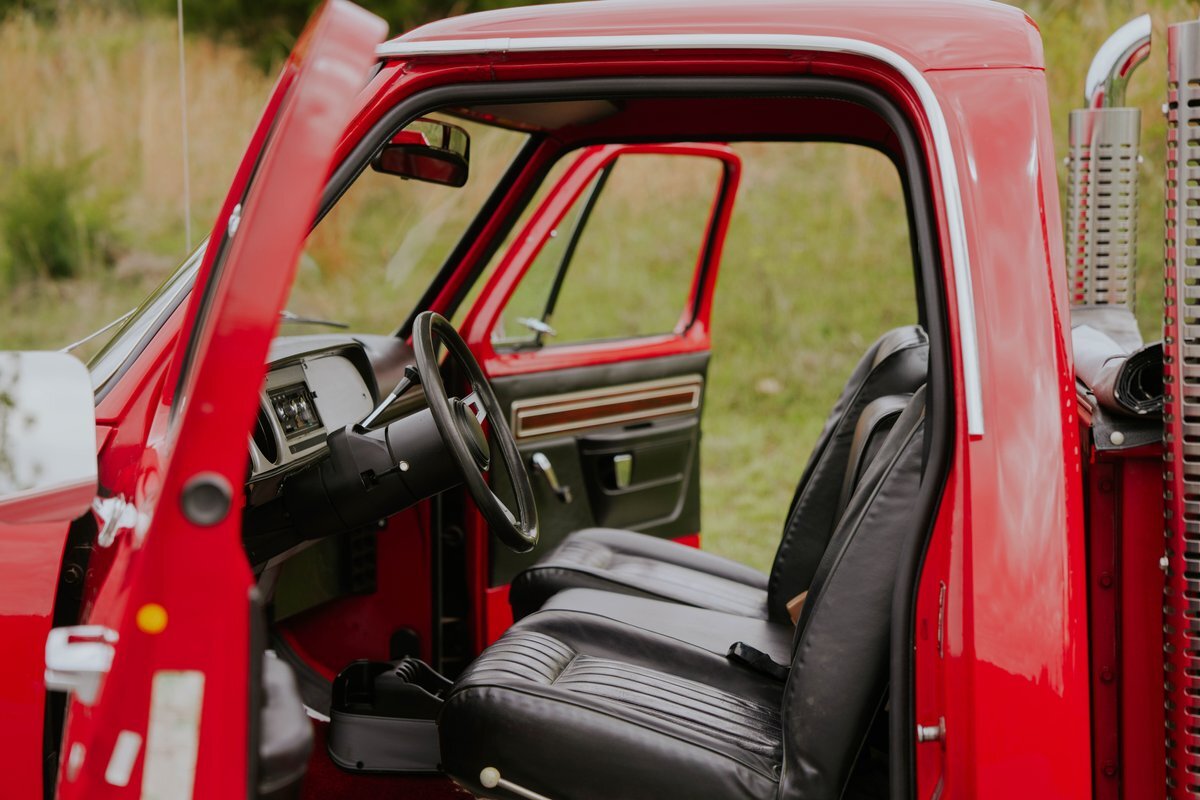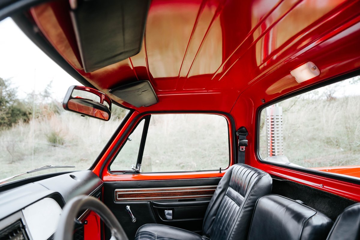 Externally, the Lil Red Express sports a striking full repaint in its signature red color, making it instantly recognizable on the road. The bold red hue is complemented by black vinyl bucket seats with a fold-down armrest, providing both comfort and style.