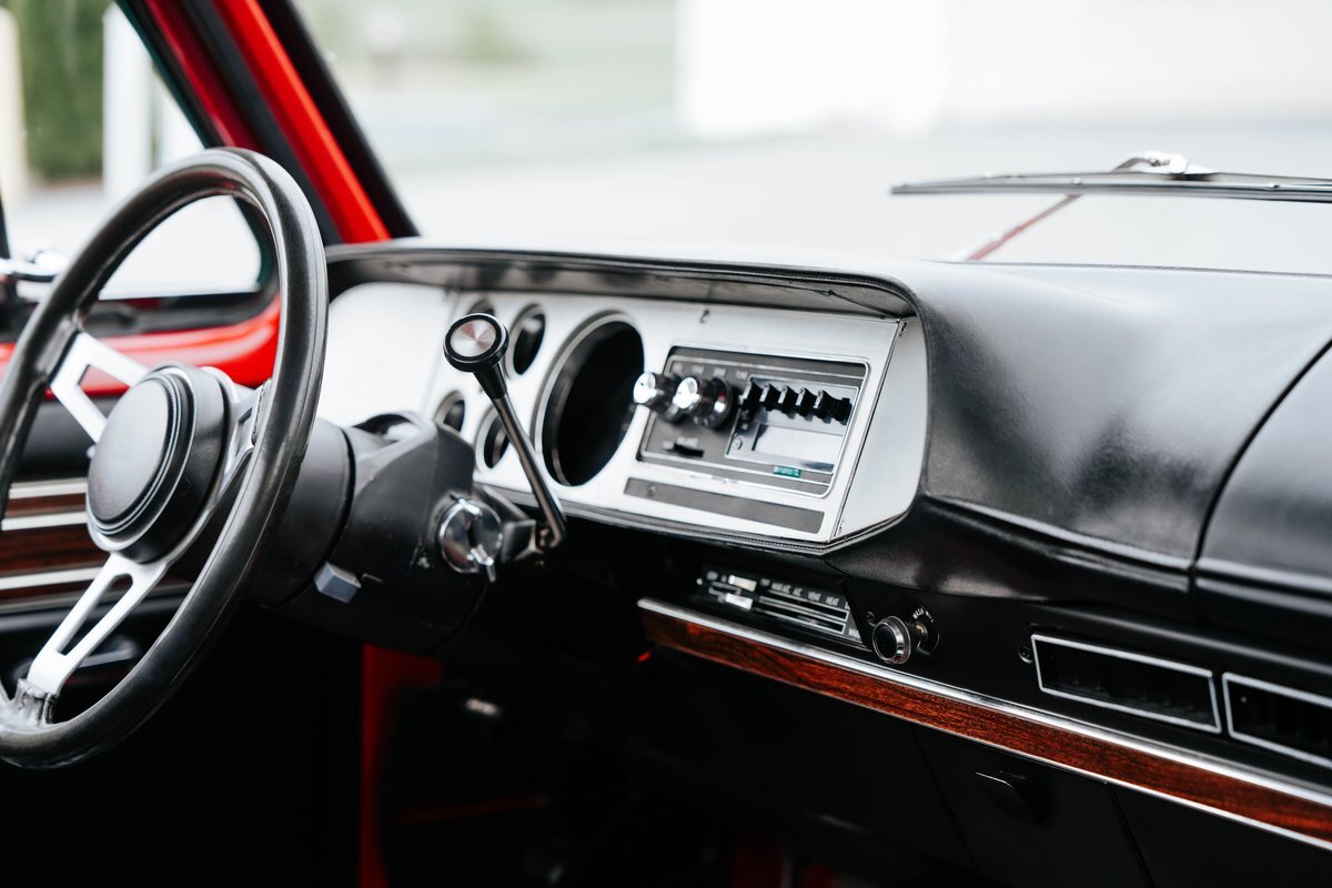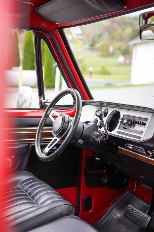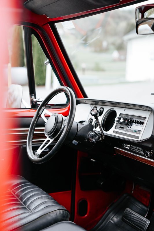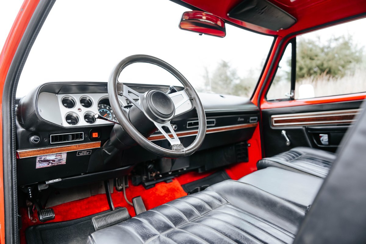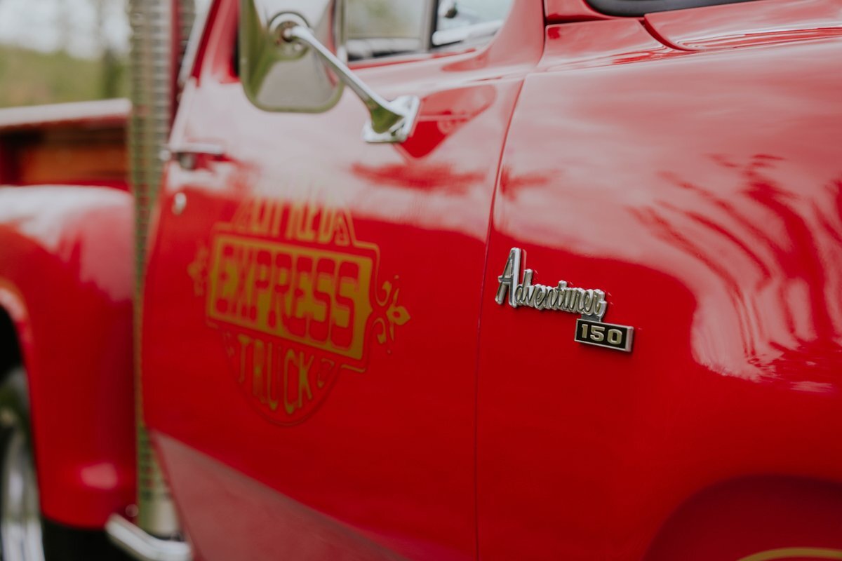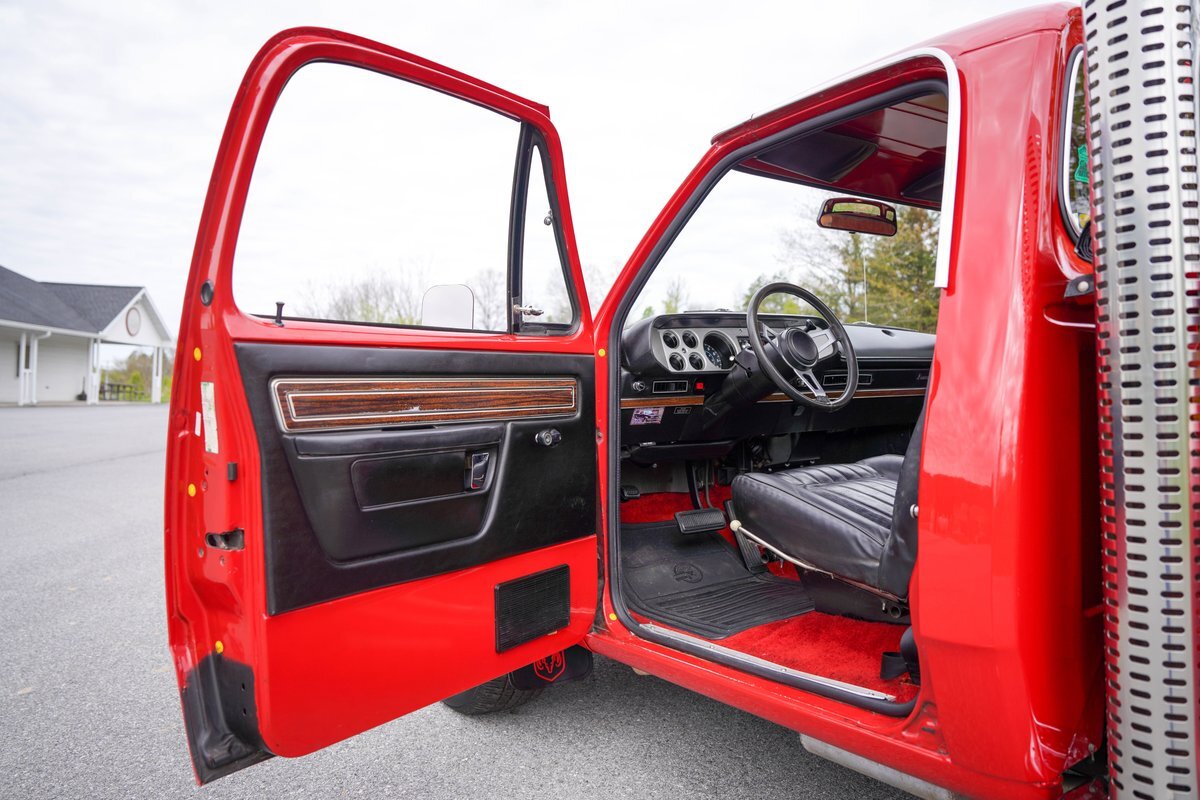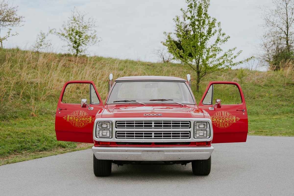 Externally, the Lil Red Express sports a striking full repaint in its signature red color, making it instantly recognizable on the road. The bold red hue is complemented by black vinyl bucket seats with a fold-down armrest, providing both comfort and style.