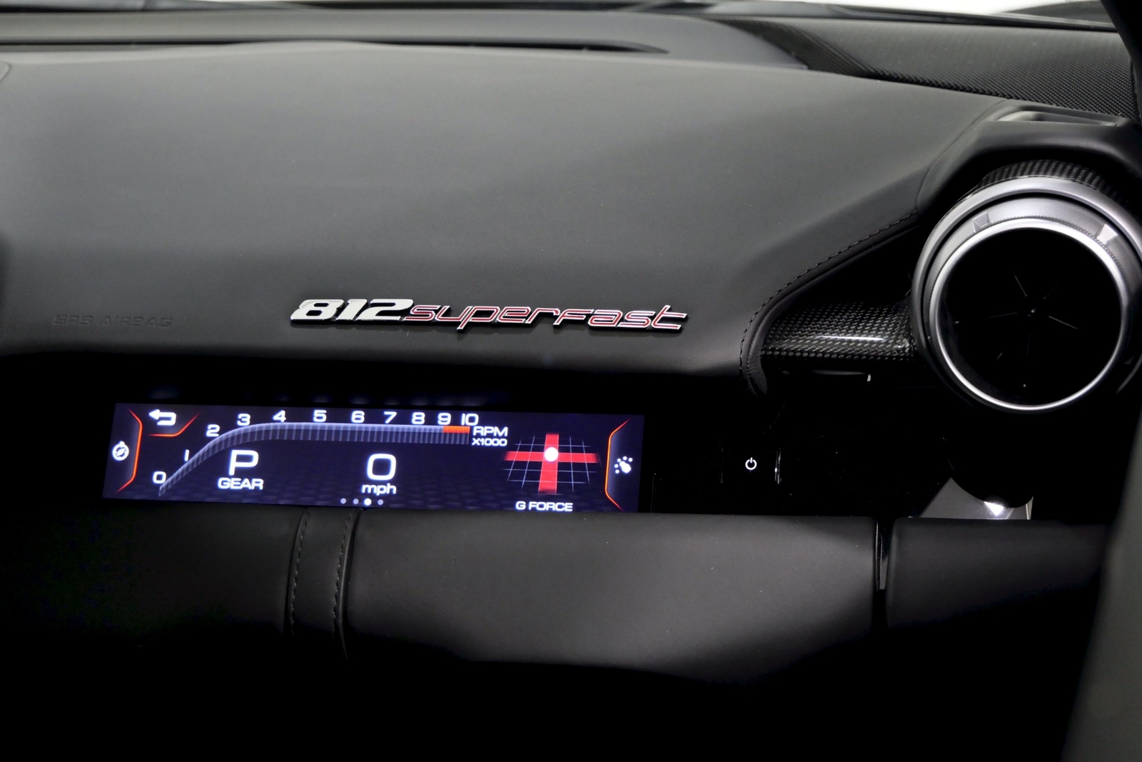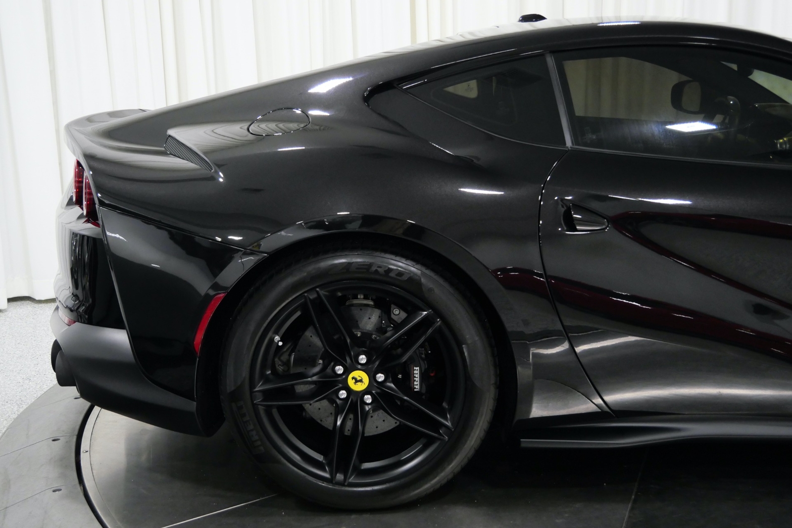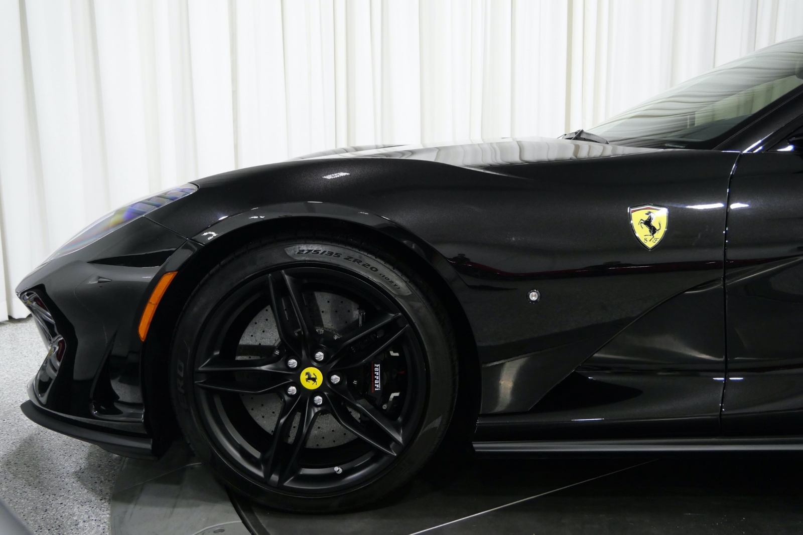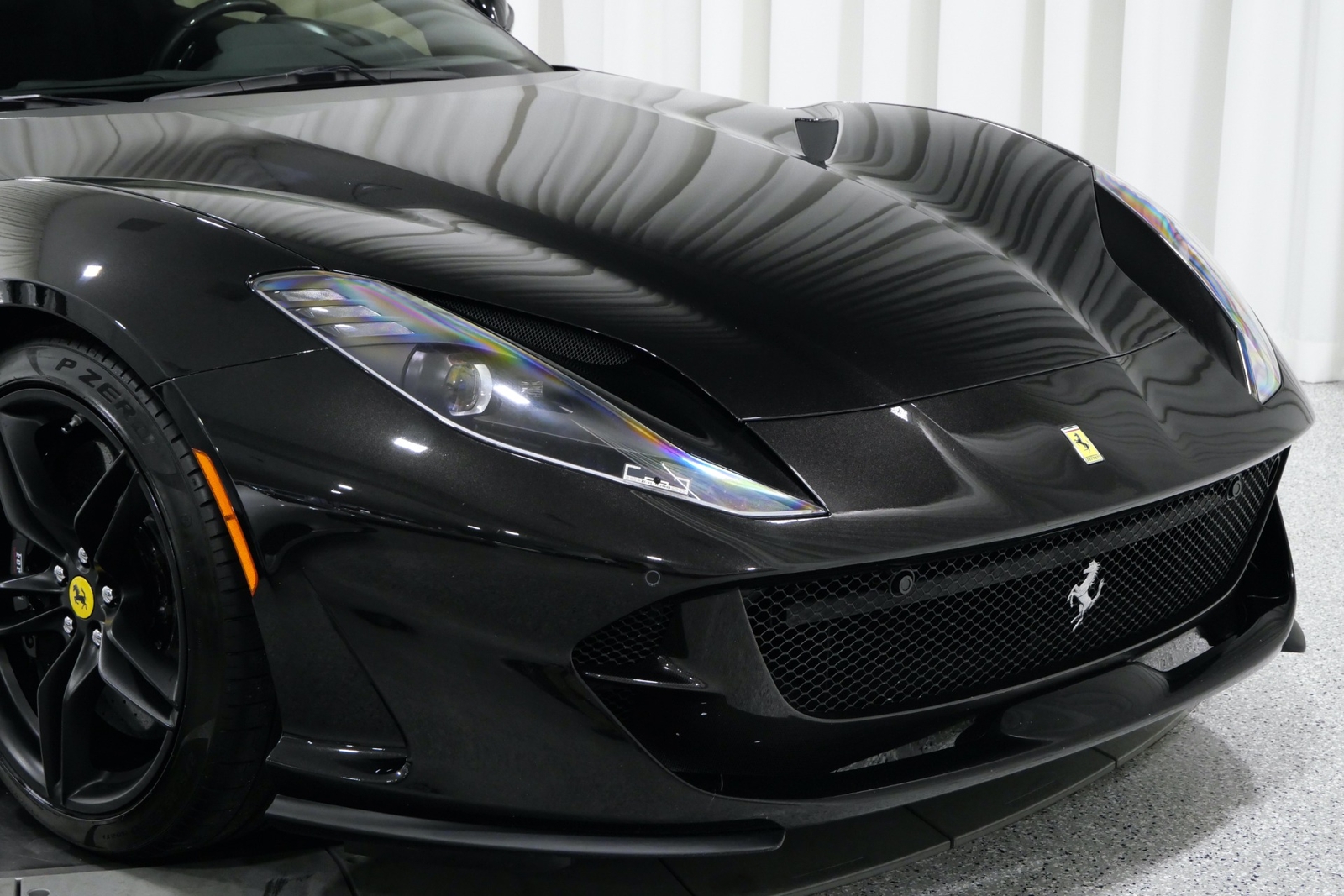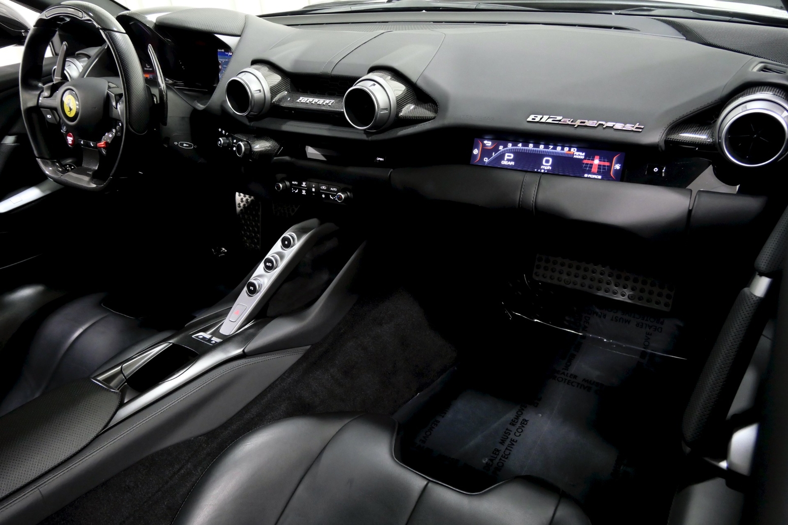 We have just added to our extensive exotic car inventory a beautiful 2019 Ferrari 812 Superfast in Nero Daytona over Nero leather interior and only 9,607 miles. This 812 is loaded with: 6.5 liter V12 with 789 horsepower, 7 speed automatic transmission, 20 inch forged matte black painted wheels, gloss black brake calipers, Scuderia fender shields, black exhaust pipes, carbon fiber front bumper mouth, size large carbon fiber racing seats, racing seat lifter, Cavallino stitched in headrests, carbon fiber and leather steering wheel with LED's, carbon fiber dash inserts, passenger side display, black air vent rings, high power HiFi, Apple CarPlay, adaptive headlights, dedication plate in silver, front and rear parking sensors with rear camera, white rev counter, satellite radio, floor mats, car cover and much more.
