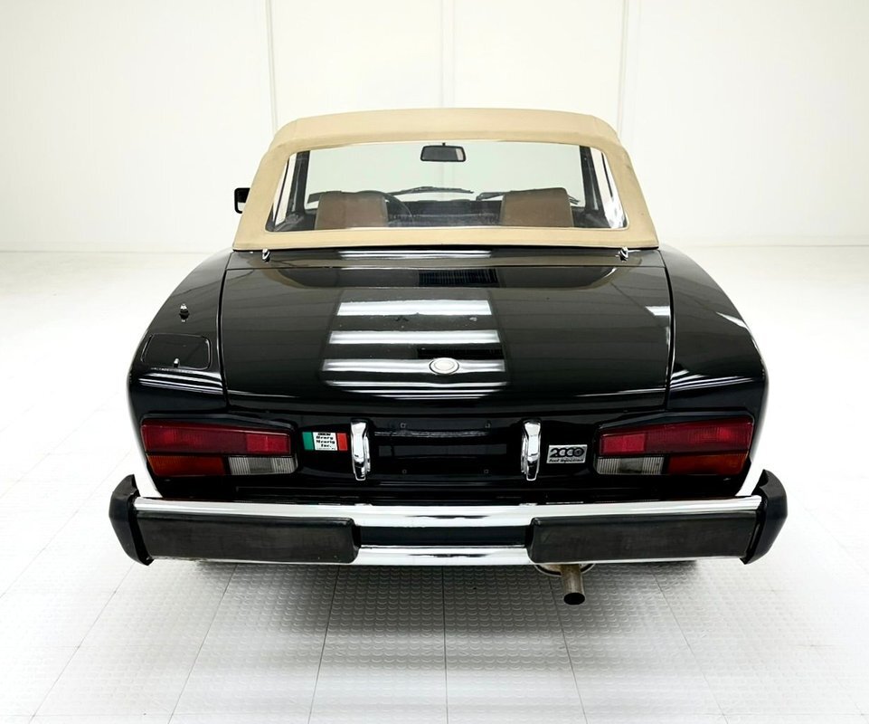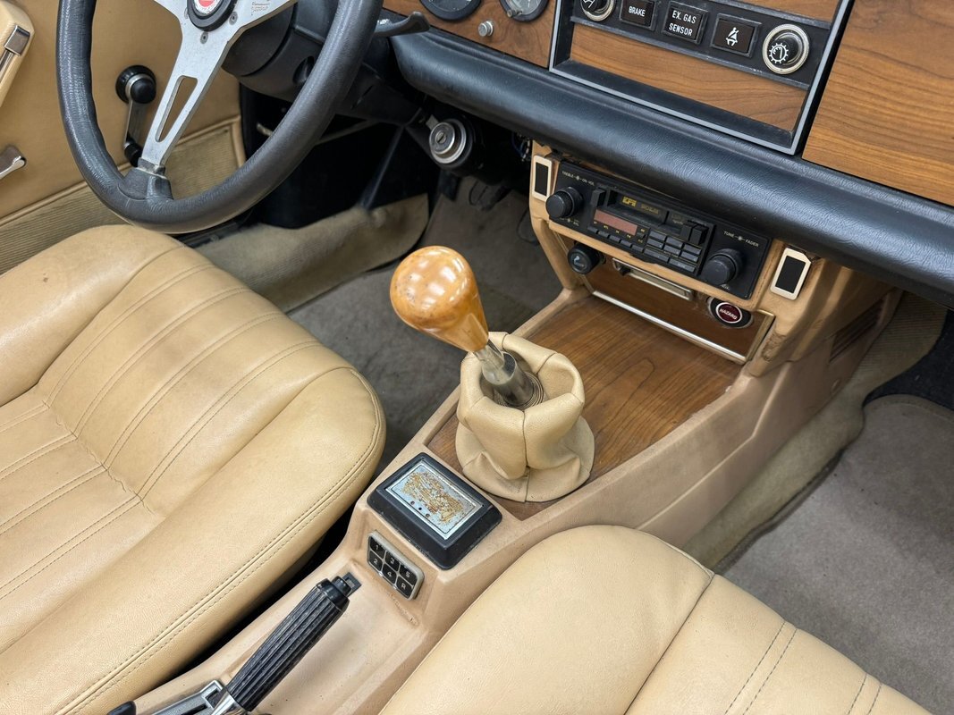 Tan leather might be the best contrasting color for black exteriors, and we're greeted with leather bound door panels in tan with a cap of black. The bucket seats and their stitched pattern are in good condition and also might benefit from a deep cleaning and conditioning. The rear bench is small and picks up on the stitched pattern of the front. The 3 spoke Fiat steering wheel appears to be in good condition and our eyes are drawn to the wood lined dashboard. It's here that black faced gauges take center stage and relay information critical to the sports car driving experience. The center panel contains some control knobs and idiot lights including one that reads "Ex Gas Sensor" which illuminates when an oxygen sensor notes abnormal conditions in the exhaust gas. An AM/FM/Cassette player is located just under this panel followed by a lighter, map light, and hazard light indicator. The wood door on the glove box is in beautiful condition and houses the exotic "Pininfarina Spider 2000" dash plaque. We note two cracks that go from front to back on the dash cover. The floor mounted shifter has a smooth wood knob and tan leather boot, also set in a wood panel. Vent controls flank a parking brake in a plastic base that could use some restoration. The saddle floor covering is fairly dirty as are the protective carpeted mats.