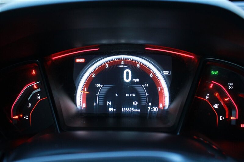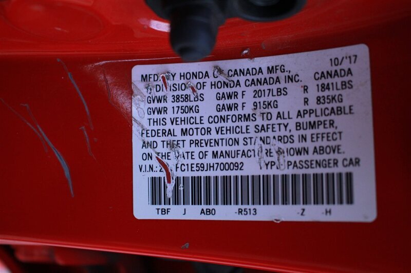 INSTALLED FEATURES: Air filtration, Front air conditioning: automatic climate control, Front air conditioning zones: dual, Rear vents: second row, Airbag deactivation: occupant sensing passenger, Front airbags: dual, Side airbags: front, Side curtain airbags: front / rear, Antenna type: diversity / mast, Auxiliary audio input: Bluetooth / USB / iPod/iPhone, Internet radio app: Pandora, Premium brand, Radio: AM/FM / HD radio / touch screen display, Radio data system, Satellite radio: SiriusXM, Speed sensitive volume control, Subwoofer: 1, Total speakers: 9, Watts: 450, ABS: 4-wheel, Braking assist, Cornering brake control, Electronic brakeforce distribution, Electronic parking brake: auto off, Front brake diameter: 12.3, Front brake type: ventilated disc, Power brakes, Rear brake diameter: 11.1, Rear brake type: disc, Armrests: rear center folding with storage / rear center with cupholders, Dash trim: simulated alloy / simulated carbon fiber, Door trim: simulated alloy, Floor mat material: carpet, Floor material: carpet, Floor mats: front / rear, Foot pedal trim: aluminum, Shift knob trim: aluminum / leather, Steering wheel trim: leather, Assist handle: front / rear, Capless fuel filler system, Cargo area light, Center console: front console with armrest and storage, Courtesy lights: door, Cruise control, Cupholders: front / rear, Multi-function remote: panic alarm / proximity entry system / trunk release, One-touch windows: 2, Power outlet(s): 12V front, Power steering: variable/speed-proportional, Power windows: lockout button, Push-button start, Reading lights: front, Rearview mirror: manual day/night, Steering wheel: tilt and telescopic, Steering wheel mounted controls: audio / cruise control / multi-function / phone, Storage: door pockets / front seatback, Vanity mirrors: dual, Axle ratio: 4.11, Drive mode selector, Limited slip differential: front, Door handle color: body-color, Exhaust tip color: chrome, Front bumper color: body-color, Grille color: black, Mirror color: body-color, Rear bumper color: body-color, Rear spoiler: wing, Rear spoiler color: body-color, Window trim: chrome, Connected in-car apps: Google POIs / Google search, Infotainment: HondaLink, Infotainment screen size: 7 in., Smartphone integration: Android Auto / Apple CarPlay, Clock, Digital odometer, External temperature display, Fuel economy display: MPG / range, Gauge: boost / tachometer, Instrument cluster screen size: 7 in., Multi-function display, Trip odometer, Warnings and reminders: low battery / low fuel level / maintenance due / turn off headlights, Daytime running lights: LED, Front fog lights, Headlights: auto delay off / auto on/off / halogen, Taillights: LED, Side mirror adjustments: manual folding / power, Side mirrors: heated, Moonroof / Sunroof: anti-trapping / one-touch open/close / power glass / sliding sunshade / tilt, Blind spot safety: camera display, Camera system: rear multi-view, Child safety door locks, Child seat anchors: LATCH system, Crumple zones: front, Emergency interior trunk release, Rearview monitor: in dash, Emergency locking retractors: front / rear, Front seatbelts: 3-point, Rear seatbelts: 3-point, Seatbelt force limiters: front, Seatbelt pretensioners: front, Seatbelt warning sensor: front, Driver seat: heated, Driver seat manual adjustments: height / reclining / 6, Front headrests: integrated / 2, Front seat type: sport bucket, Passenger seat: heated, Passenger seat manual adjustments: reclining / 4, Rear headrests: adjustable / 3, Rear seat folding: split, Rear seat type: 60-40 split bench, Upholstery: cloth, Upholstery accents: contrast stitching / embroidered, Anti-theft system: alarm / vehicle immobilizer, Power door locks: anti-lockout / auto-locking, Hill holder control, Stability control, Traction control, Steering ratio: 10.9, Turns lock-to-lock: 2.1, Driver adjustable suspension: ride control, Front shock type: gas, Front spring type: coil, Front stabilizer bar: diameter 27 mm, Front struts: MacPherson, Front suspension classification: independent, Front suspension type: lower control arms, Rear shock type: gas, Rear spring type: coil, Rear stabilizer bar: diameter 18 mm, Rear suspension classification: independent, Rear suspension type: multi-link, Suspension control: electronic, Tuned suspension: sport, Electronic messaging assistance: with read function, Wireless data link: Bluetooth, Spare tire kit: inflator kit / tire sealant, Tire Pressure Monitoring System, Tire type: all season, Wheels: aluminum alloy, Front wipers: variable intermittent, Laminated glass: acoustic windshield, Power windows: safety reverse, Window defogger: rear