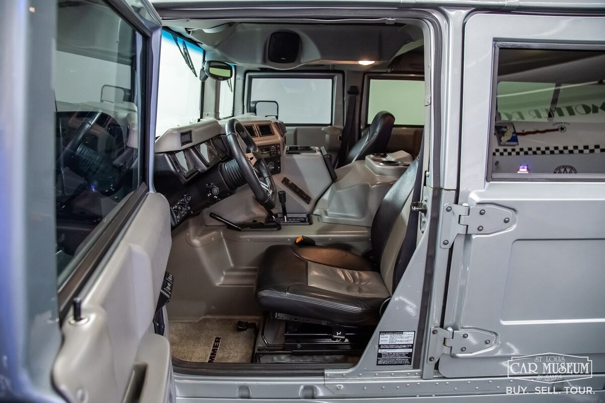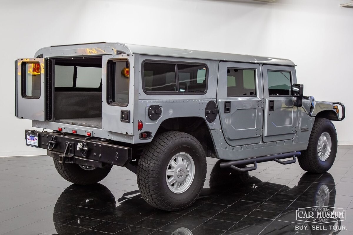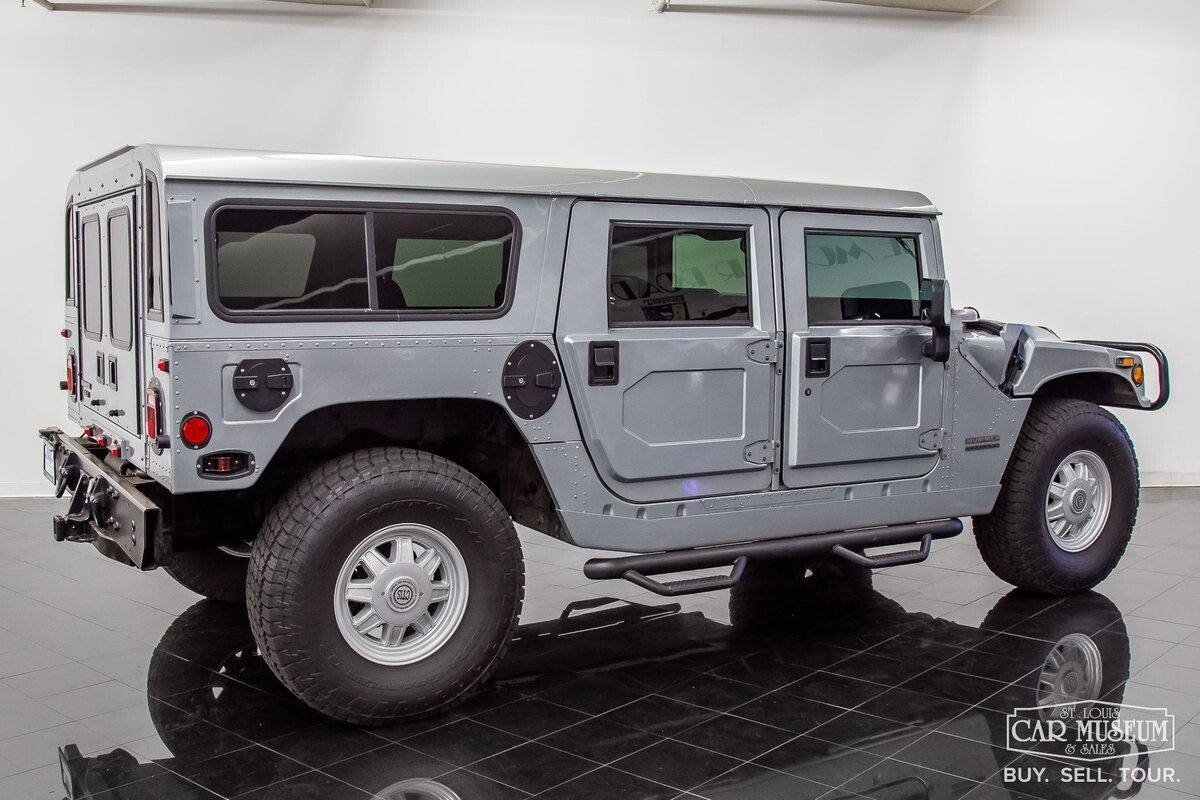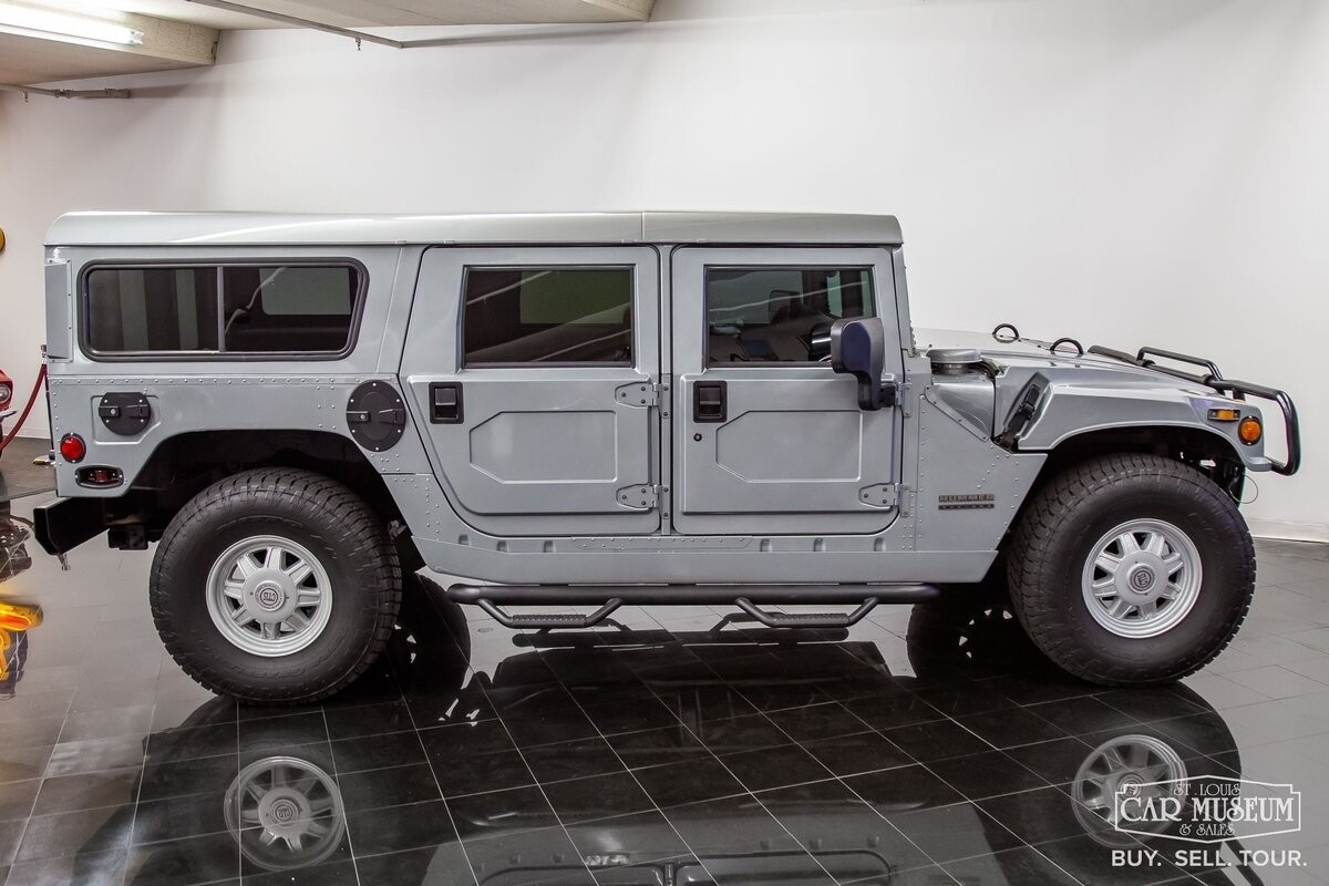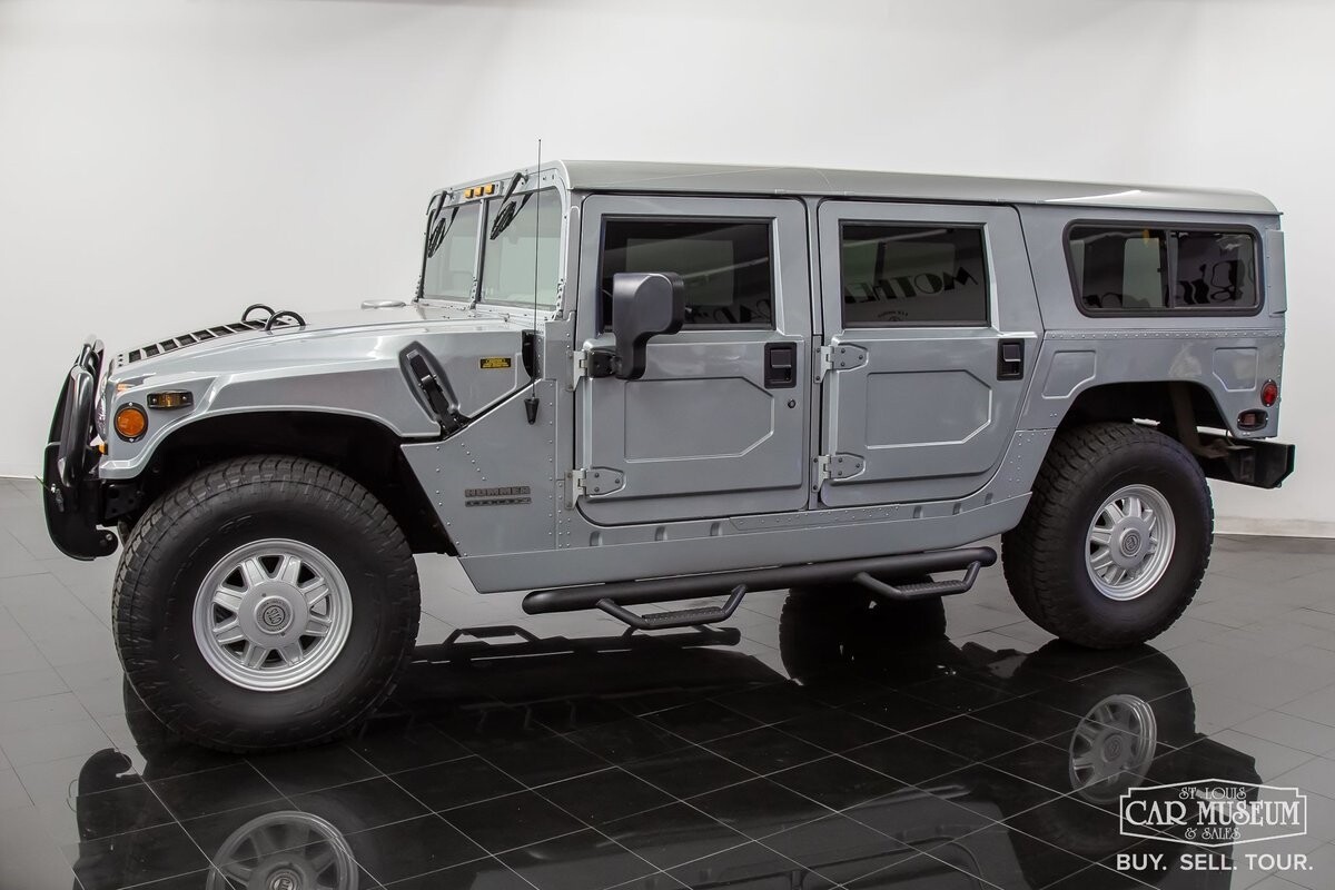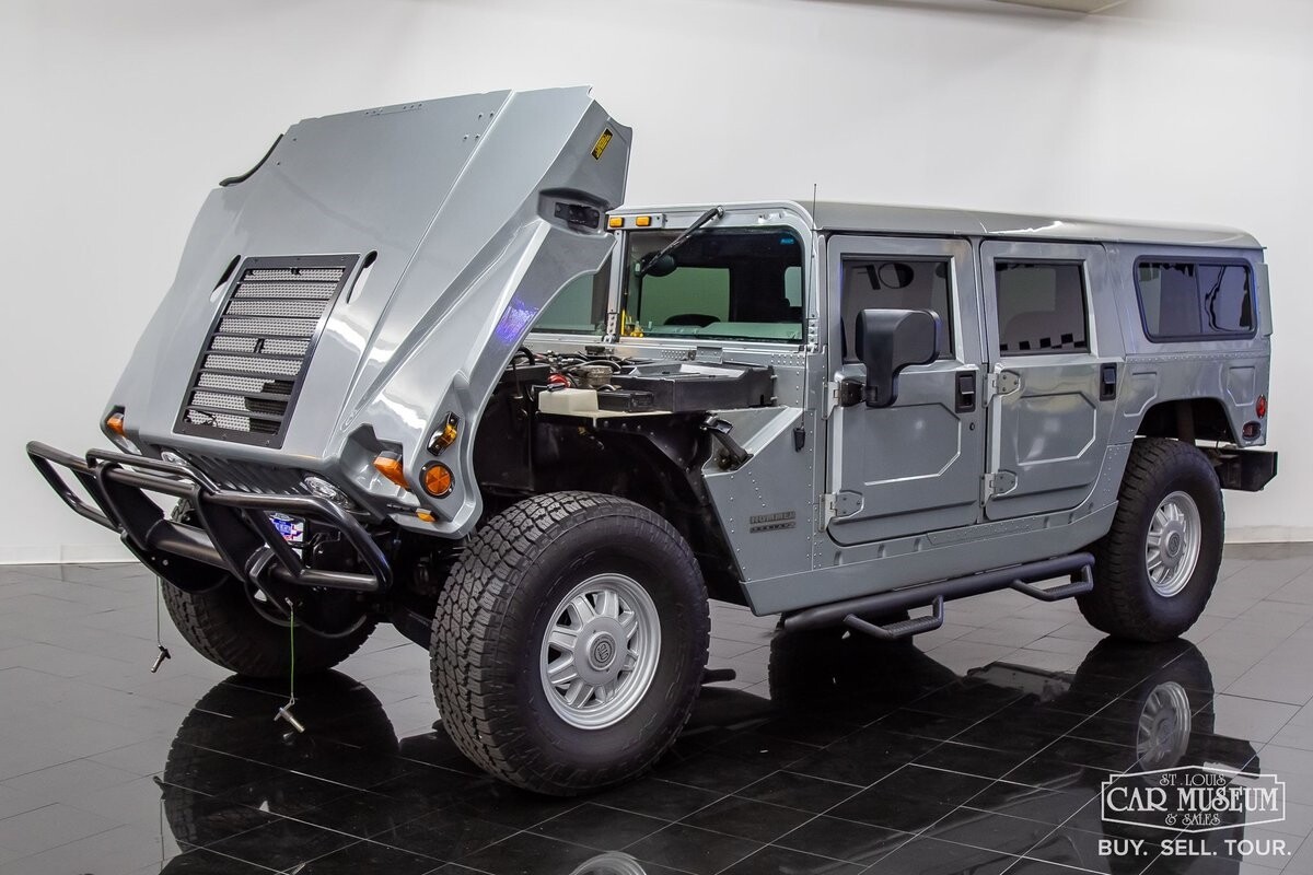 We are very excited to offer this 2001 Hummer H1 4 Passenger Wagon finished in Silver Metallic with a two-tone Gray and Black leather interior. Powering this rugged full-time 4-wheel-drive H1 is a 6.5L Turbo Diesel V8 engine that produces 194 horsepower and 430 lb. ft. of torque mated to a 4-speed automatic transmission with electronic overdrive. These H1 Wagons share most of their components with the original 4-door versions but had an extended roof over the passenger and cargo area. Instead of a tailgate in the rear these Wagons featured side-hinged doors and the last row of windows on the sides were able to slide open.