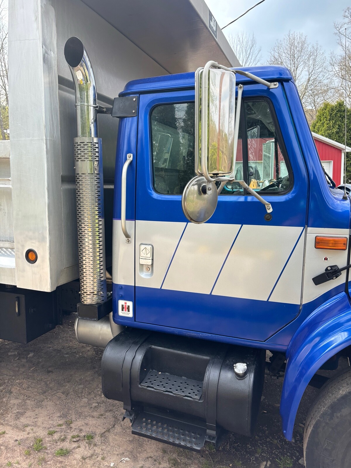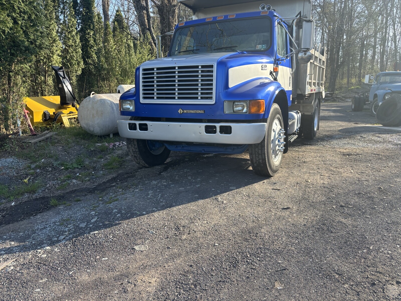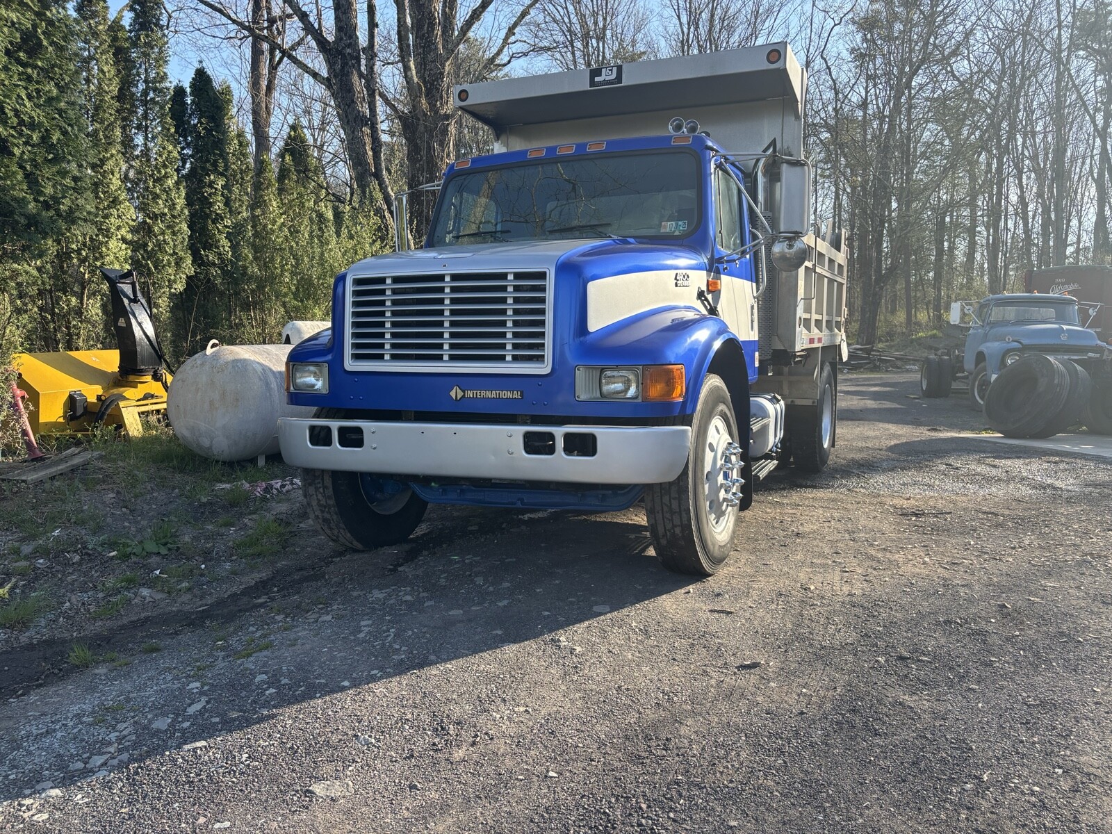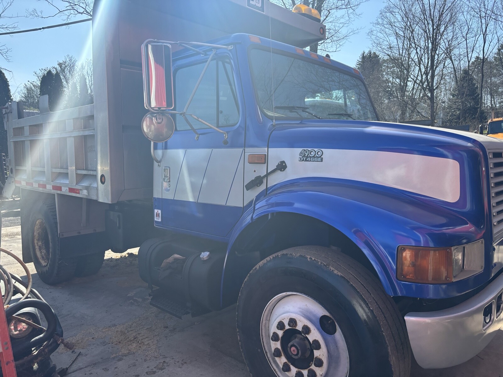 01 international 4900 DT 466 motor rebuilt with 60,000 miles factory international motor seven speed transmission power steering rust free cab 10 foot JNJ aluminum dump body with three asphalt shoots aluminum toolbox New custom two-tone paint job on a rust free cab aluminum wheels, front tires 90% rear tires 75% all brakes are good front end tight new inspection under coated frame all painted underneath front axle painted blue color coated truck is almost restored 1 inch pin plate with receiver and hitch with de rings Air seat does not have air conditioning custom duel exhaust with chrome stacks,has fall down ladder on driver side to get in box very sharp truck