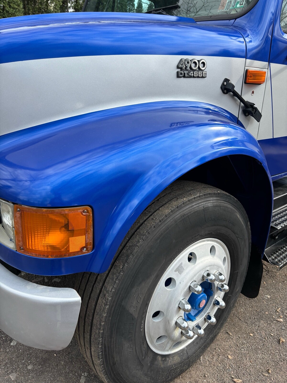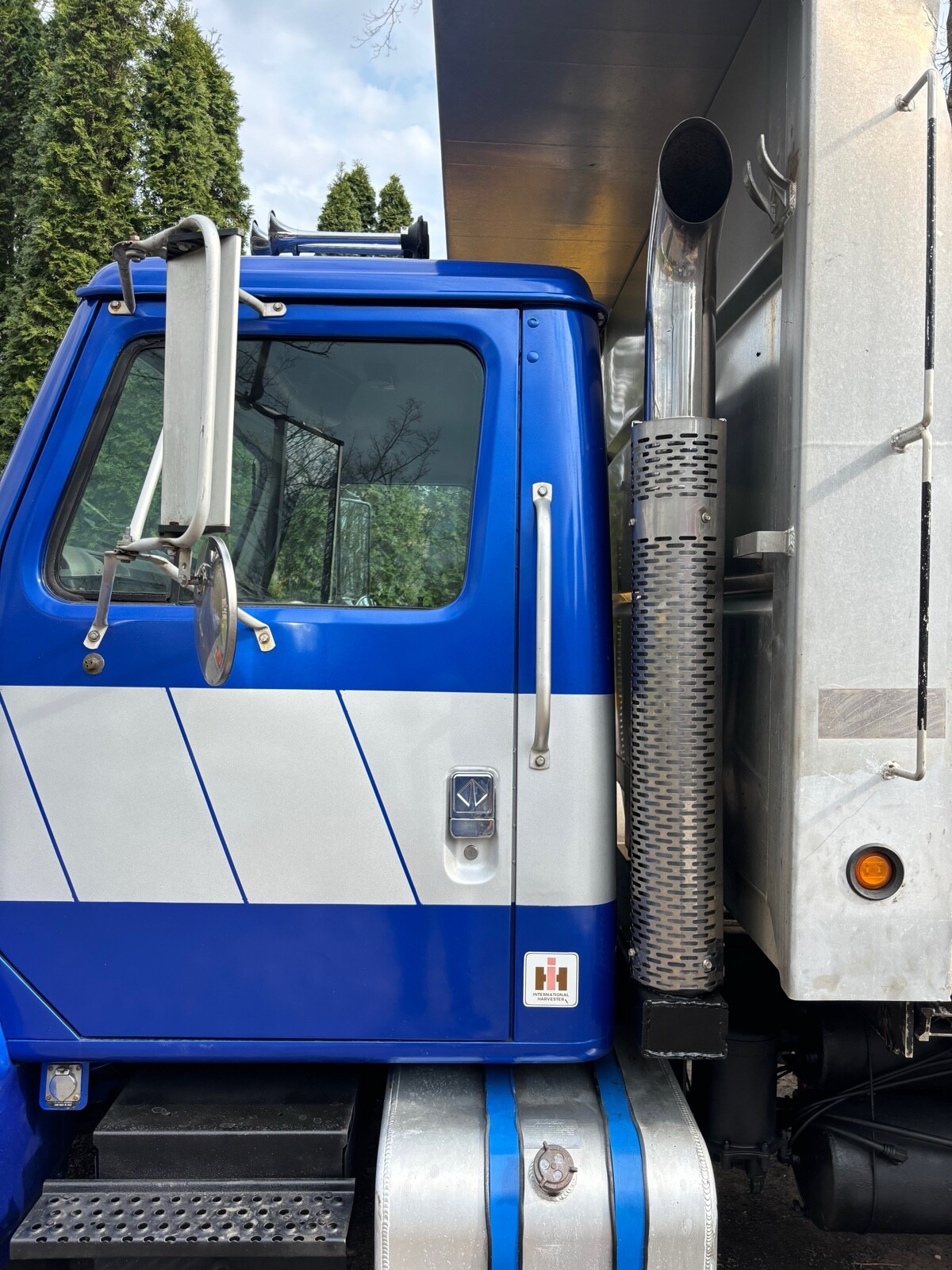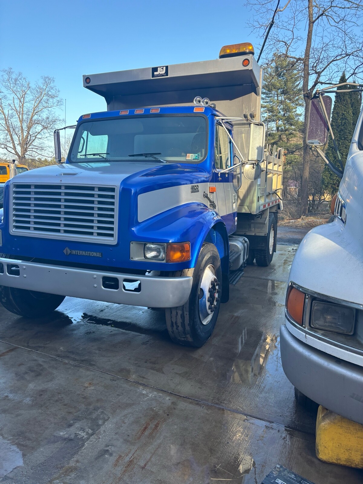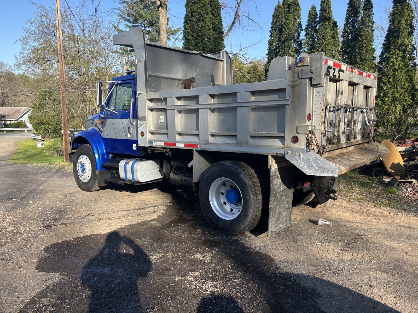 01 international 4900 DT 466 motor rebuilt with 60,000 miles factory international motor seven speed transmission power steering rust free cab 10 foot JNJ aluminum dump body with three asphalt shoots aluminum toolbox New custom two-tone paint job on a rust free cab aluminum wheels, front tires 90% rear tires 75% all brakes are good front end tight new inspection under coated frame all painted underneath front axle painted blue color coated truck is almost restored 1 inch pin plate with receiver and hitch with de rings Air seat does not have air conditioning custom duel exhaust with chrome stacks,has fall down ladder on driver side to get in box very sharp truck