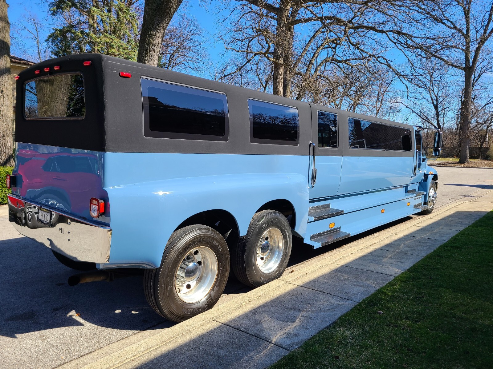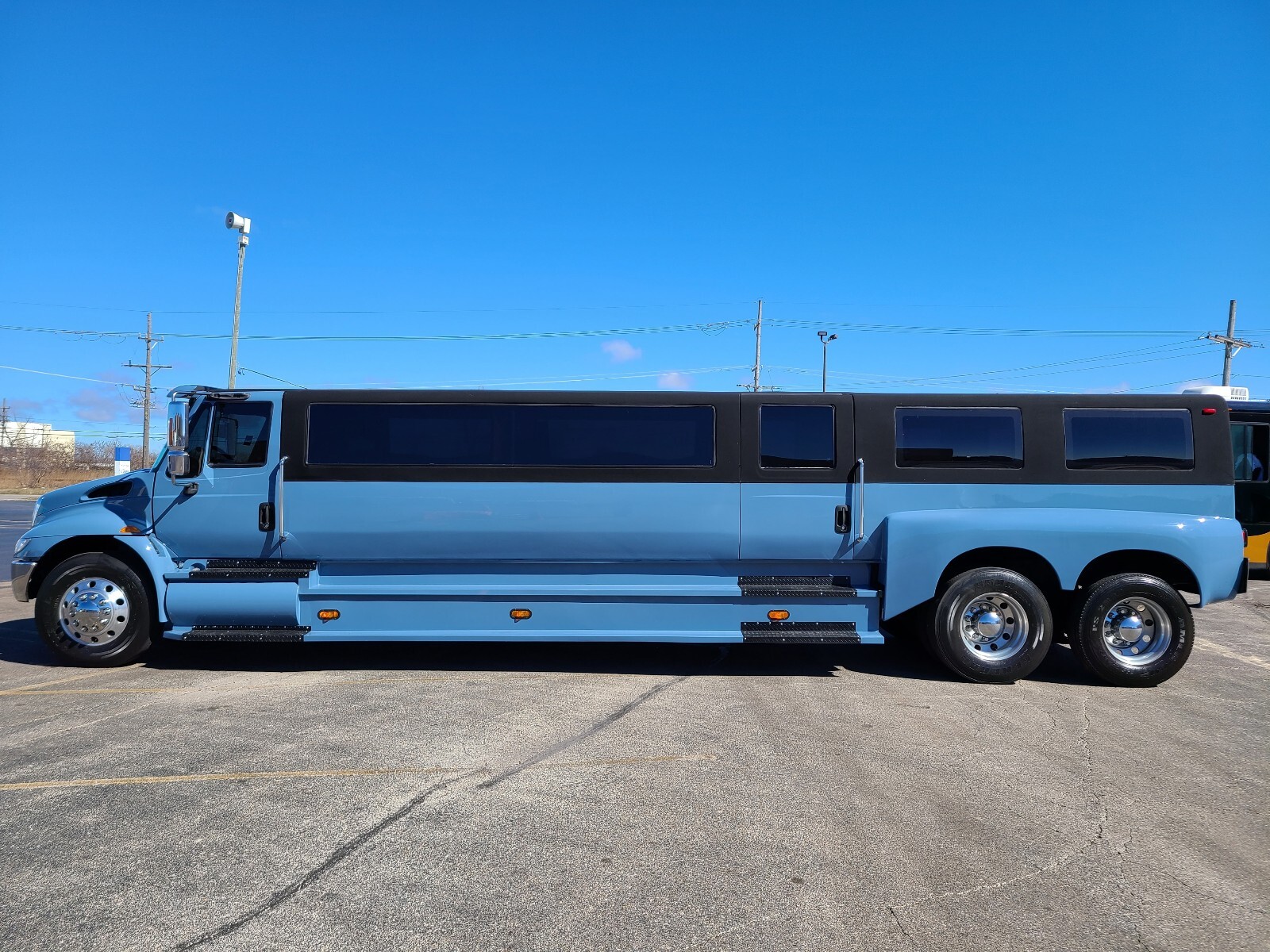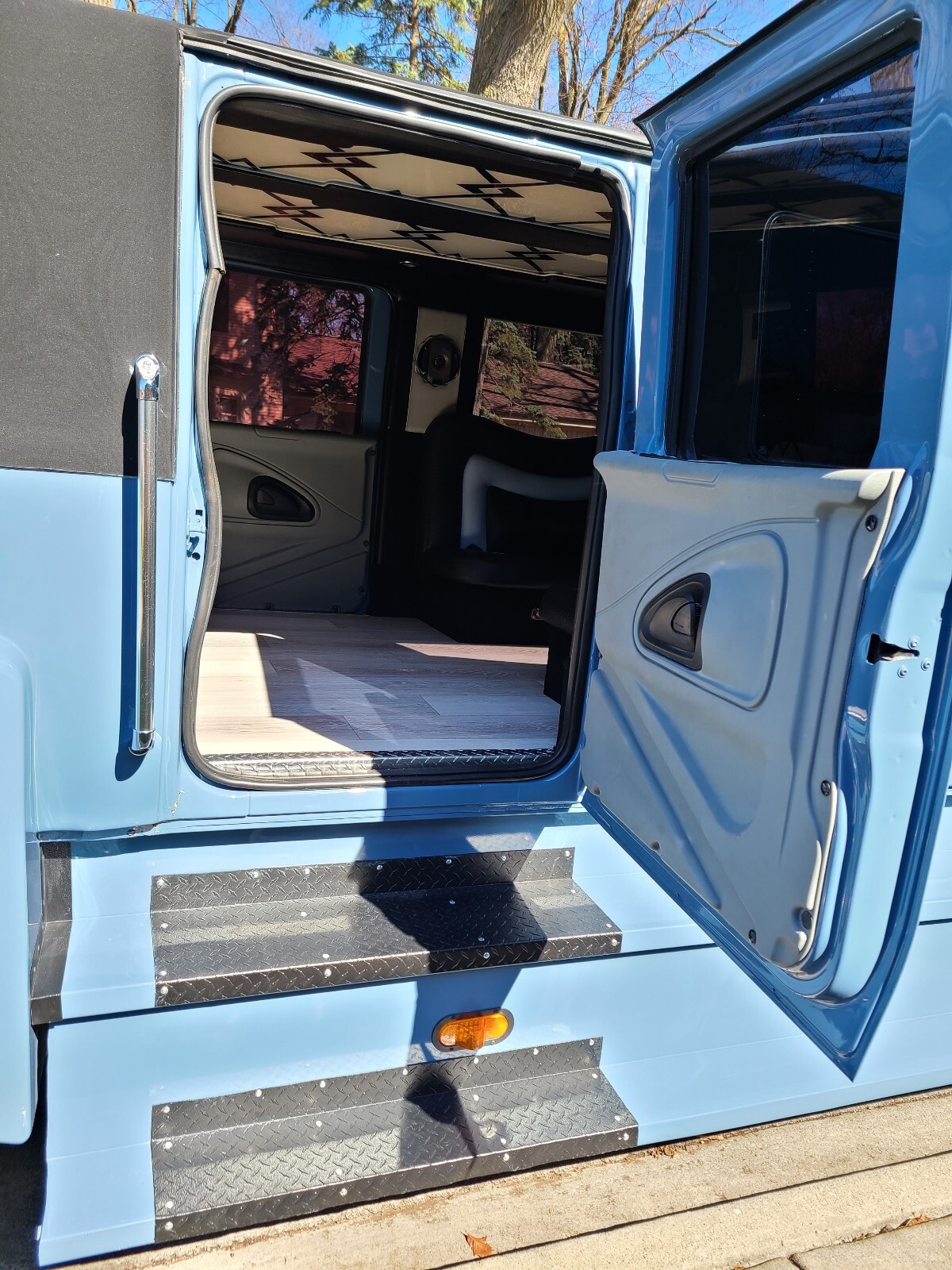 This bus is a dream long list of recent upgrades including a completely new paint job & interior to match the 2023 Mercades G wagon AMG 63 periwinkle blue ?