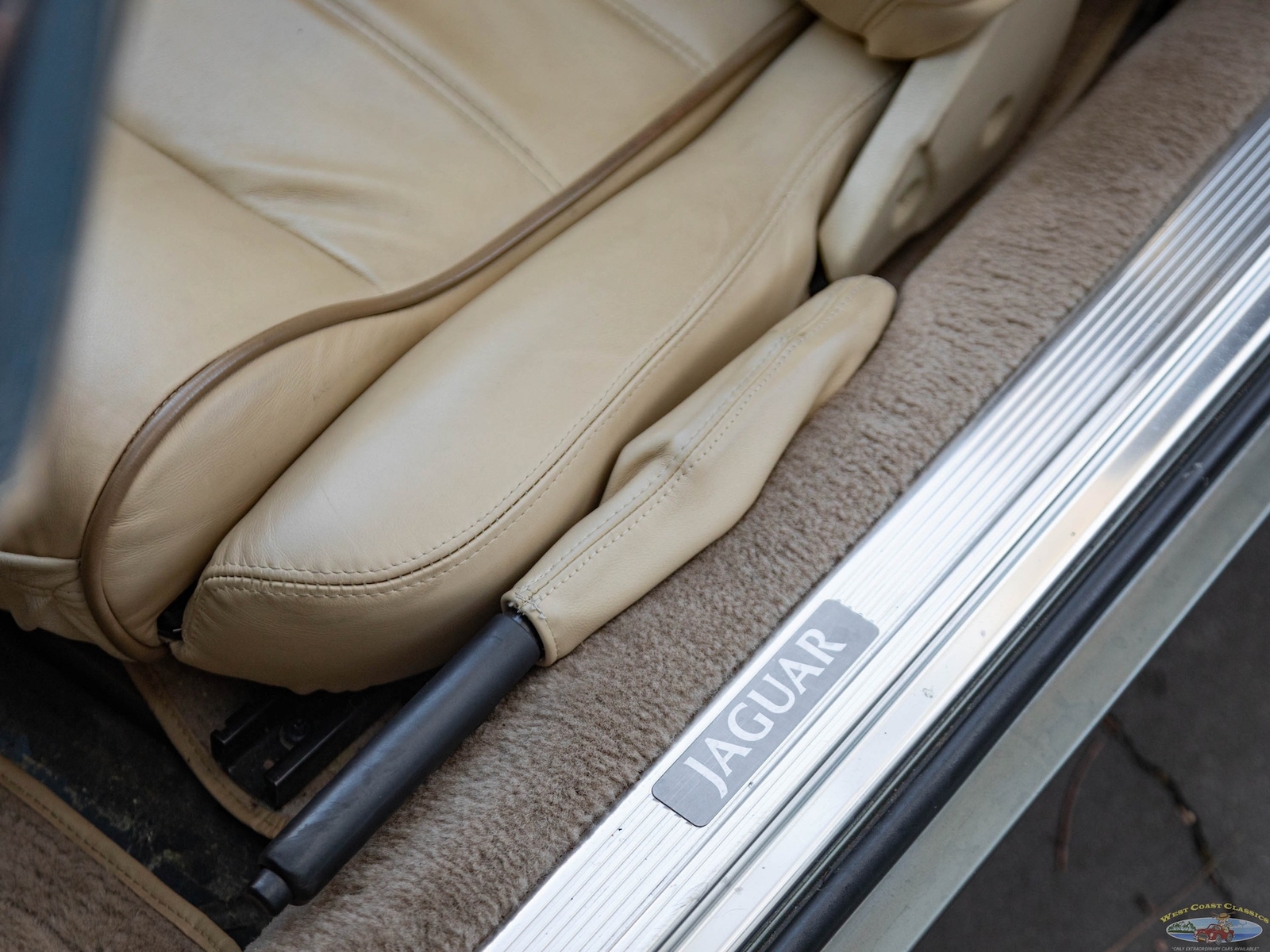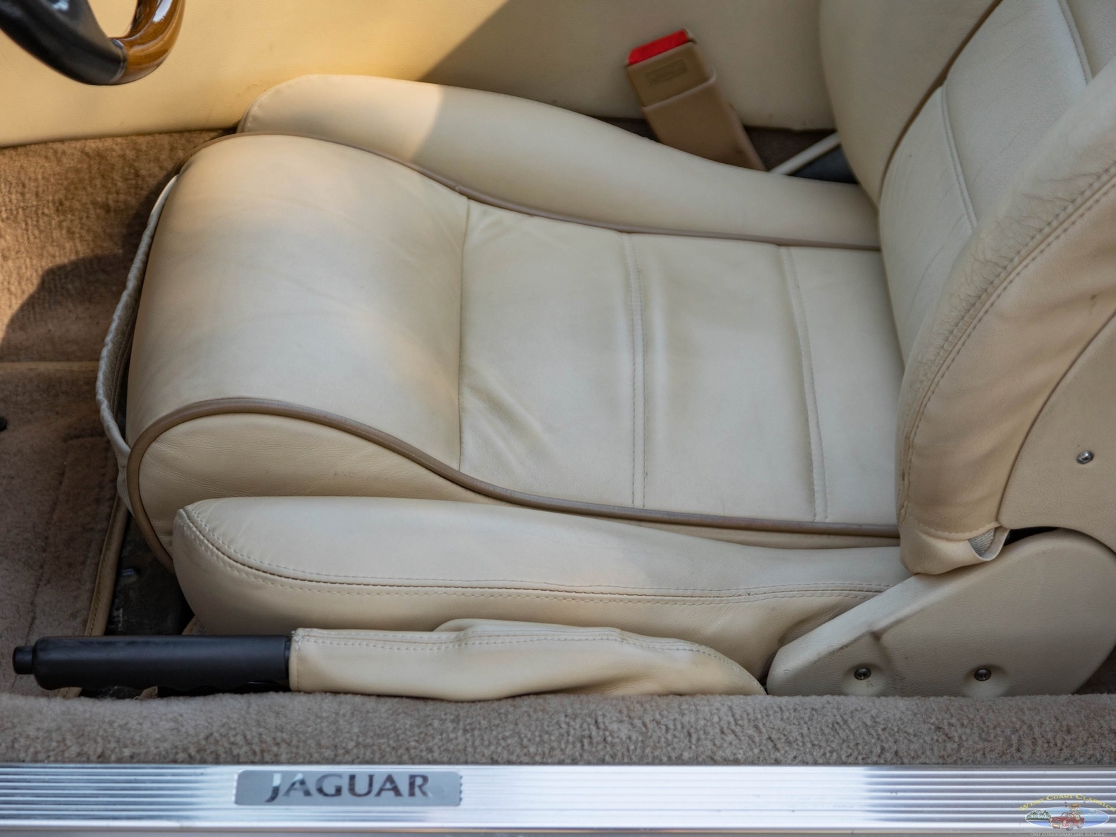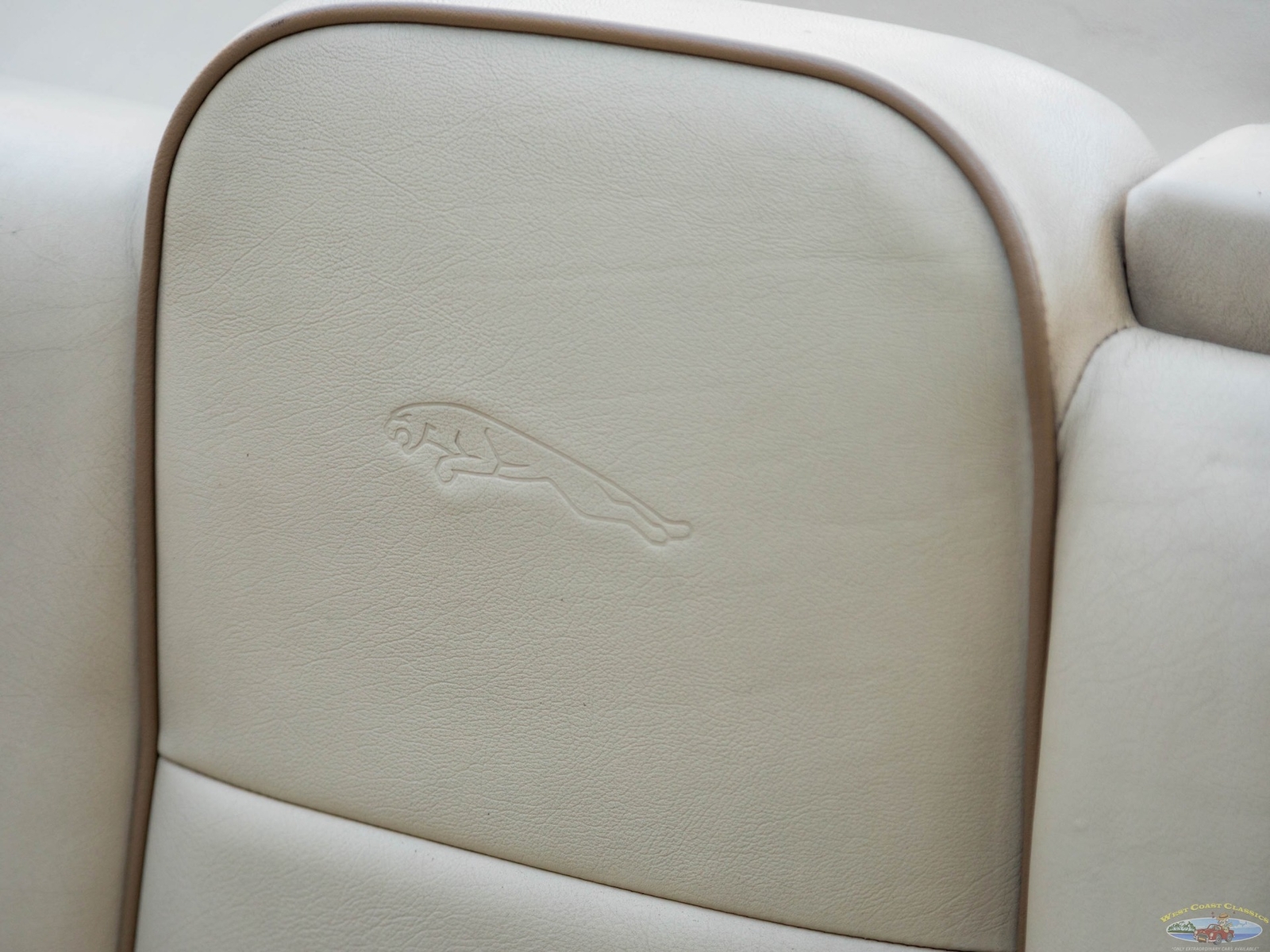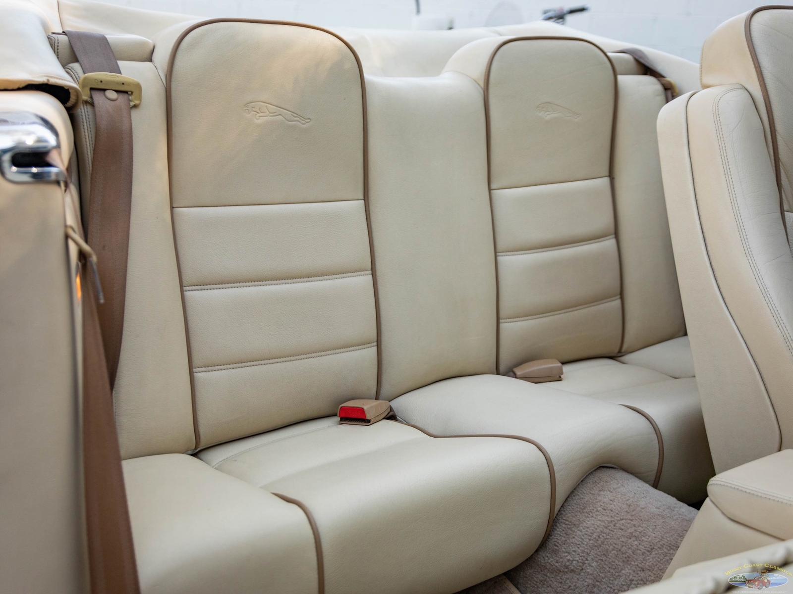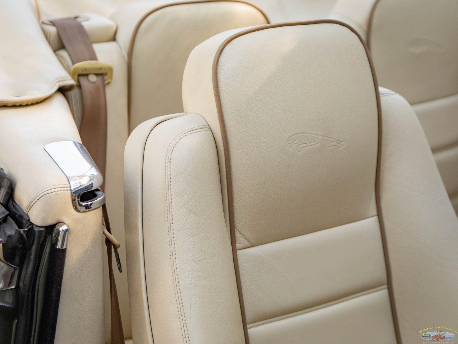 The original factory and very striking 'Jade Green' color paint is in stunning condition and the original 'Cream' color leather seats with 'Light' piping is also in outstanding condition with virtually no signs of any wear and there are no flaws in the dashboard or the walnut veneer, the door panels or the carpets. The soft top is also in exceptional and all original condition. The interior is also completely original with it's 'Jaguar' radio/cassette stereo system with a CD changer in the trunk and all the options and gauges are working as they should including the ice-cold air conditioning!