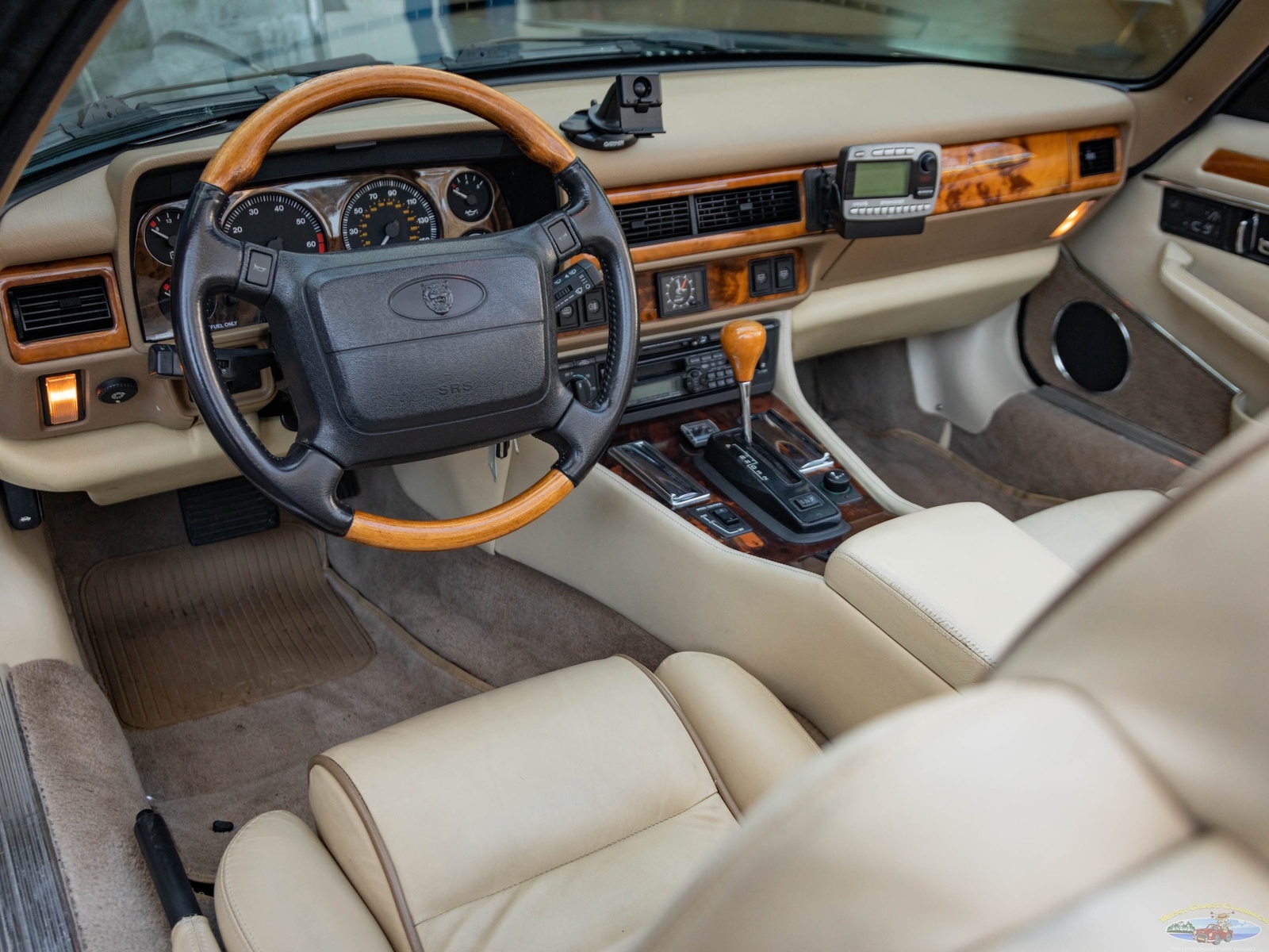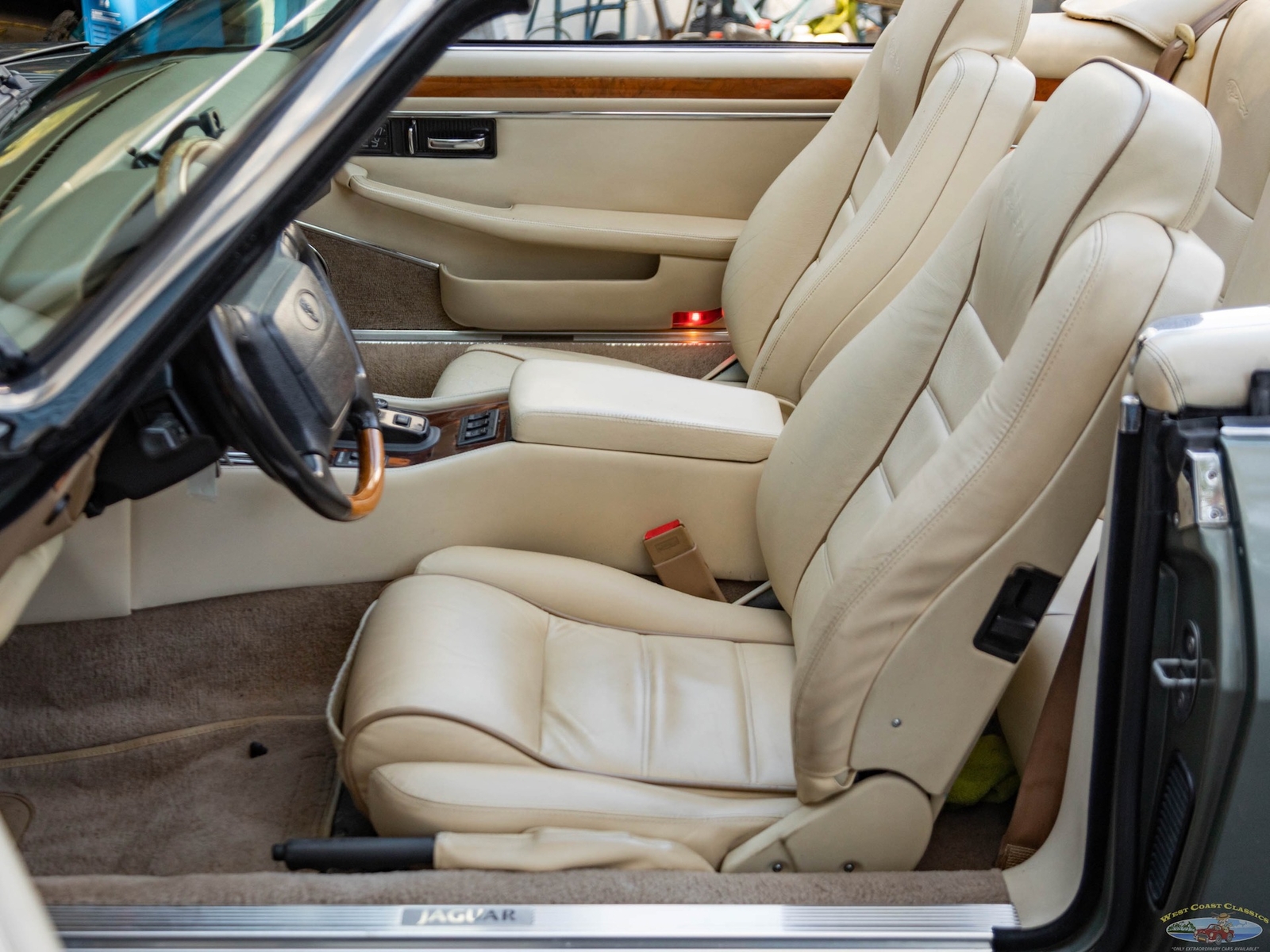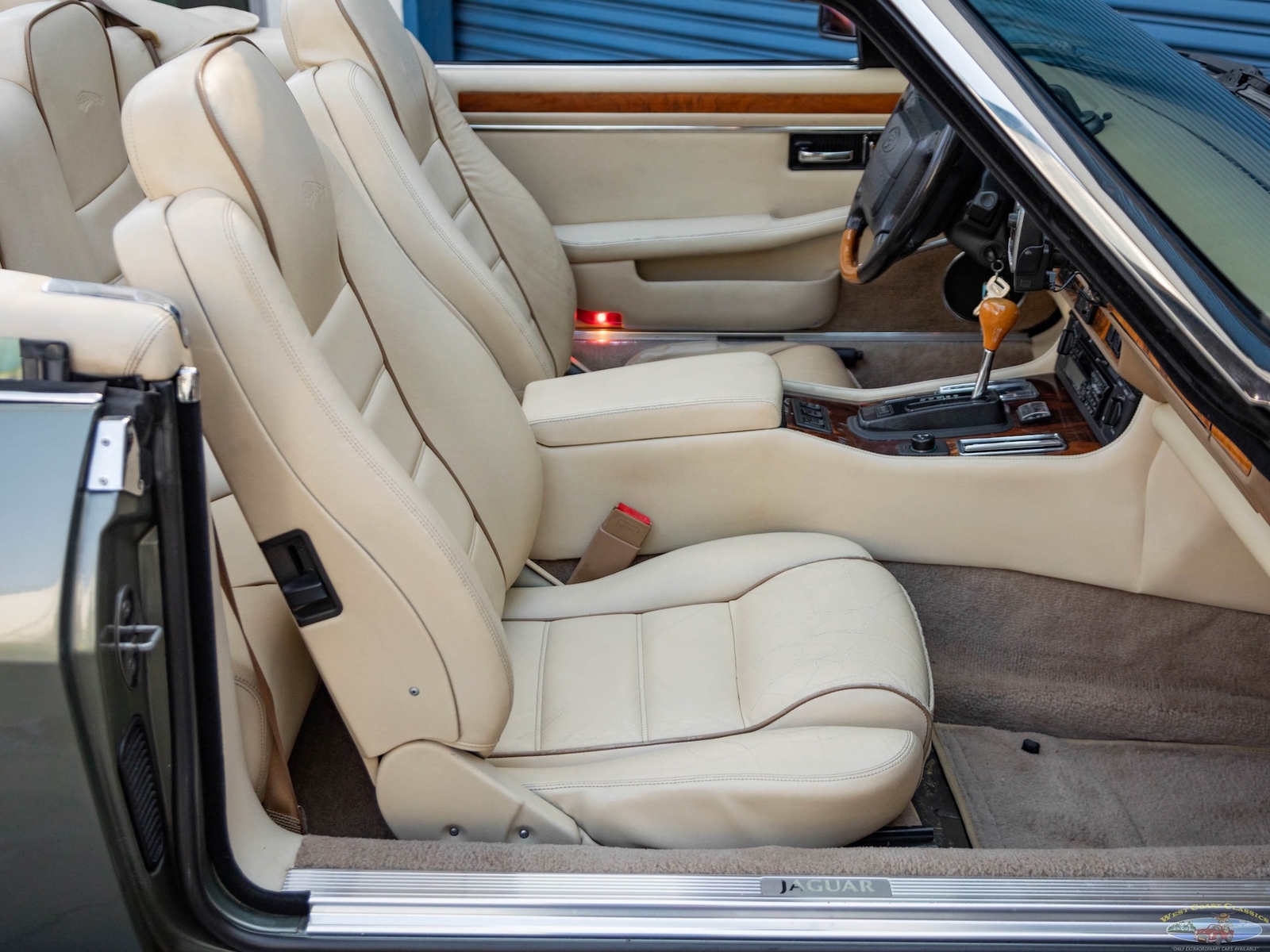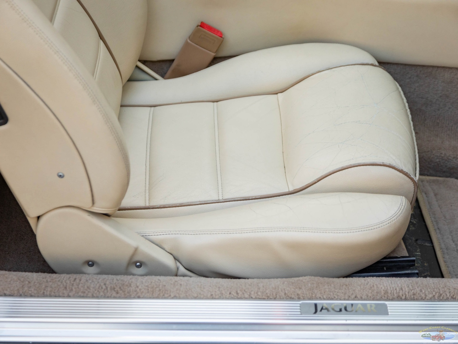 The original factory and very striking 'Jade Green' color paint is in stunning condition and the original 'Cream' color leather seats with 'Light' piping is also in outstanding condition with virtually no signs of any wear and there are no flaws in the dashboard or the walnut veneer, the door panels or the carpets. The soft top is also in exceptional and all original condition. The interior is also completely original with it's 'Jaguar' radio/cassette stereo system with a CD changer in the trunk and all the options and gauges are working as they should including the ice-cold air conditioning!
