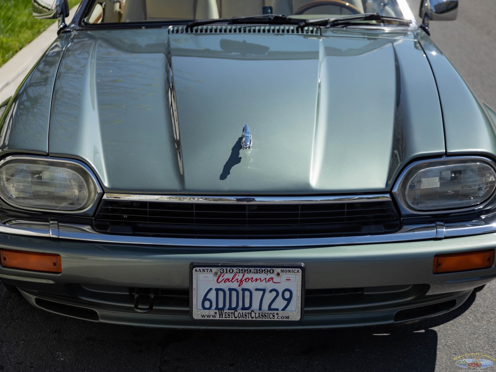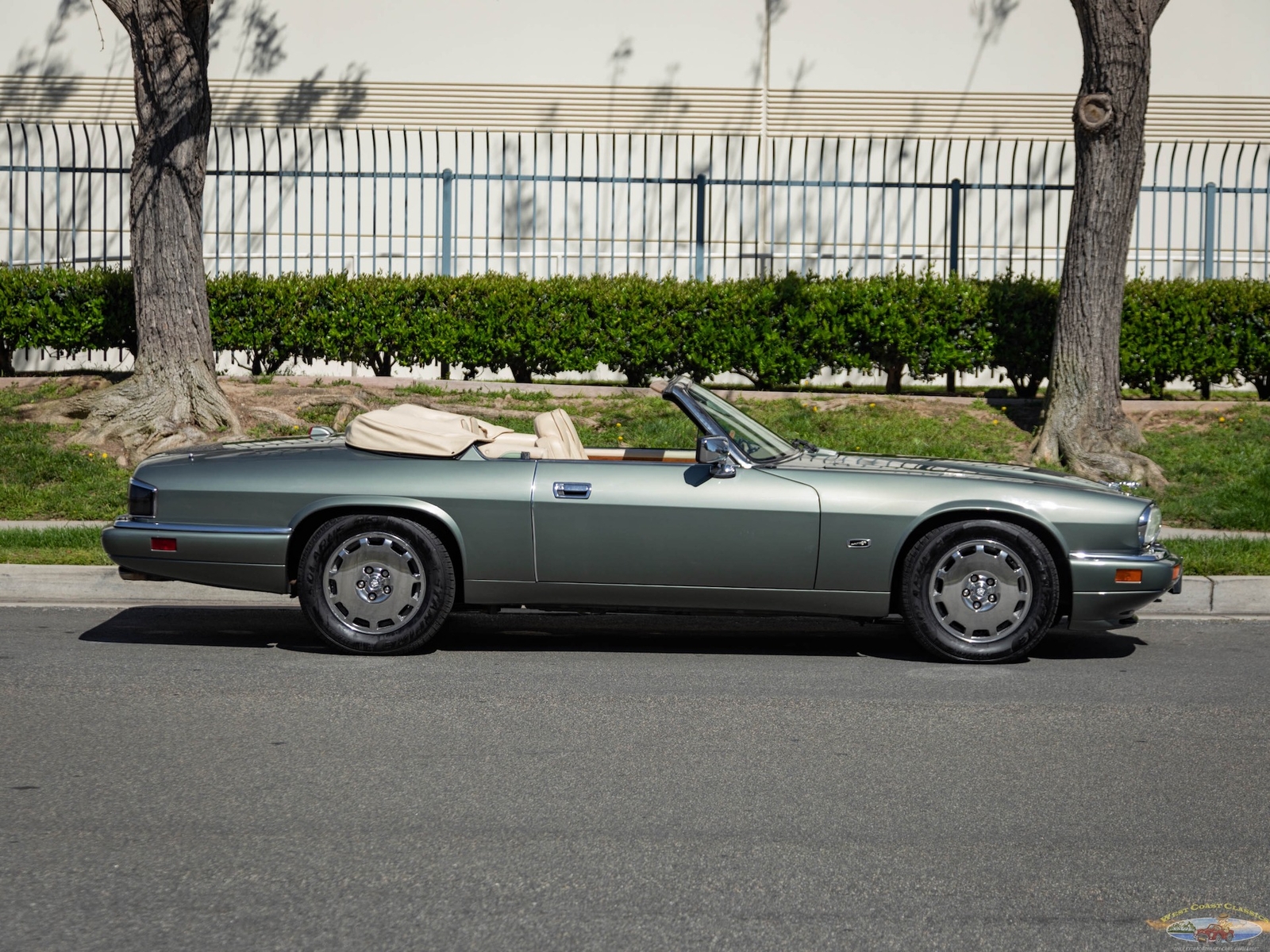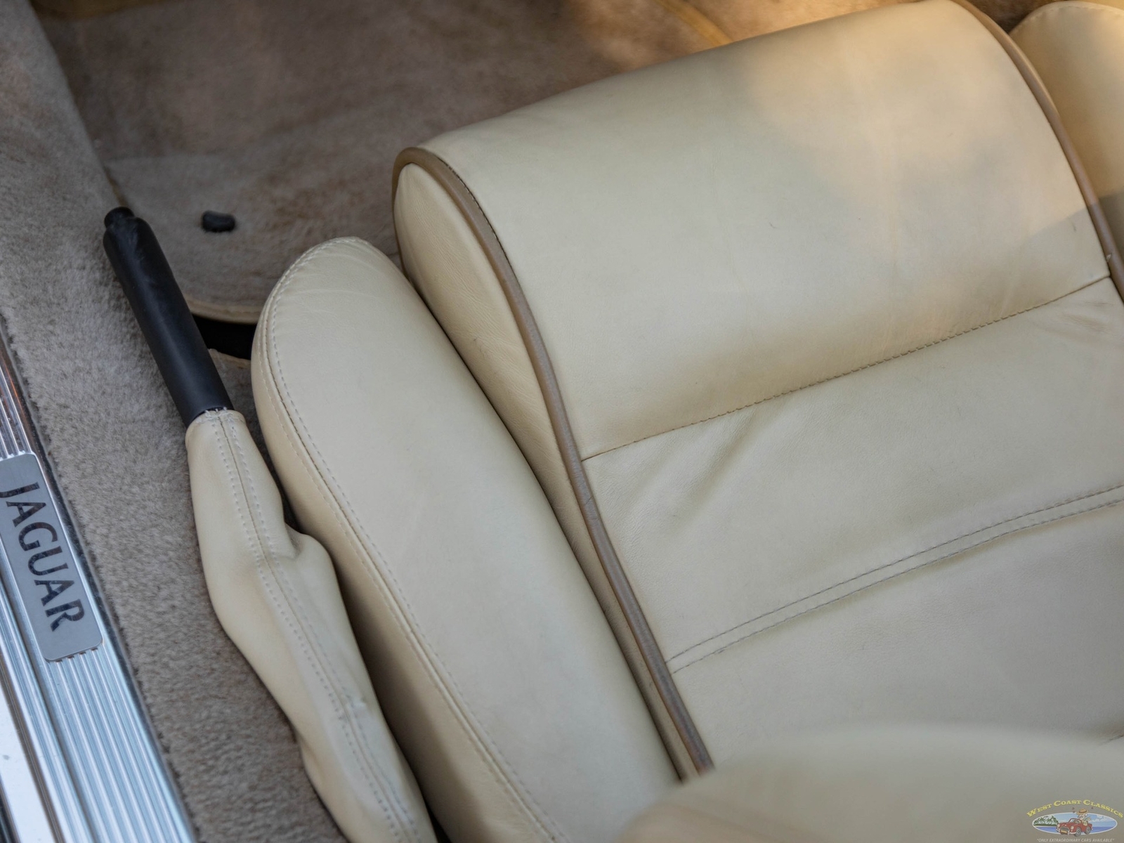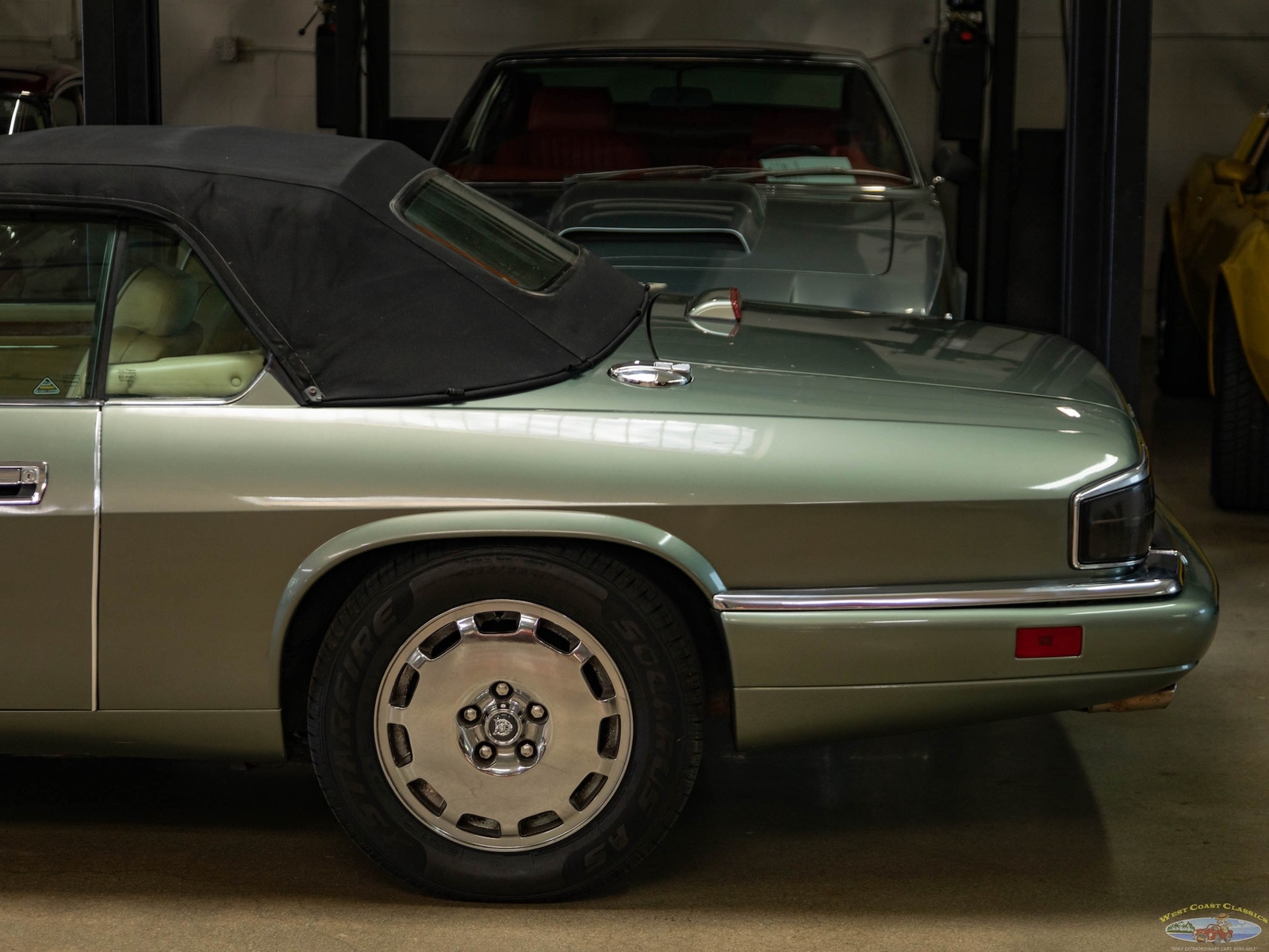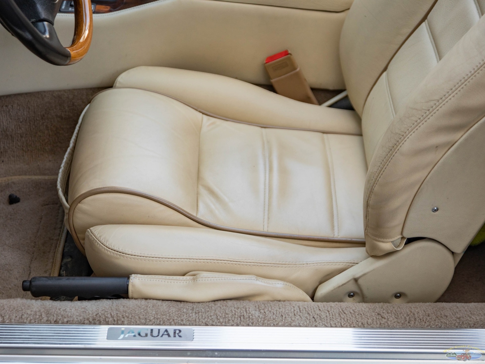 The original factory and very striking 'Jade Green' color paint is in stunning condition and the original 'Cream' color leather seats with 'Light' piping is also in outstanding condition with virtually no signs of any wear and there are no flaws in the dashboard or the walnut veneer, the door panels or the carpets. The soft top is also in exceptional and all original condition. The interior is also completely original with it's 'Jaguar' radio/cassette stereo system with a CD changer in the trunk and all the options and gauges are working as they should including the ice-cold air conditioning!