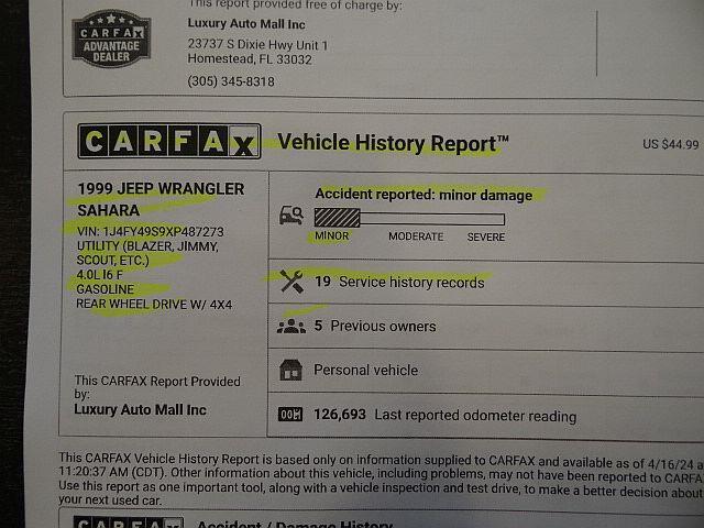 You are viewing a Stunning 1999 Jeep Wrangler Sahara 4x4 Automatic! Only 127K Carfax Documented Miles! Always Southern owned which means NO RUST Issues! Hard to find like this! Very nice Jeep! Newer American Racing wheels and tires! Priced to sell!