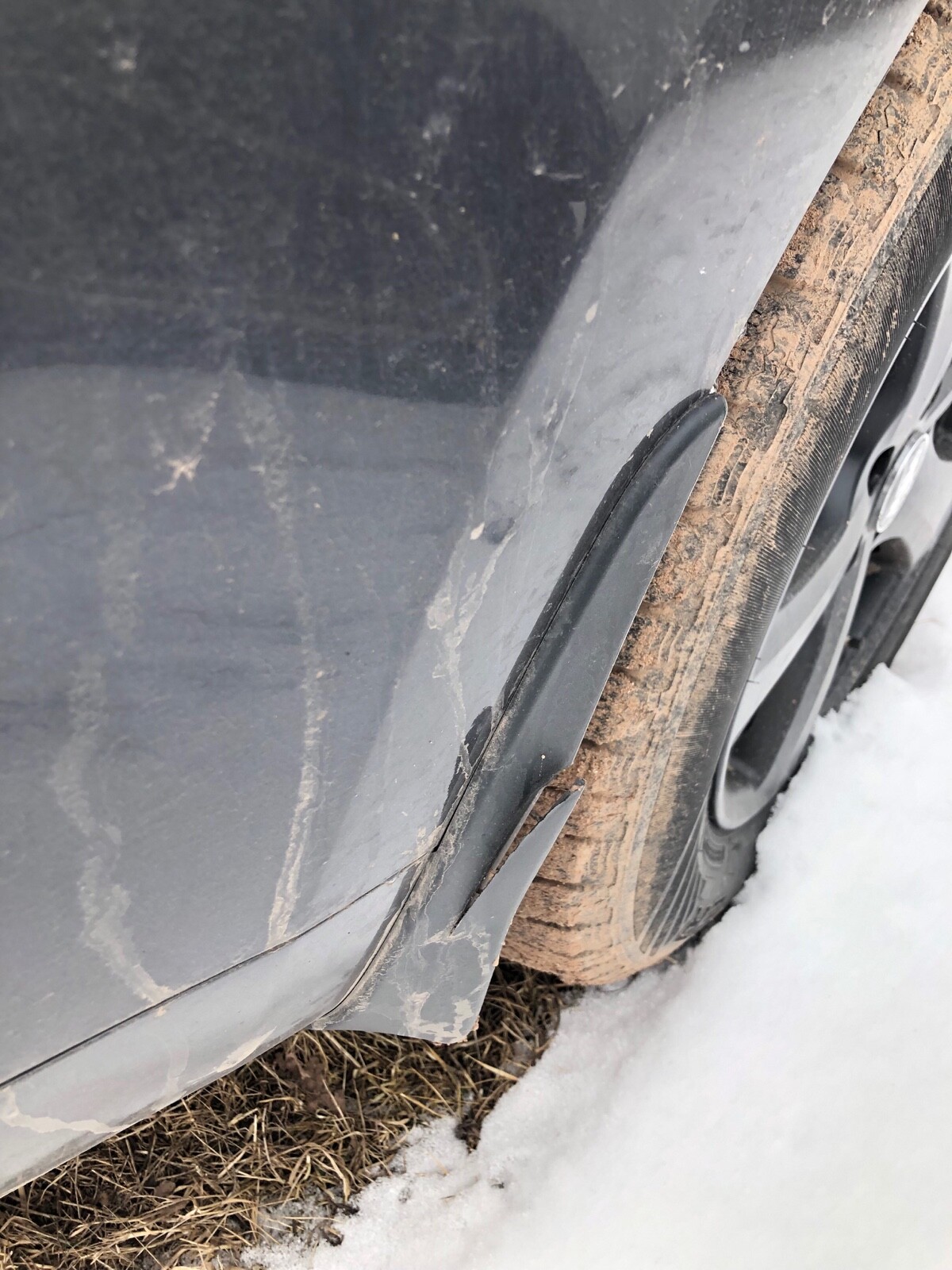 Normal top coat scratches in paint, a small dent/ding around the panels but no major damage. Most noticeable defect is the cracked mud flap as pictured.