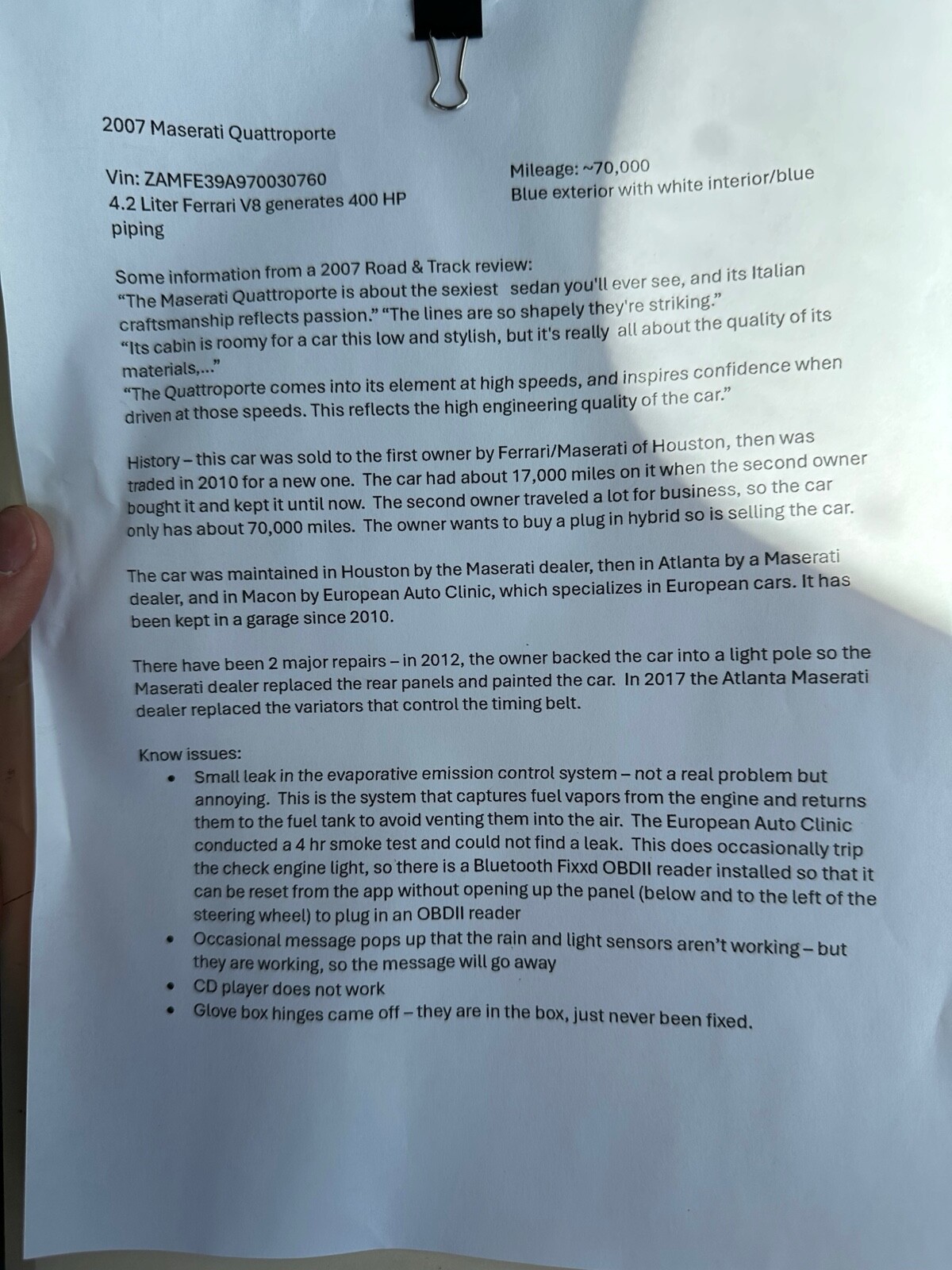 I’m selling my 2007 Quattroporte. I am the second owner and have meticulously maintained the car since I bought it in 2010. It has been garage kept since then and maintained described in future detail in a document included in the pictures. Please contact me and I will be happy to send additional pictures and videos of the car running.Vehicle Details