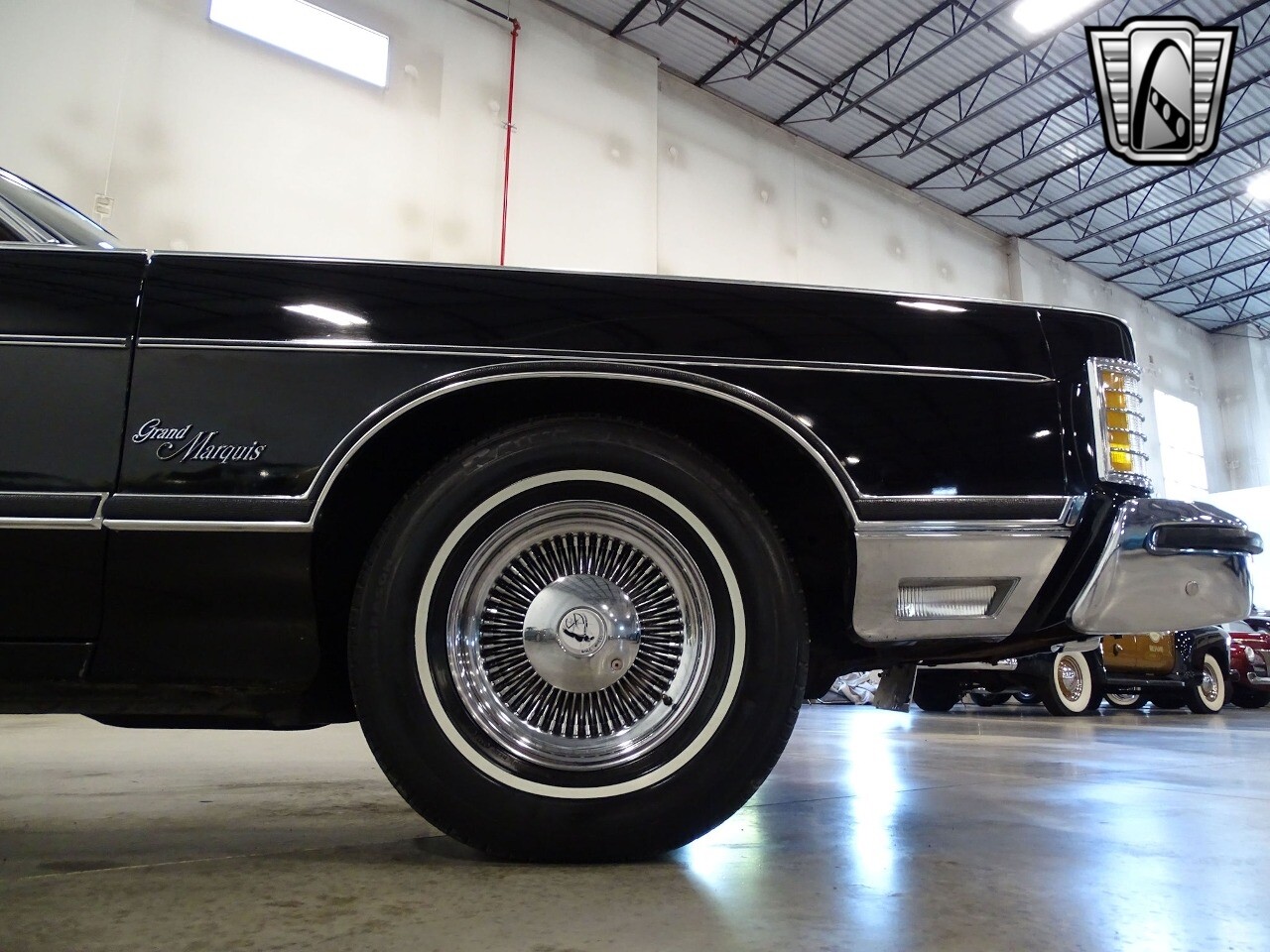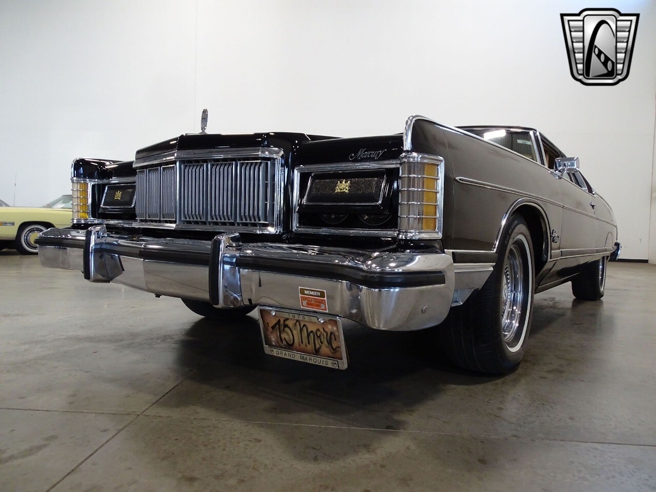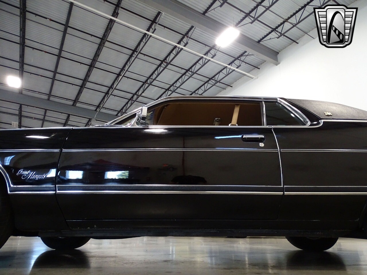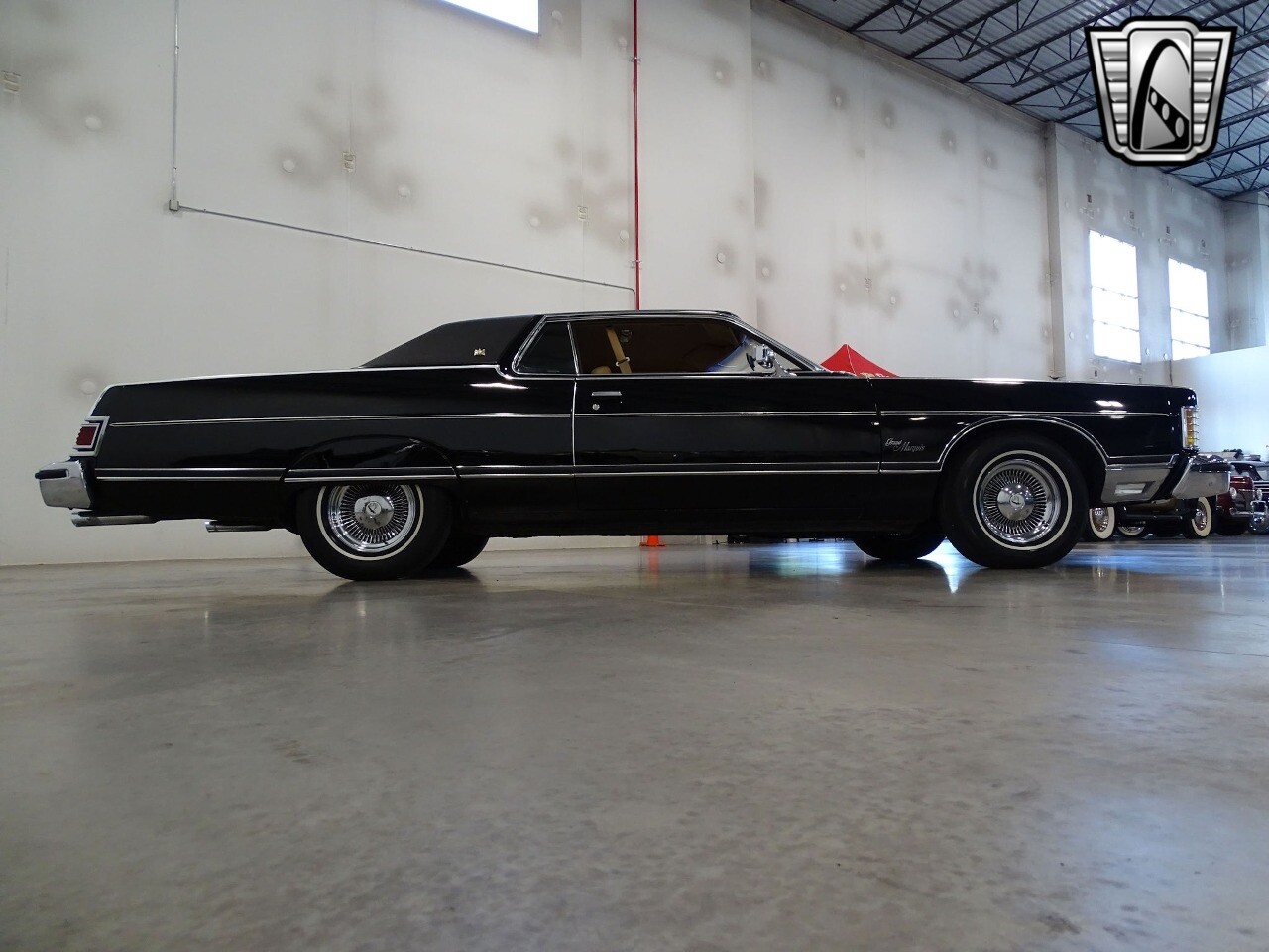 This 1975 Mercury Grand Marquis is painted in tuxedo black with a matching full vinyl top. Fender skirts and a set of aftermarket steel wire rims w/ period whitewalls add to the graceful lines of 218.5-inch cruiser. The plush beige interior sports leather seating, brown carpet, 50/50 power seats, power windows, power locks, air conditioning, tilt steering wheel, rear defroster, speed control, and an AM/FM/ 8-track radio. Under the hood of his beauty is a 460-4V V8 attached to a three-speed automatic Select-Shift transmission. Other features include power steering, power front disk brakes, traction-lock differential, cornering lamps, and dual outside mirrors.