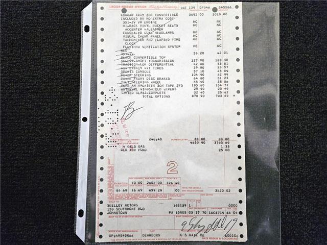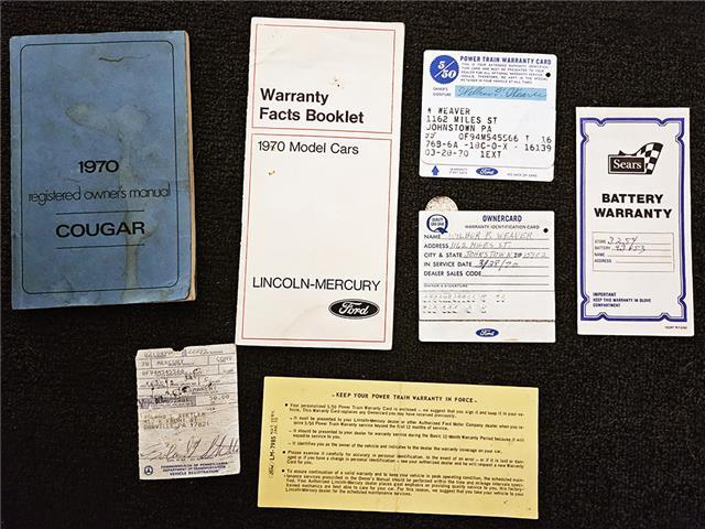 Documentation is extensive, including the original window sticker, owner’s manuals, Ownercard and warranty card, and even the original registration lip. There are also some period Cougar brochures and a Deluxe Marti Report.