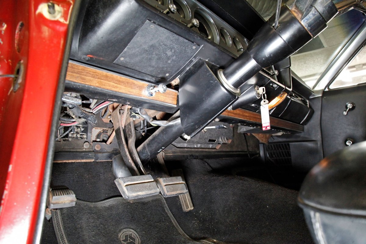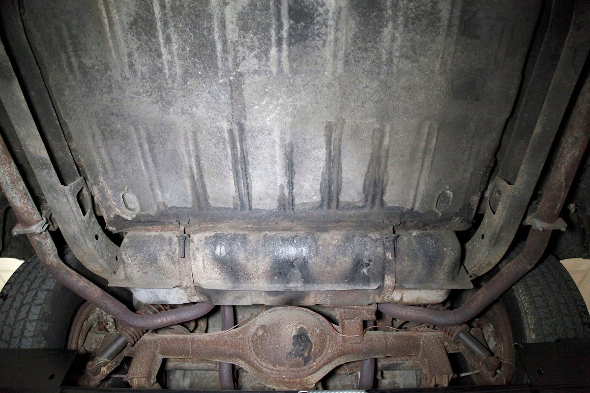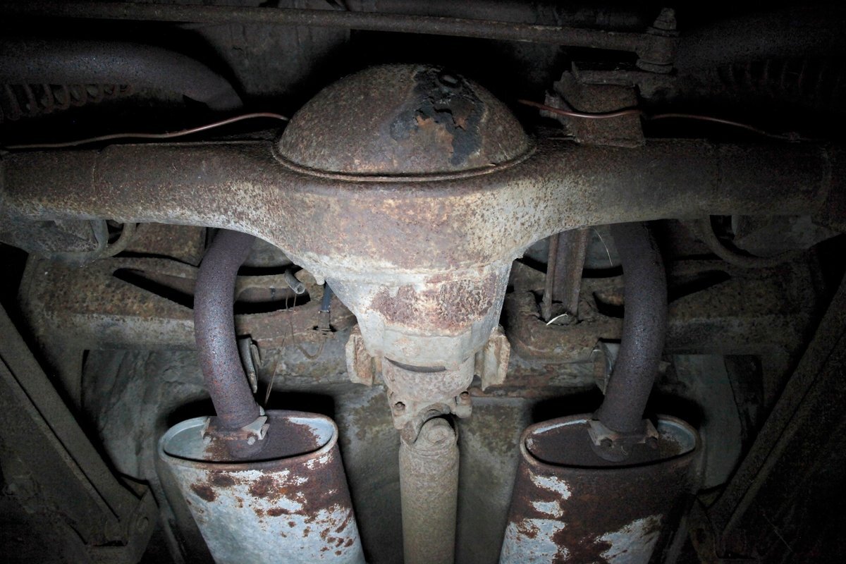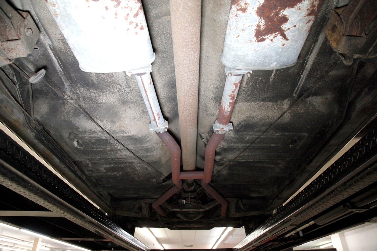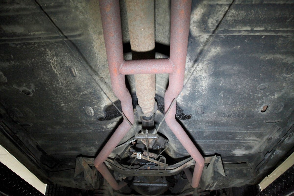 The basement...or undercarriage, shows patinaed underpinnings, surface rusted dual exhaust and a fairly drip free oil pan and transmission. The frame and flooring present with the factory undercoating and a smattering of surface rust on the usual suspects. We note the frame side rails have been heavily plated covering what is believed to be invasive rust and on the driver's frame kick up over the axle shows with heavy invasive rust for the frame. The suspension is independent coil spring suspension up front and a 3 link and coil springs on the rear, just the way the engineers designed it. Drum brakes are all around, and this car is now manual steering equipped, but our consignor has all the original power steering parts to include with your purchase.