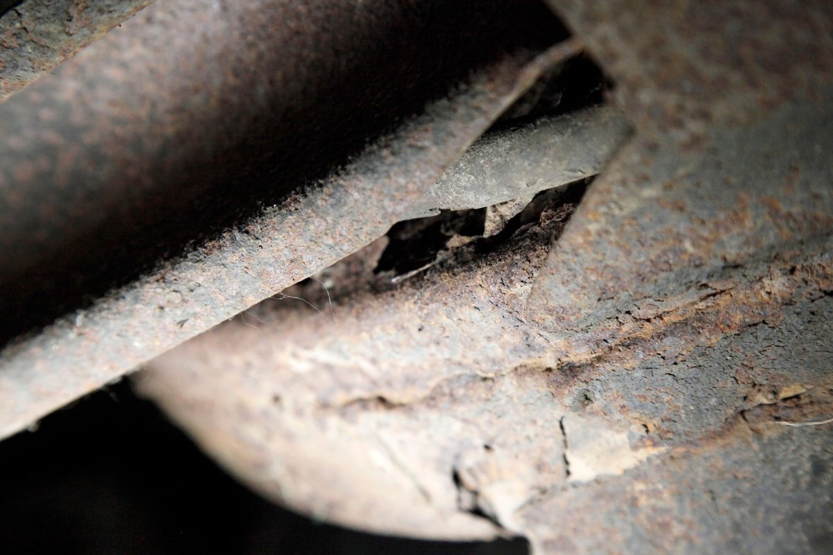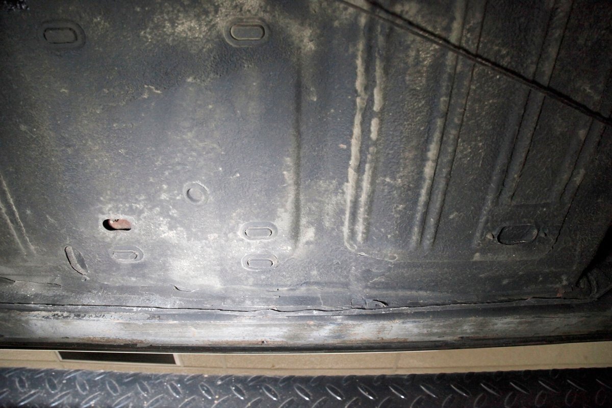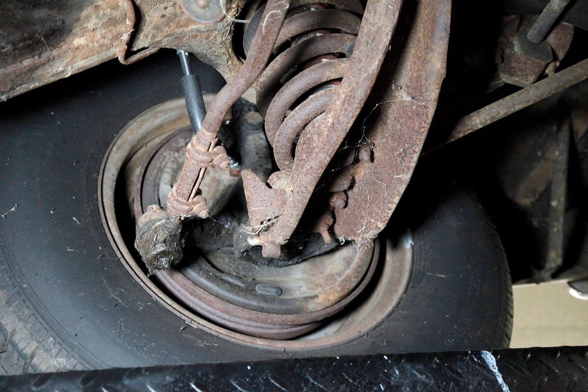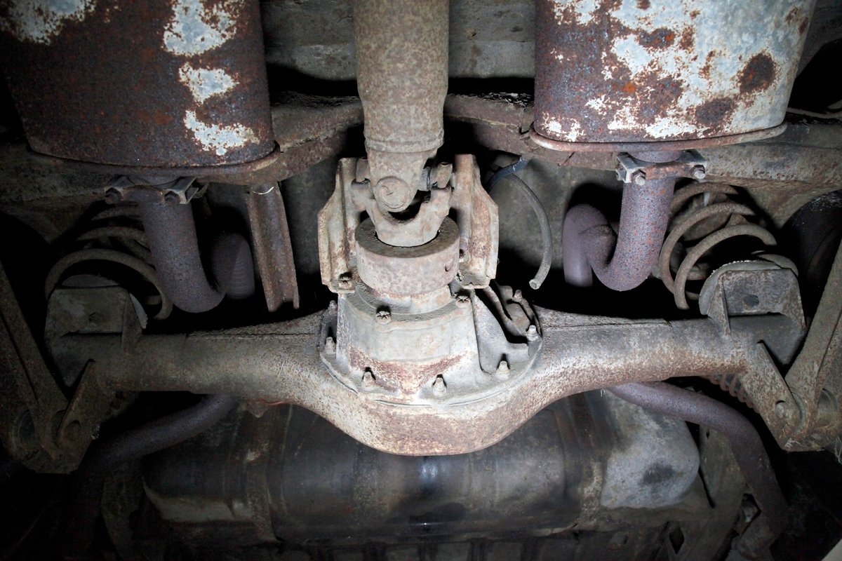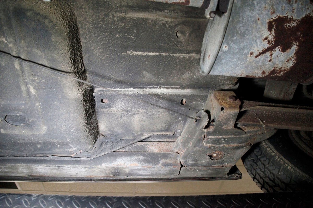 The basement...or undercarriage, shows patinaed underpinnings, surface rusted dual exhaust and a fairly drip free oil pan and transmission. The frame and flooring present with the factory undercoating and a smattering of surface rust on the usual suspects. We note the frame side rails have been heavily plated covering what is believed to be invasive rust and on the driver's frame kick up over the axle shows with heavy invasive rust for the frame. The suspension is independent coil spring suspension up front and a 3 link and coil springs on the rear, just the way the engineers designed it. Drum brakes are all around, and this car is now manual steering equipped, but our consignor has all the original power steering parts to include with your purchase.