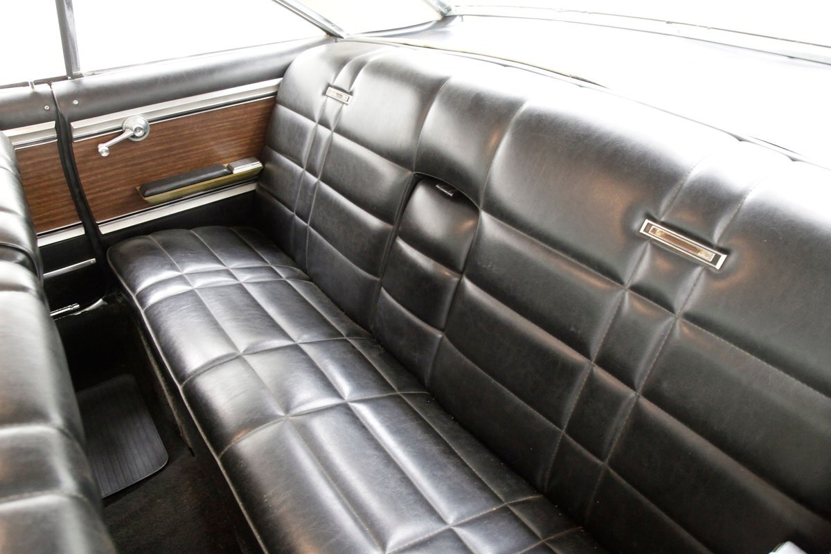 Original black upholstery is seen throughout the passenger compartment, as well as the carpet which is a low cut pile with nearly no fading and some minor soiling A split back bench upfront, and a bench across the rear are all in beautiful crinkle black vinyl with various tuck and roll stitching in vertical and horizontal patterns and finished off with decorative emblems in the backs. In the center of the rear sprawling bench seat is a fold down armrest. The black leatherette wrapped 2 spoke steering wheel fronts the factory gauges in their black and brushed aluminum ribbed housing. A heater and defroster is an option this car has along with an AM radio and a thin band of dark wood applique dresses the bottom of the dash. The door panels, in well padded black vinyl, houses the chrome window cranks and even more cranks for the wing windows as well as a huge applique insert dressed with stainless trim, luxury at its finest! Rounding out the interior is a crack free padded dash topper.