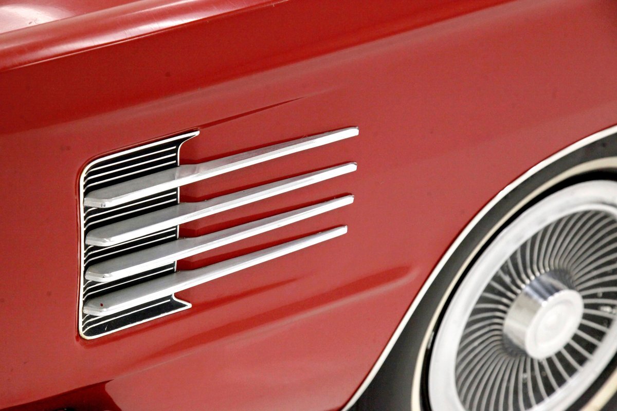 A lift of the massive hood reveals the original 390 cubic inch V8 gracing the engine bay, and a 4-barrel carburetor is perched on top. The bay shows with some patina on various surfaces but the big V8 shines gloriously in all its orange/red painted splendor among all the supple hoses and wires. Bolted to the back of this mill is a 3-speed manual transmission with overdrive which sends power way back to a 3.25 conventional geared Ford 9" rear axle.