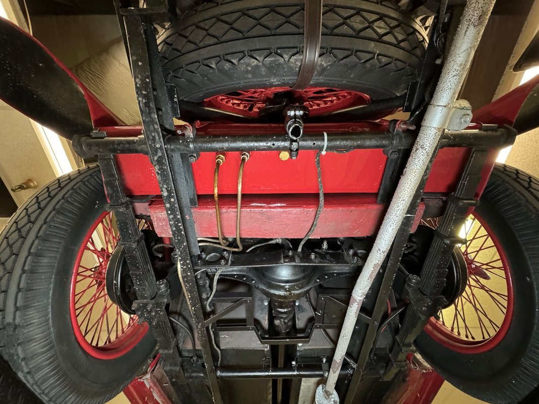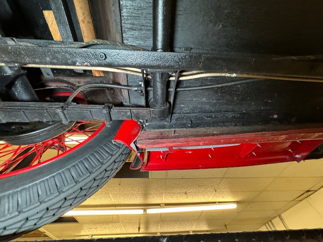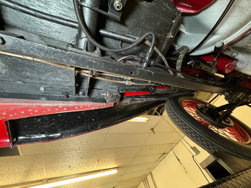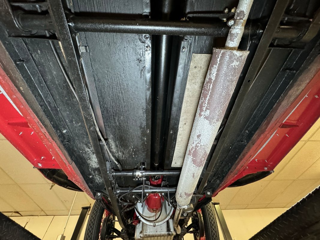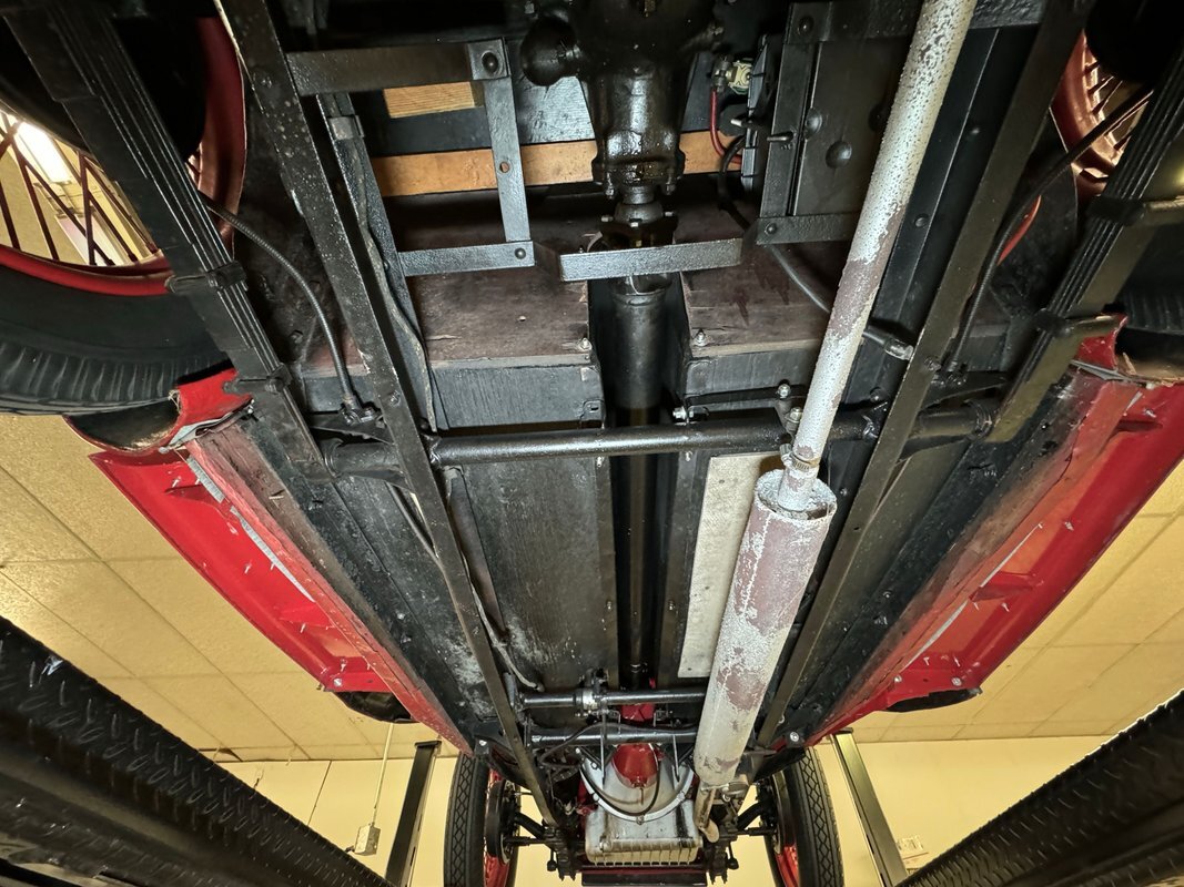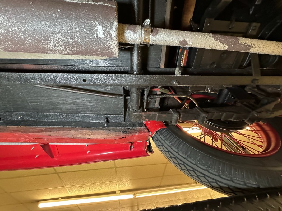 Open the side engine cover and what is revealed is the 1292cc inline 4 cylinder engine looking period correct and clean, rated at 50 horsepower. Twin SU carburetors feed the four banger and a 4-speed manual transmission sets it into motion, sending power to the rear wheels and 4.875 gears. Drum brakes are found forward and aft. UndercarriageFrom this angle, you can see some of the painted wood construction and simple frame. Zero rust and only a few drops of oil and beyond that, a clean underside and the single exhaust flows into a long stock style muffler then sends a tailpipe out back just behind the single taillight. Leaf springs handle the suspension at both ends and we note a VW steering box conversion on the car.
