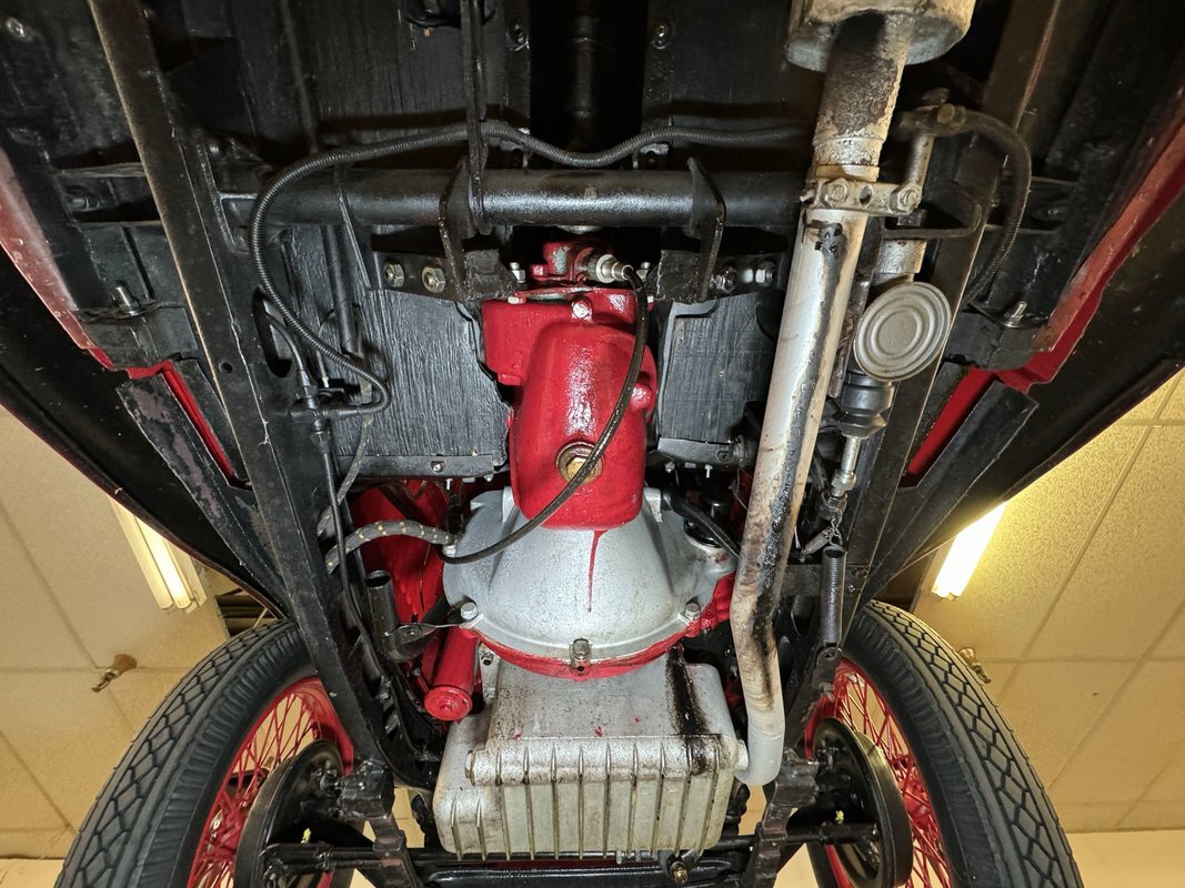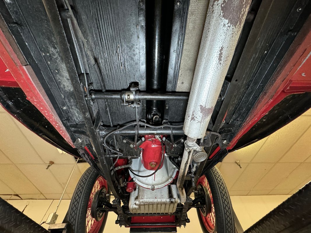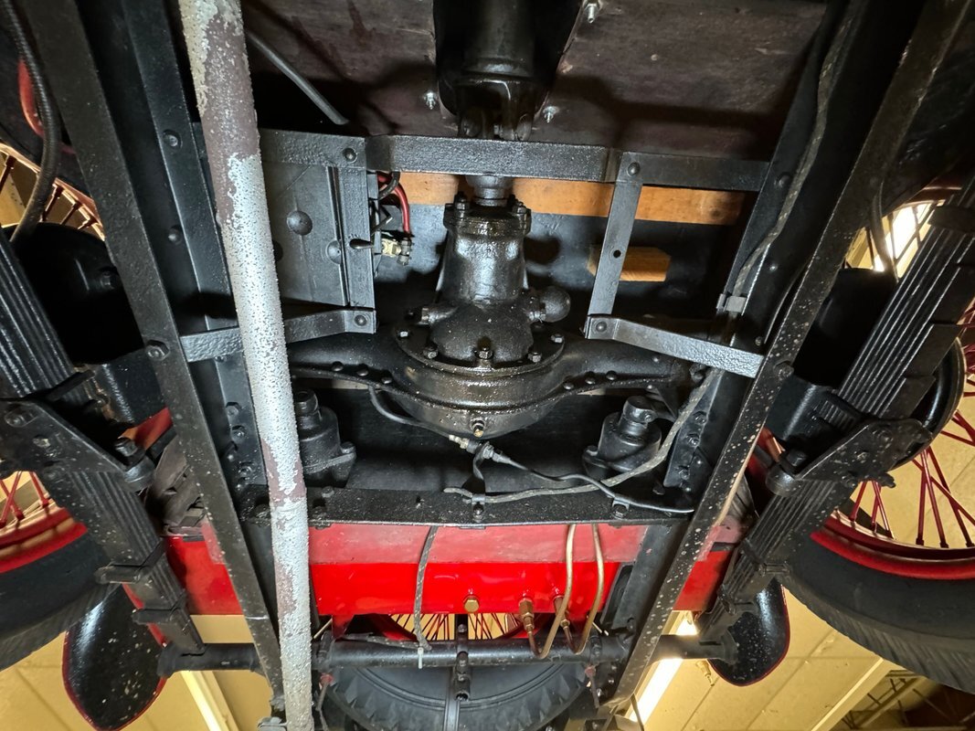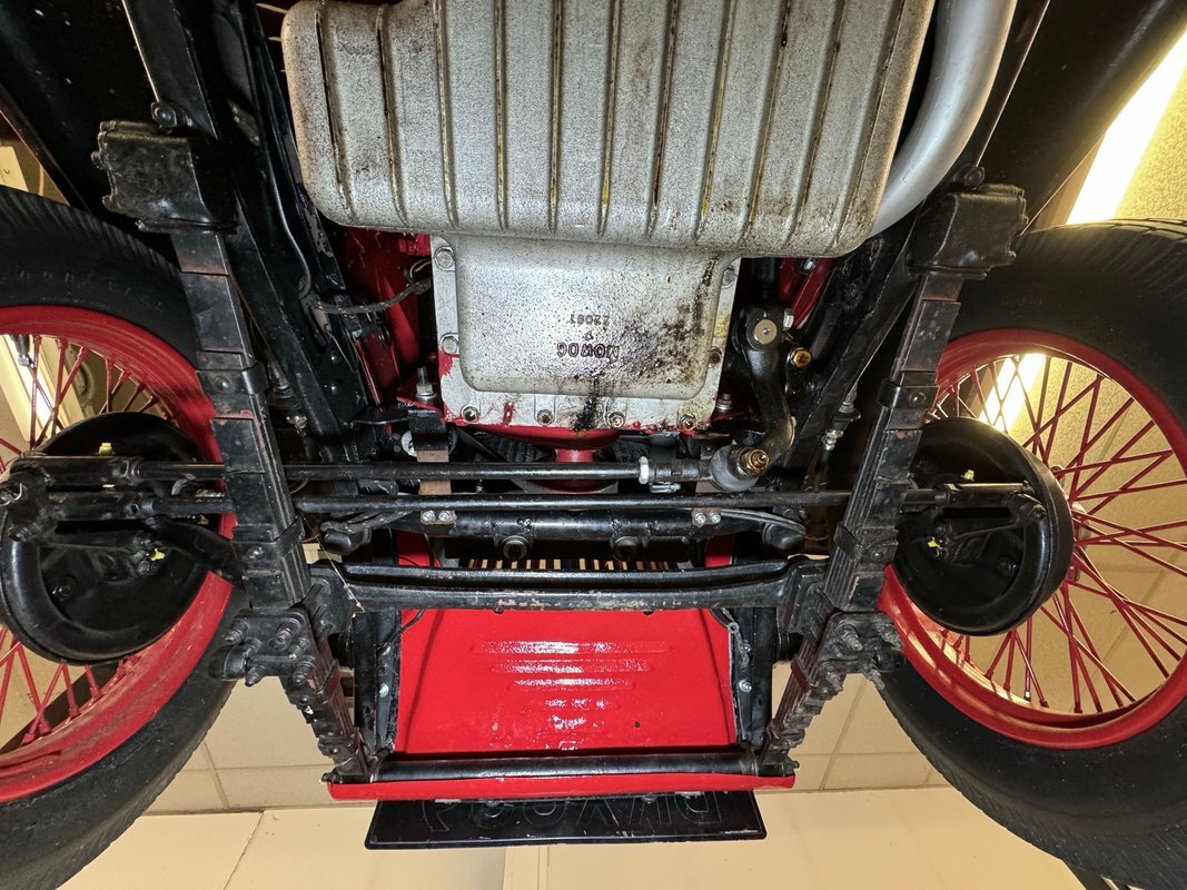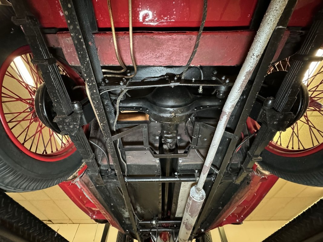 Open the side engine cover and what is revealed is the 1292cc inline 4 cylinder engine looking period correct and clean, rated at 50 horsepower. Twin SU carburetors feed the four banger and a 4-speed manual transmission sets it into motion, sending power to the rear wheels and 4.875 gears. Drum brakes are found forward and aft. UndercarriageFrom this angle, you can see some of the painted wood construction and simple frame. Zero rust and only a few drops of oil and beyond that, a clean underside and the single exhaust flows into a long stock style muffler then sends a tailpipe out back just behind the single taillight. Leaf springs handle the suspension at both ends and we note a VW steering box conversion on the car.