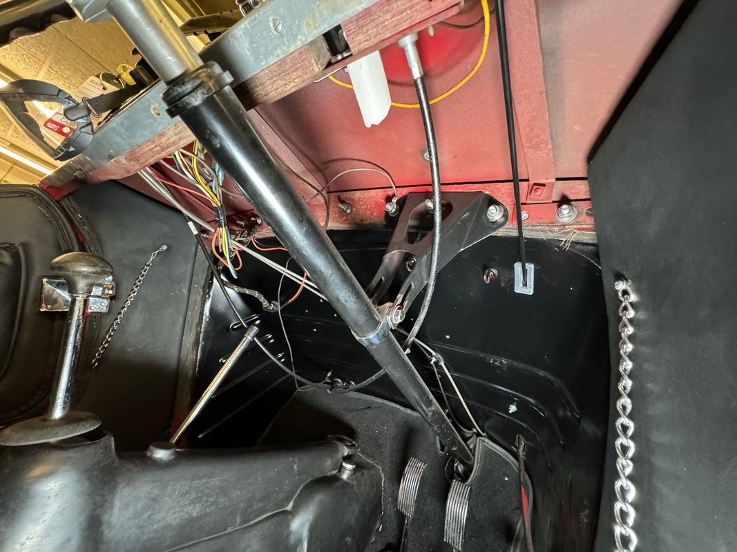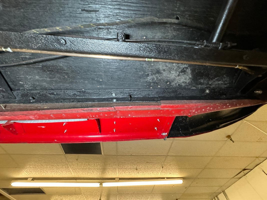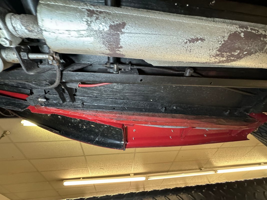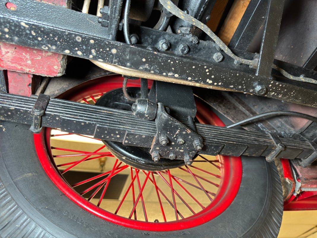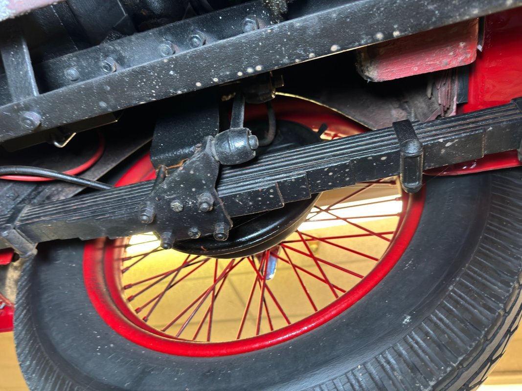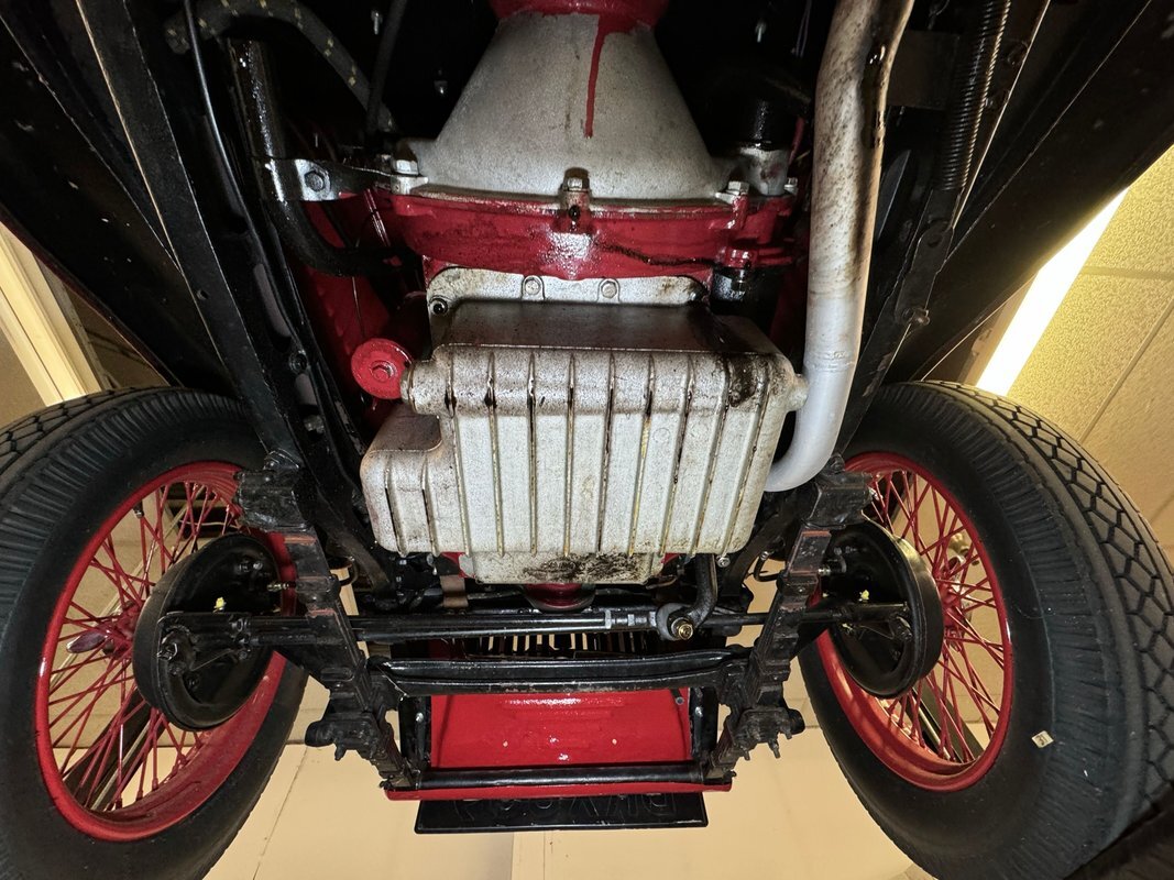 Open the side engine cover and what is revealed is the 1292cc inline 4 cylinder engine looking period correct and clean, rated at 50 horsepower. Twin SU carburetors feed the four banger and a 4-speed manual transmission sets it into motion, sending power to the rear wheels and 4.875 gears. Drum brakes are found forward and aft. UndercarriageFrom this angle, you can see some of the painted wood construction and simple frame. Zero rust and only a few drops of oil and beyond that, a clean underside and the single exhaust flows into a long stock style muffler then sends a tailpipe out back just behind the single taillight. Leaf springs handle the suspension at both ends and we note a VW steering box conversion on the car.