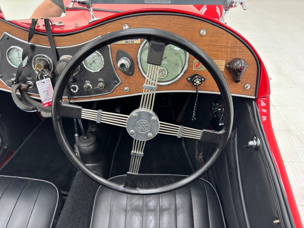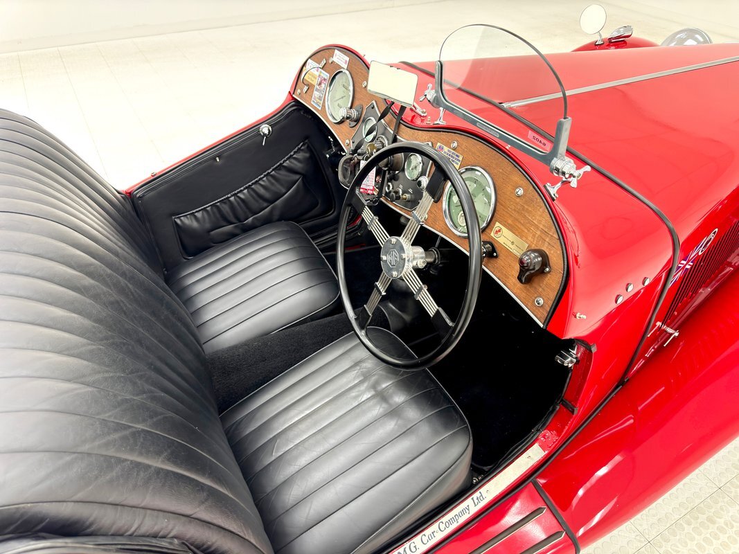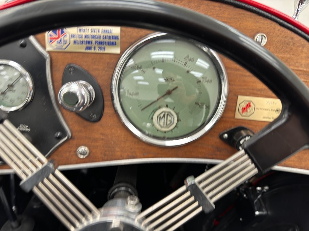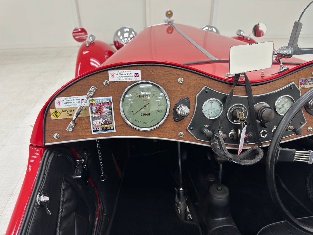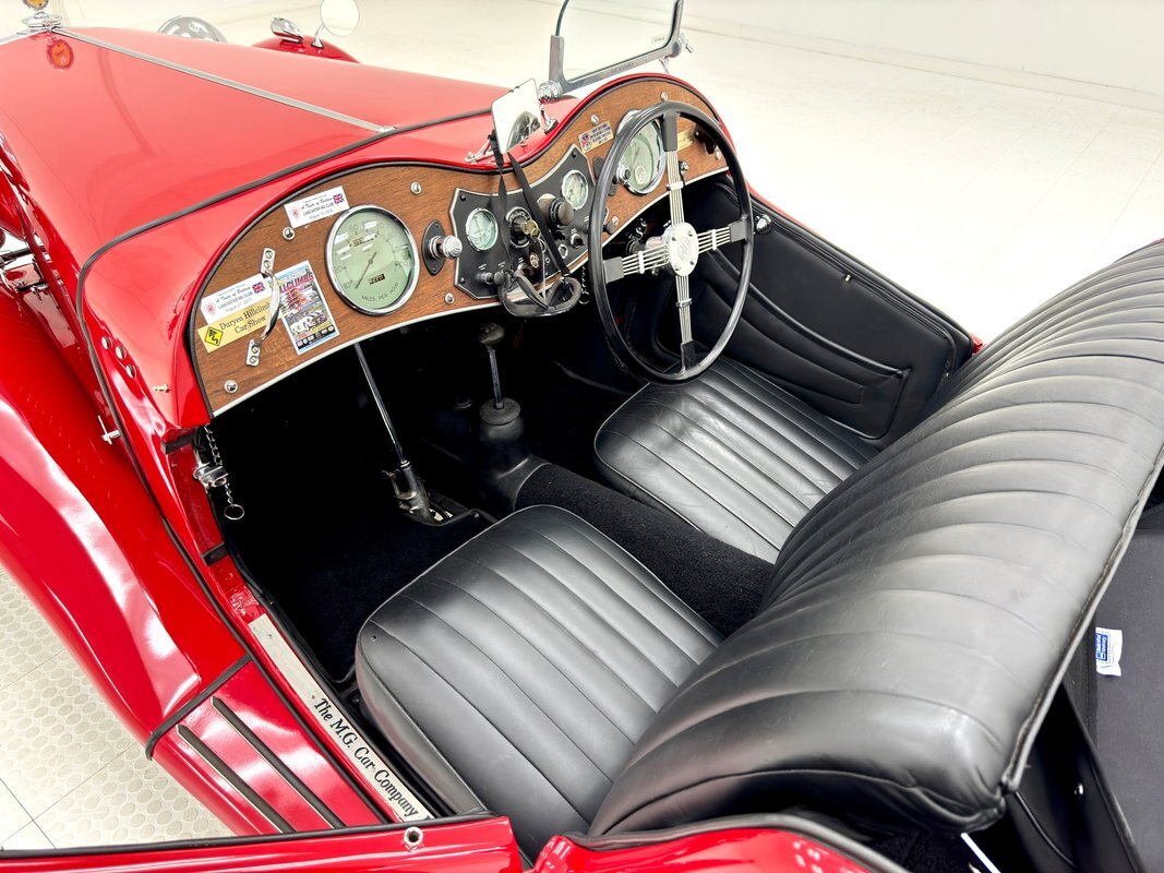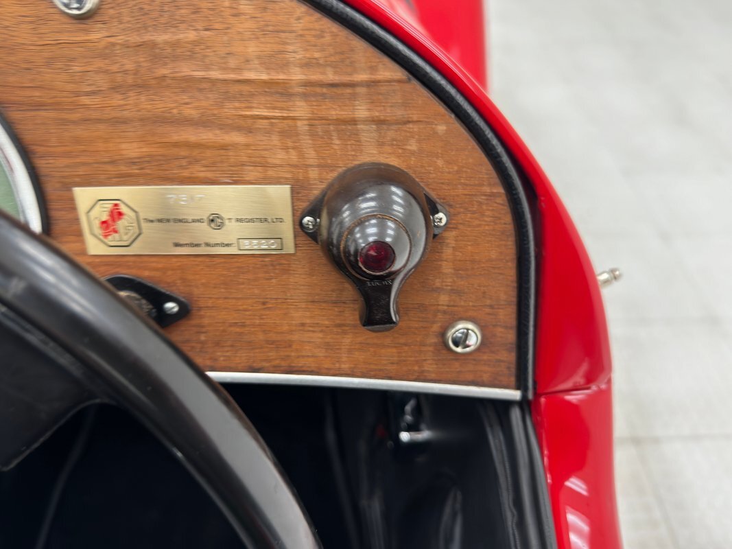Black vinyl door panels cover the small doors which open suicide style, and a map pocket is a major feature of the doors. The door sill spells out the manufacturer and leads to a beautiful black vinyl split bench seat, uniformly stitched and robust with little sign of usage. Behind the seats is a storage area, deep between the wheel wells and lined with black carpet. MG is engraved in the middle of the banjo style right hand drive steering wheel, open enough to provide views of the dashboard and in particular, the tachometer that is in direct sightline to the driver. The dashboard itself is a flowing undulation of wood with a center plate adorned with gauges, switches, and ignition, while dash plaques are mounted as they were intended on the dash! There is a small single windshield in front of the driver and googles are present not just for period authenticity, but for practical use on the street. The shifter is floor mounted and straight, and the floors have low pile black carpeted mats, all in a clean presentation.