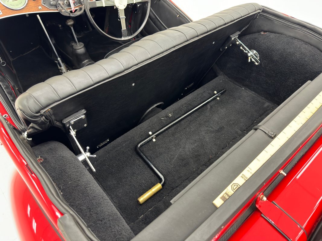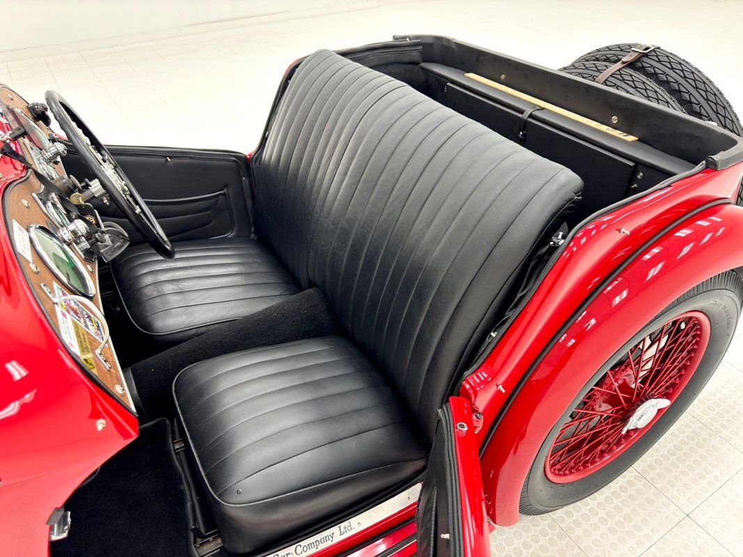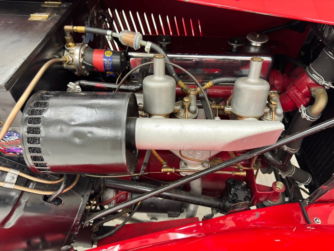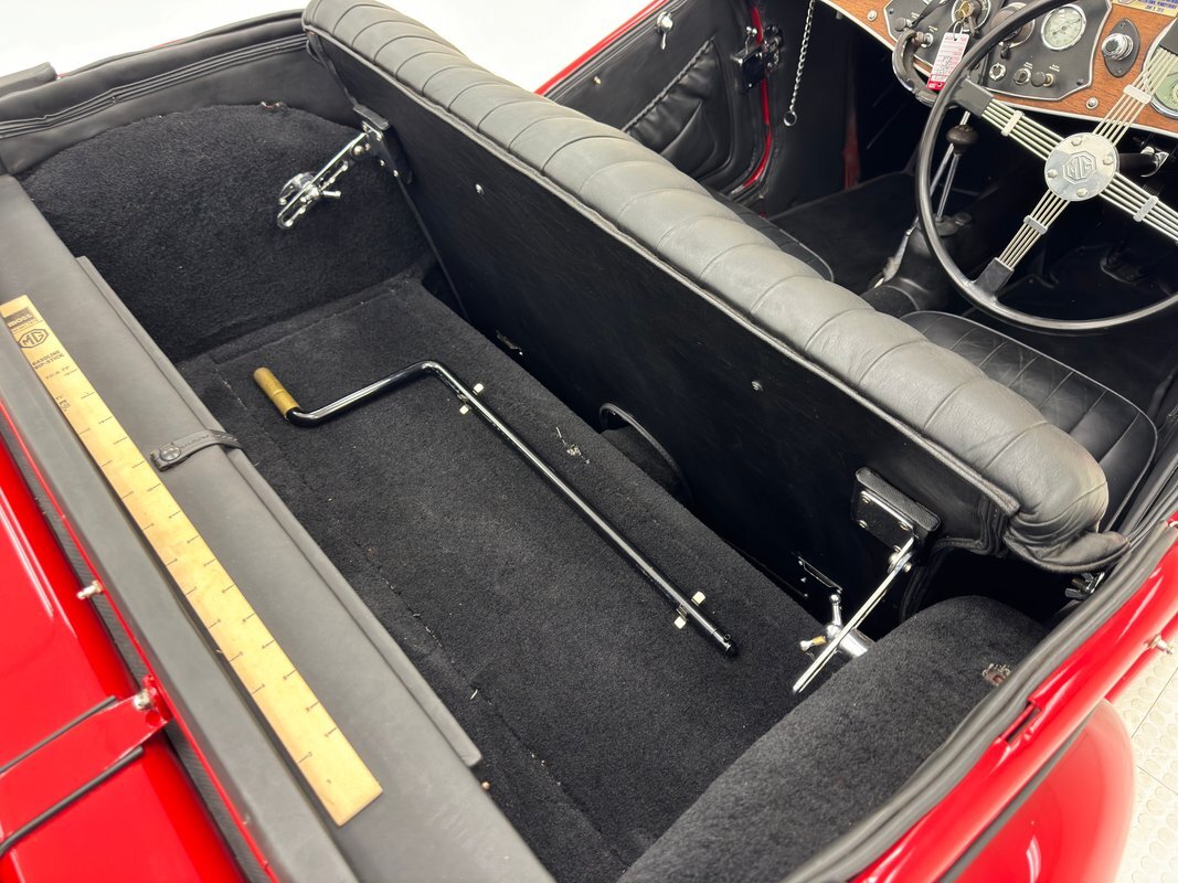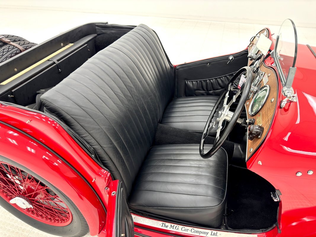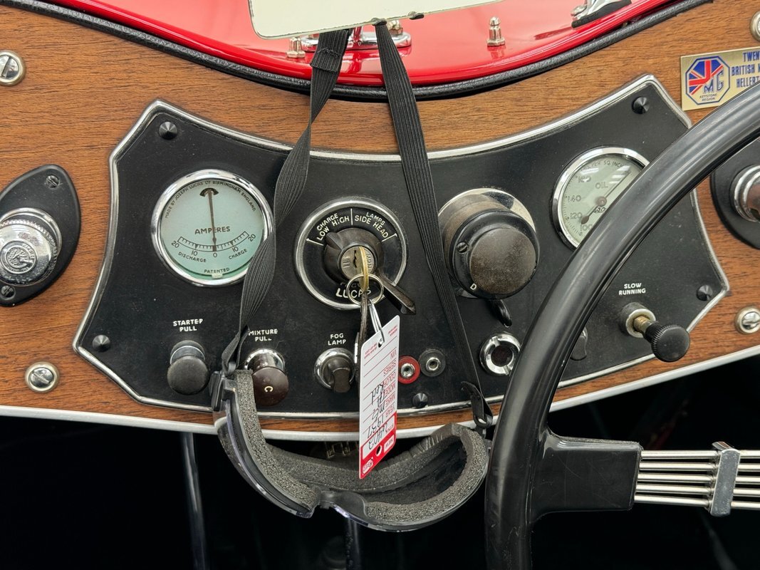 Black vinyl door panels cover the small doors which open suicide style, and a map pocket is a major feature of the doors. The door sill spells out the manufacturer and leads to a beautiful black vinyl split bench seat, uniformly stitched and robust with little sign of usage. Behind the seats is a storage area, deep between the wheel wells and lined with black carpet. MG is engraved in the middle of the banjo style right hand drive steering wheel, open enough to provide views of the dashboard and in particular, the tachometer that is in direct sightline to the driver. The dashboard itself is a flowing undulation of wood with a center plate adorned with gauges, switches, and ignition, while dash plaques are mounted as they were intended on the dash! There is a small single windshield in front of the driver and googles are present not just for period authenticity, but for practical use on the street. The shifter is floor mounted and straight, and the floors have low pile black carpeted mats, all in a clean presentation.