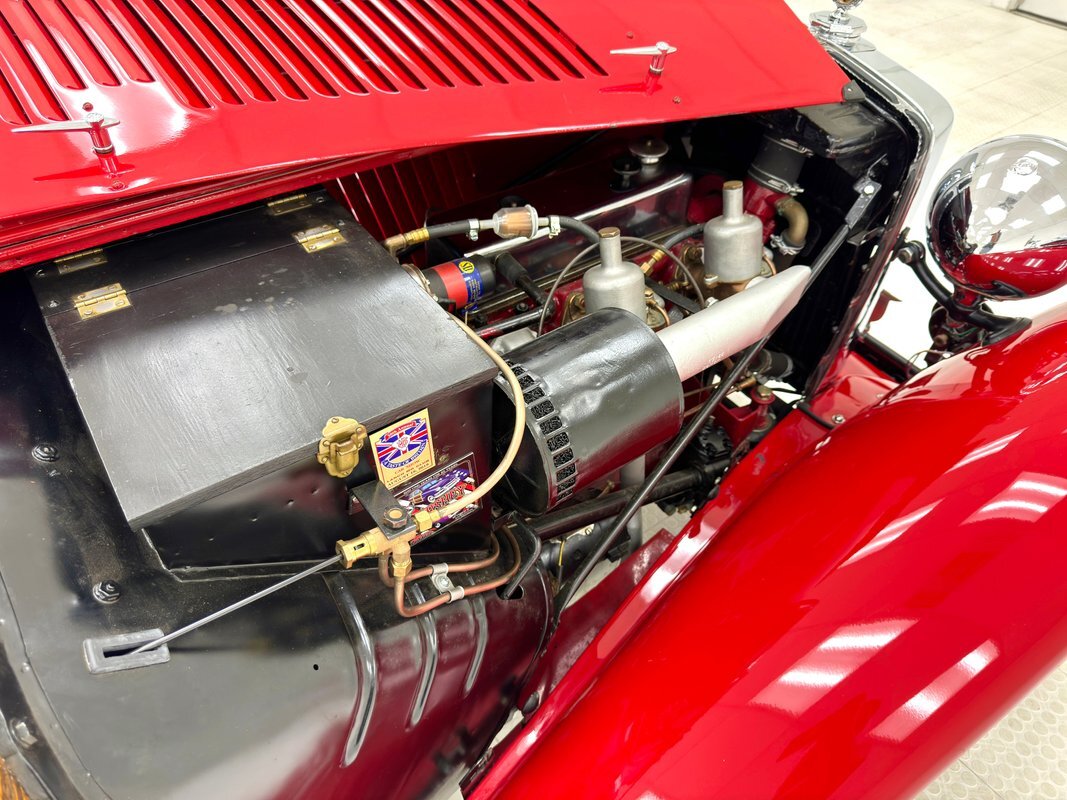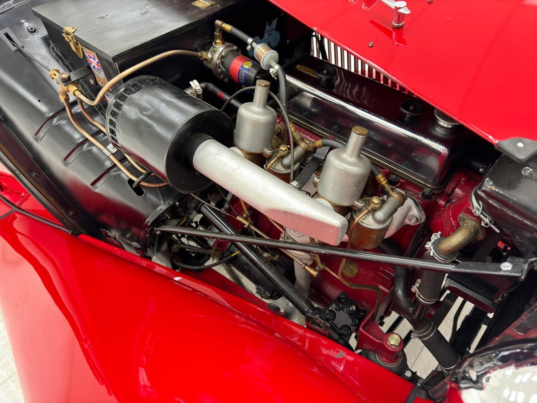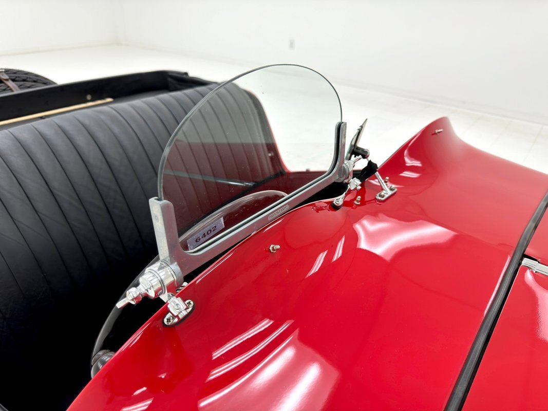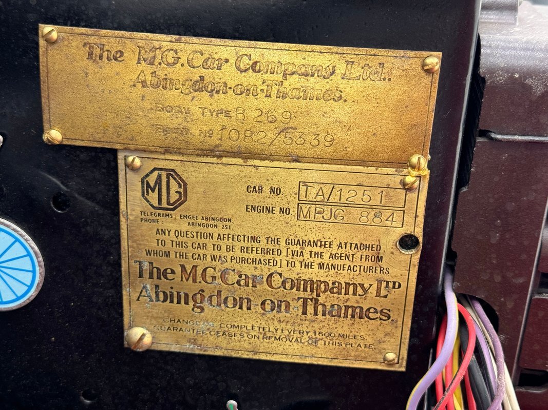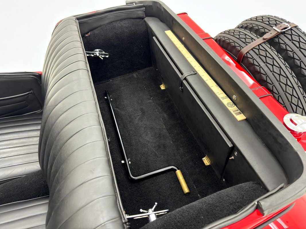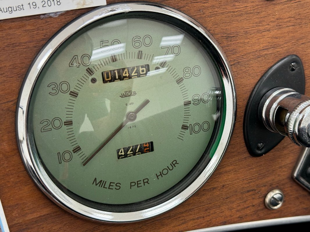 Black vinyl door panels cover the small doors which open suicide style, and a map pocket is a major feature of the doors. The door sill spells out the manufacturer and leads to a beautiful black vinyl split bench seat, uniformly stitched and robust with little sign of usage. Behind the seats is a storage area, deep between the wheel wells and lined with black carpet. MG is engraved in the middle of the banjo style right hand drive steering wheel, open enough to provide views of the dashboard and in particular, the tachometer that is in direct sightline to the driver. The dashboard itself is a flowing undulation of wood with a center plate adorned with gauges, switches, and ignition, while dash plaques are mounted as they were intended on the dash! There is a small single windshield in front of the driver and googles are present not just for period authenticity, but for practical use on the street. The shifter is floor mounted and straight, and the floors have low pile black carpeted mats, all in a clean presentation.