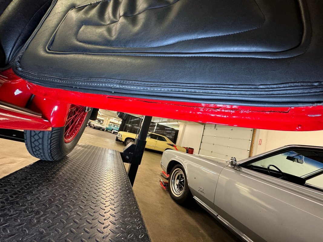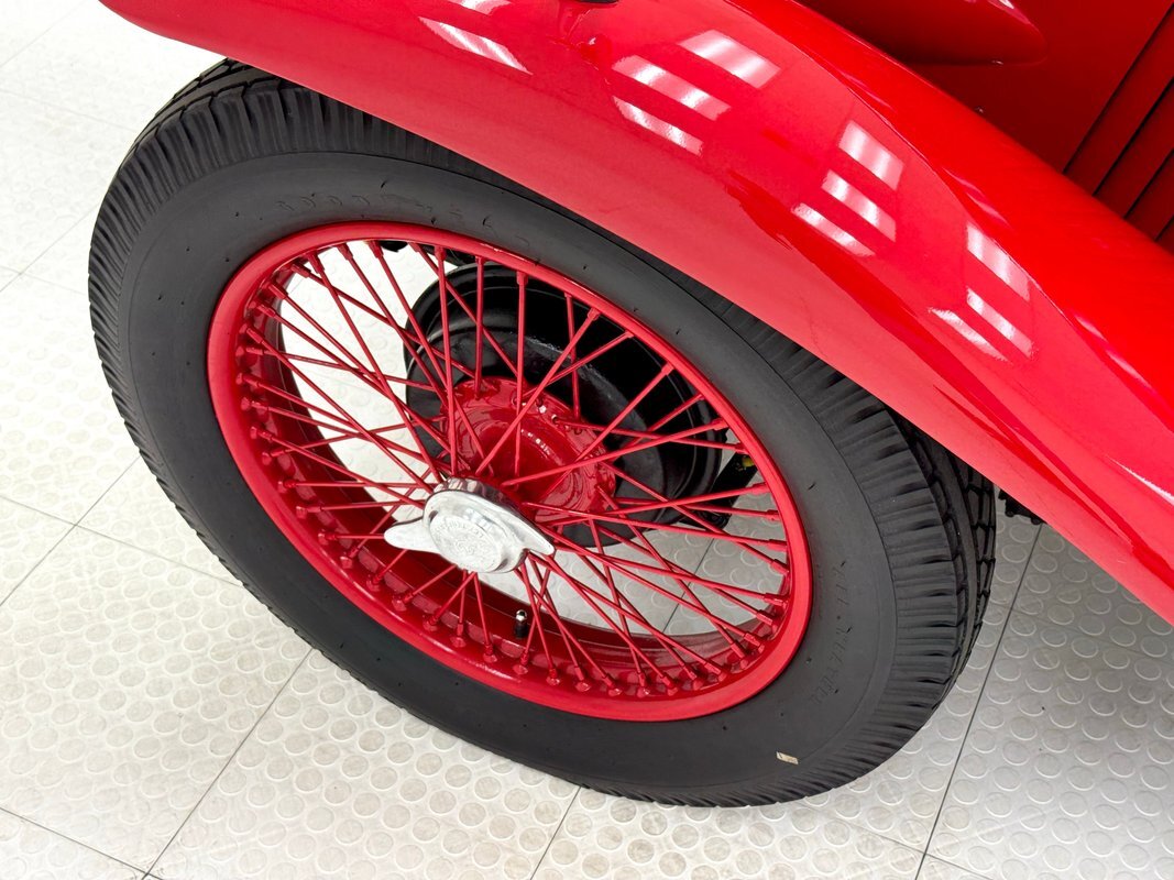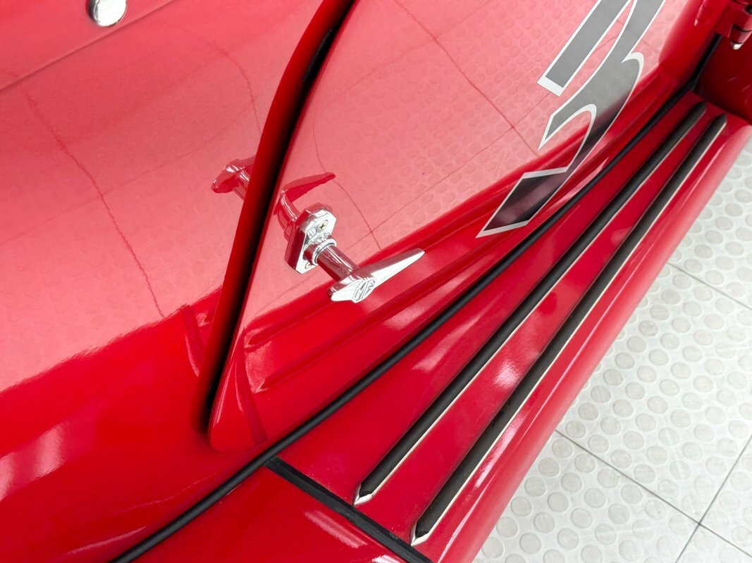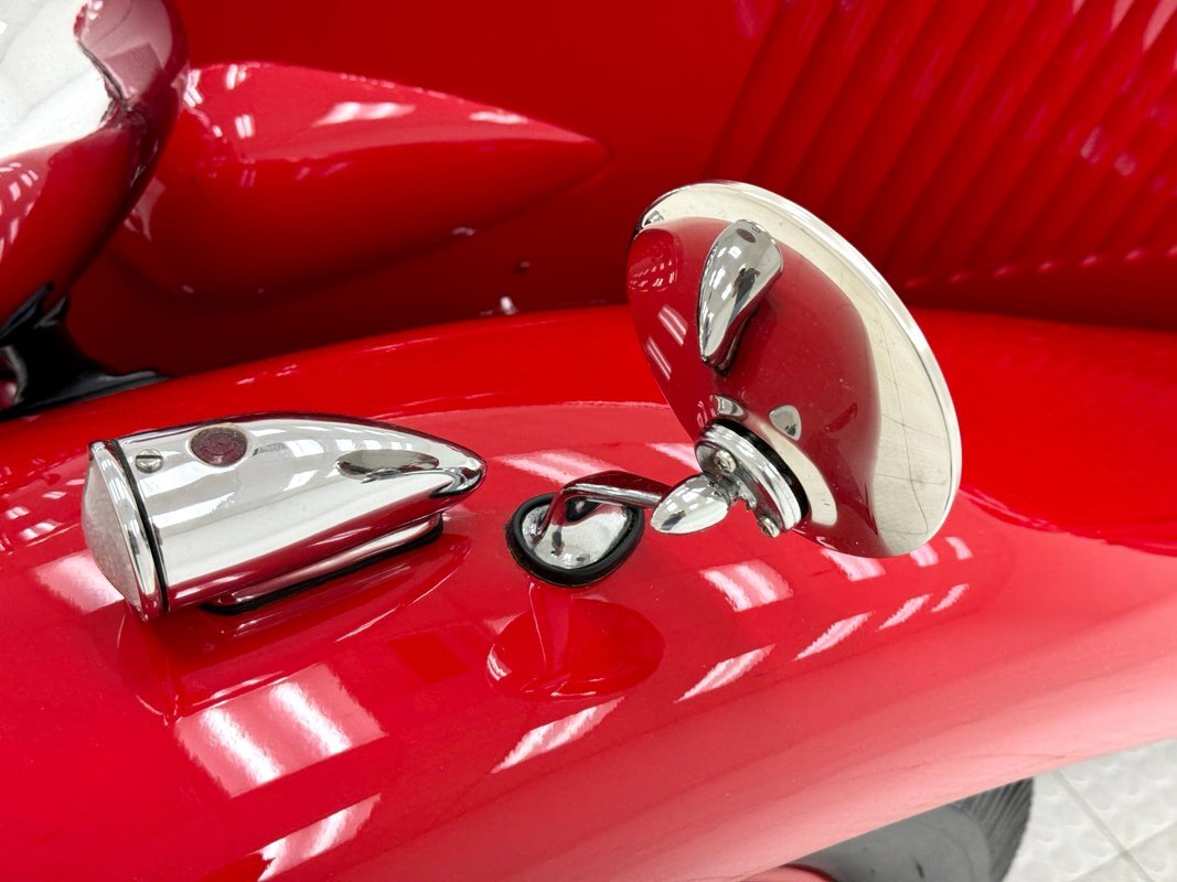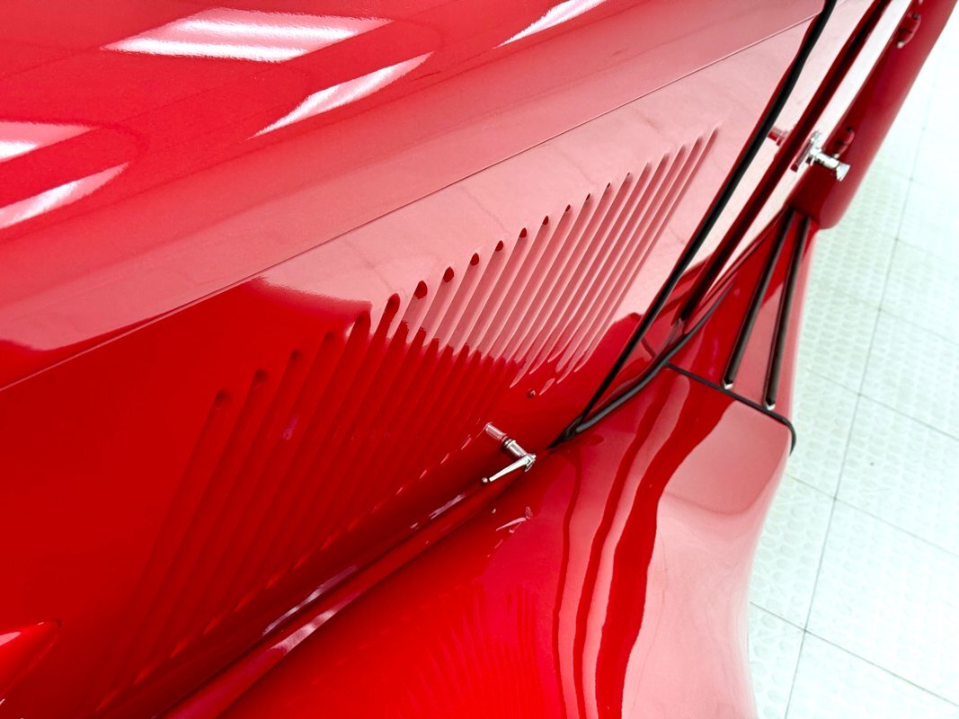 If red cars get more traffic tickets, get ready to write some checks because this car absolutely pops. Beautiful glossy red covers the entire car from the long sweeping front fenders to the circular rear fenders that end in a point behind the car. The grille alternates red slats with black ones and looks race and show ready with a bevy of grille badges strewn across the lower light bar. You can't miss the large number 3 on the doors, black and bold in Gothic script and pulling in other black elements of the car including the tires and interior in a beautifully harmonized palette. The 19-inch red wire wheels are spectacular, and two spares are mounted onto the back, just in front of a wedge shaped gas tank, topped by a gleaming polished cap. Speaking of gleaming, all the chrome and polished metals are in excellent condition. Three small imperfections include a touched up scratch, a lower scuff, and a paint chip.