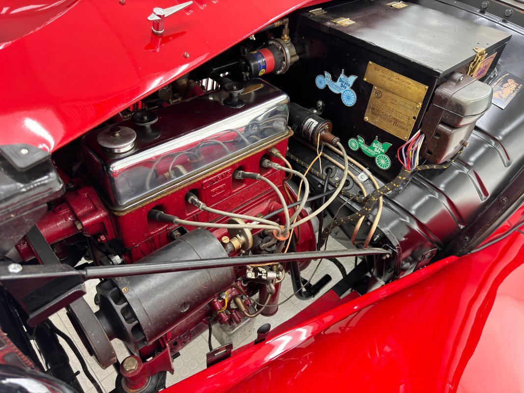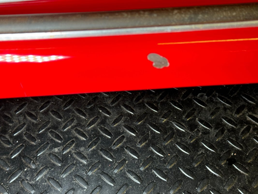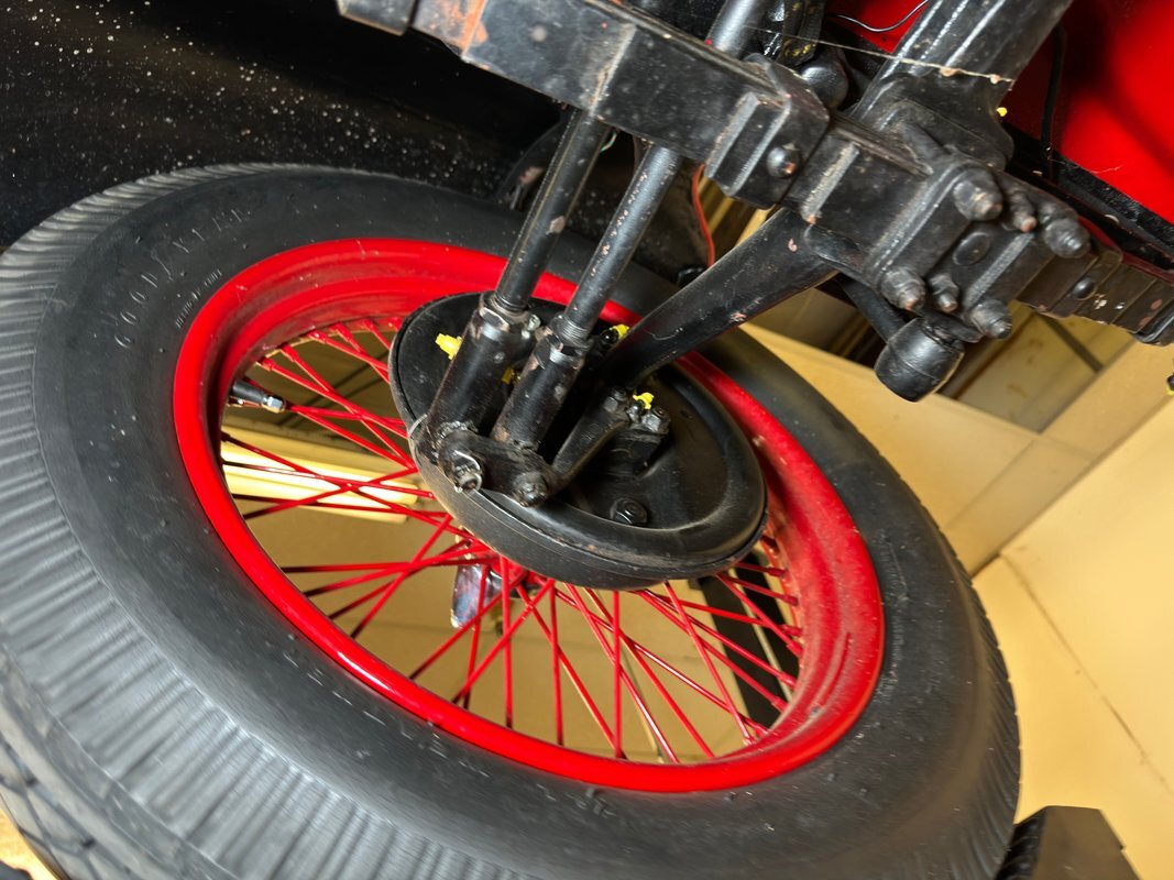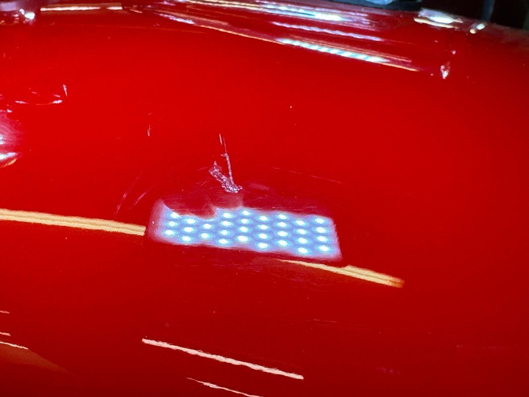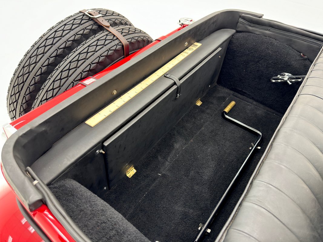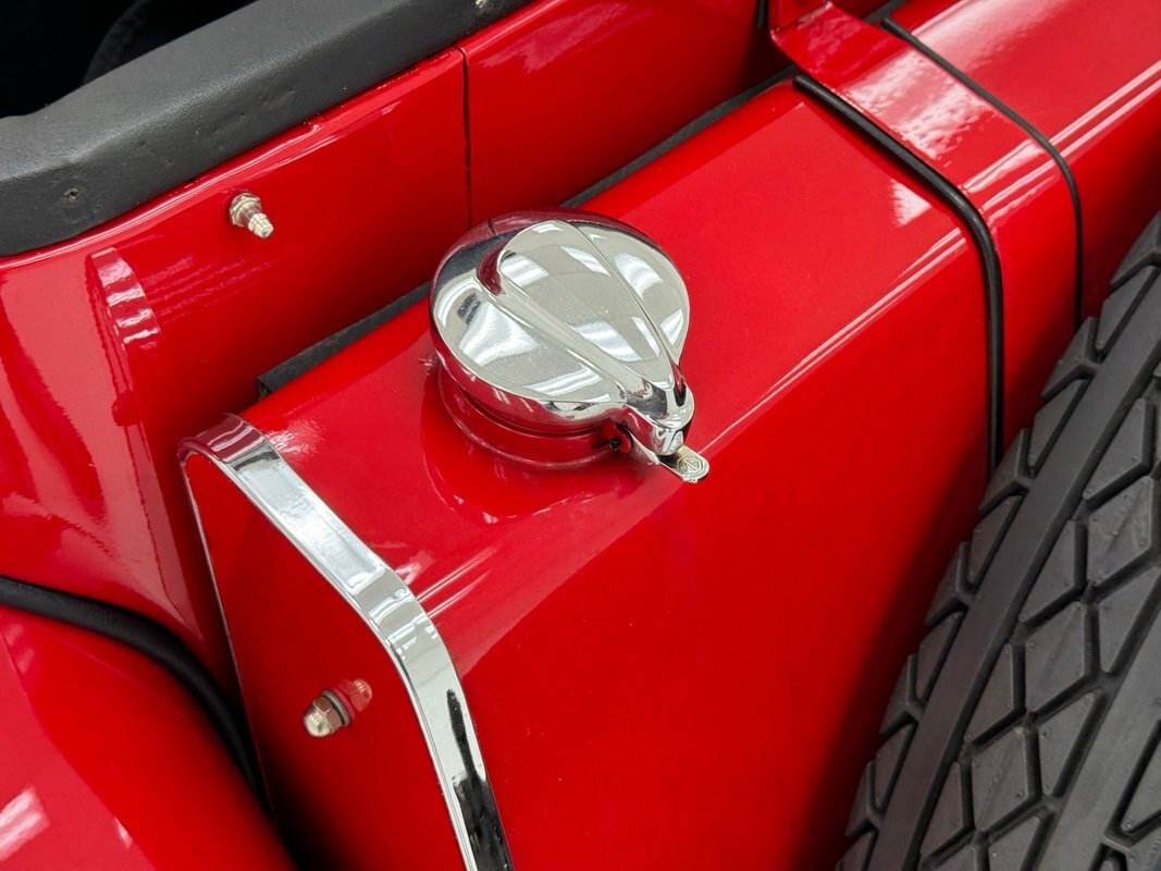 If red cars get more traffic tickets, get ready to write some checks because this car absolutely pops. Beautiful glossy red covers the entire car from the long sweeping front fenders to the circular rear fenders that end in a point behind the car. The grille alternates red slats with black ones and looks race and show ready with a bevy of grille badges strewn across the lower light bar. You can't miss the large number 3 on the doors, black and bold in Gothic script and pulling in other black elements of the car including the tires and interior in a beautifully harmonized palette. The 19-inch red wire wheels are spectacular, and two spares are mounted onto the back, just in front of a wedge shaped gas tank, topped by a gleaming polished cap. Speaking of gleaming, all the chrome and polished metals are in excellent condition. Three small imperfections include a touched up scratch, a lower scuff, and a paint chip.