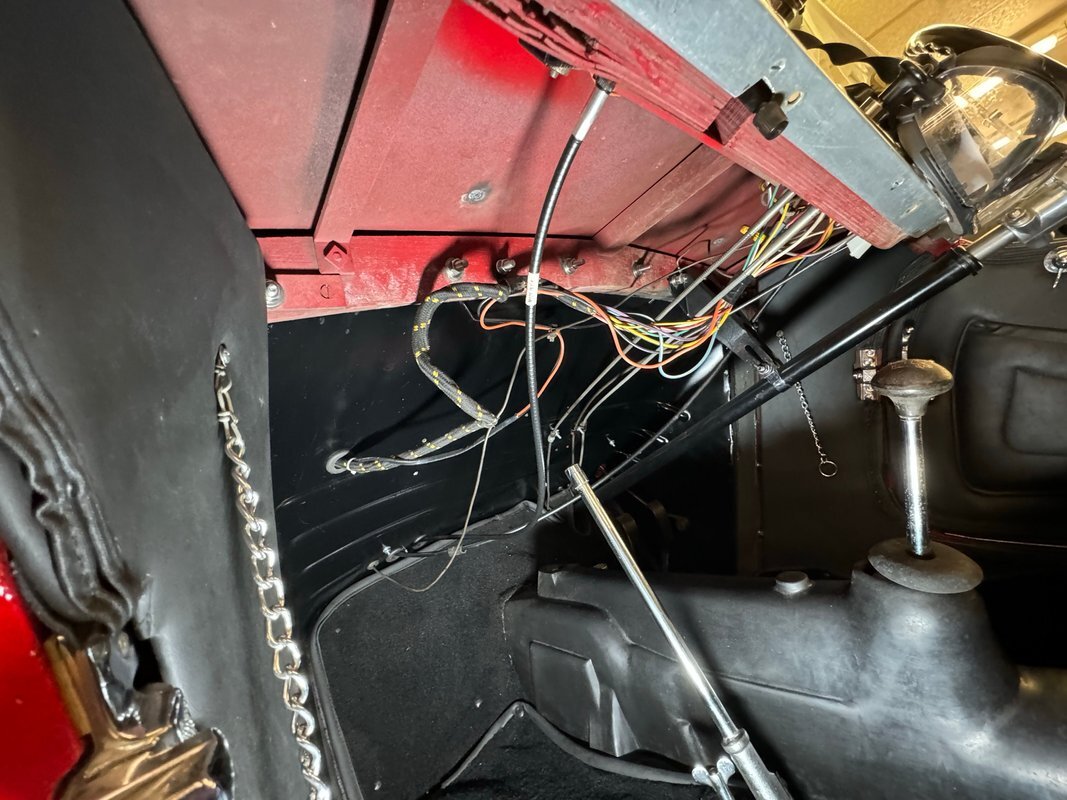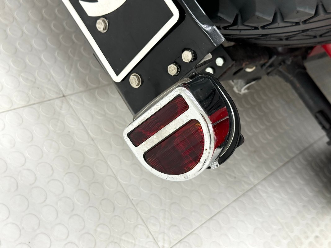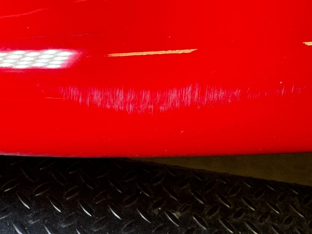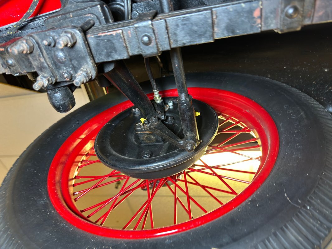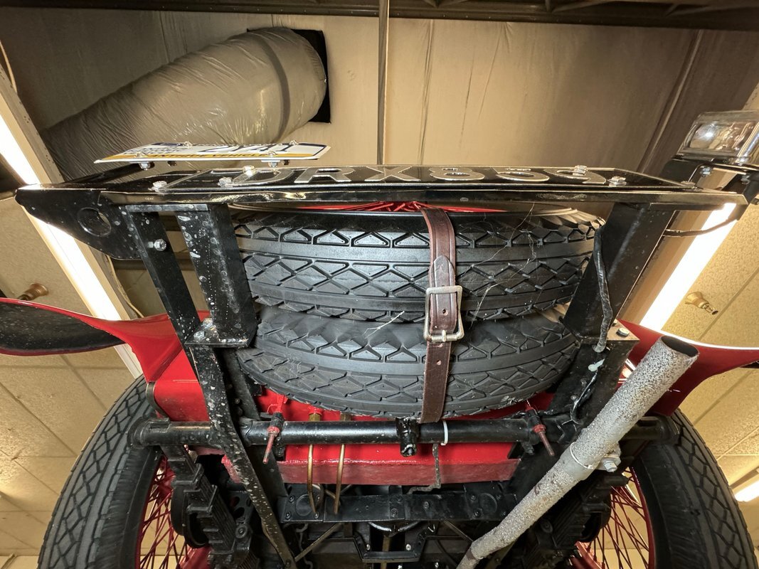 If red cars get more traffic tickets, get ready to write some checks because this car absolutely pops. Beautiful glossy red covers the entire car from the long sweeping front fenders to the circular rear fenders that end in a point behind the car. The grille alternates red slats with black ones and looks race and show ready with a bevy of grille badges strewn across the lower light bar. You can't miss the large number 3 on the doors, black and bold in Gothic script and pulling in other black elements of the car including the tires and interior in a beautifully harmonized palette. The 19-inch red wire wheels are spectacular, and two spares are mounted onto the back, just in front of a wedge shaped gas tank, topped by a gleaming polished cap. Speaking of gleaming, all the chrome and polished metals are in excellent condition. Three small imperfections include a touched up scratch, a lower scuff, and a paint chip.