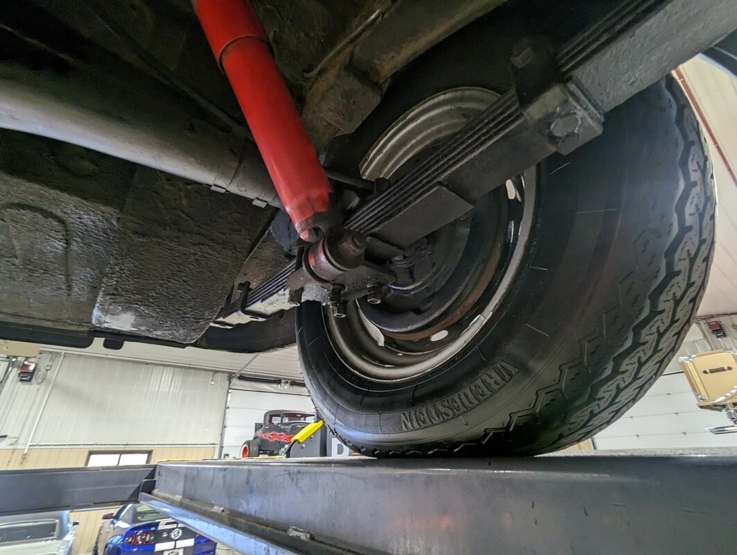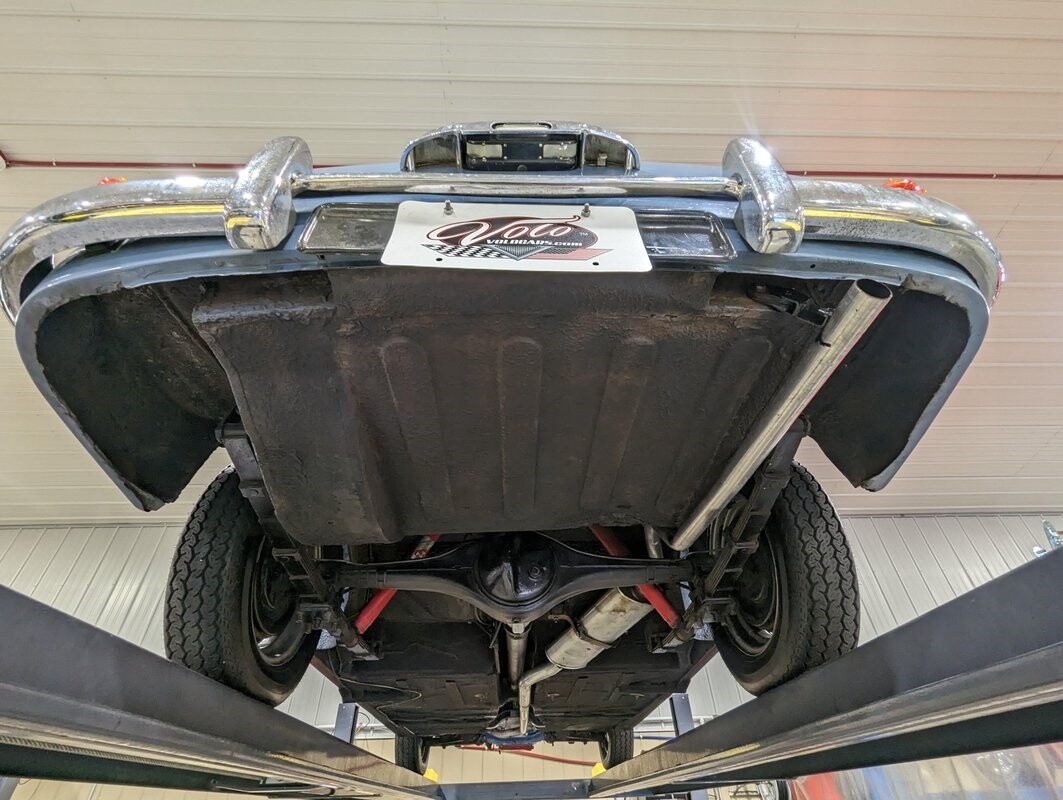 UNDERSIDE: Underneath the car is clean, the frame is painted the same French blue, floors are solid. It has rack and pinion steering and disc brakes in the front. It appears the front end components were taken apart and rebuilt. A nice single exhaust system is hung properly, and the rear suspension looks to be replaced.