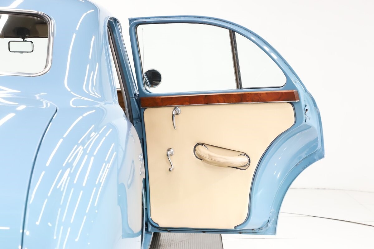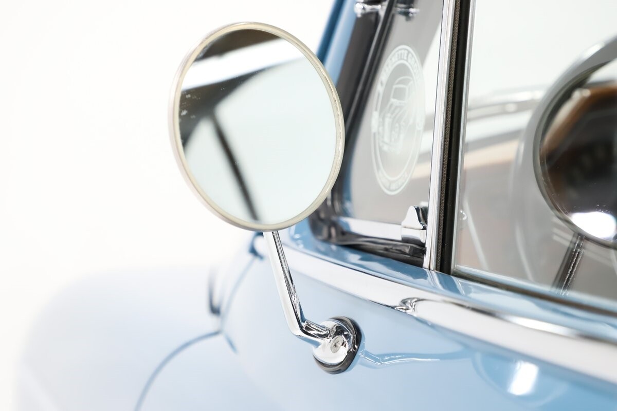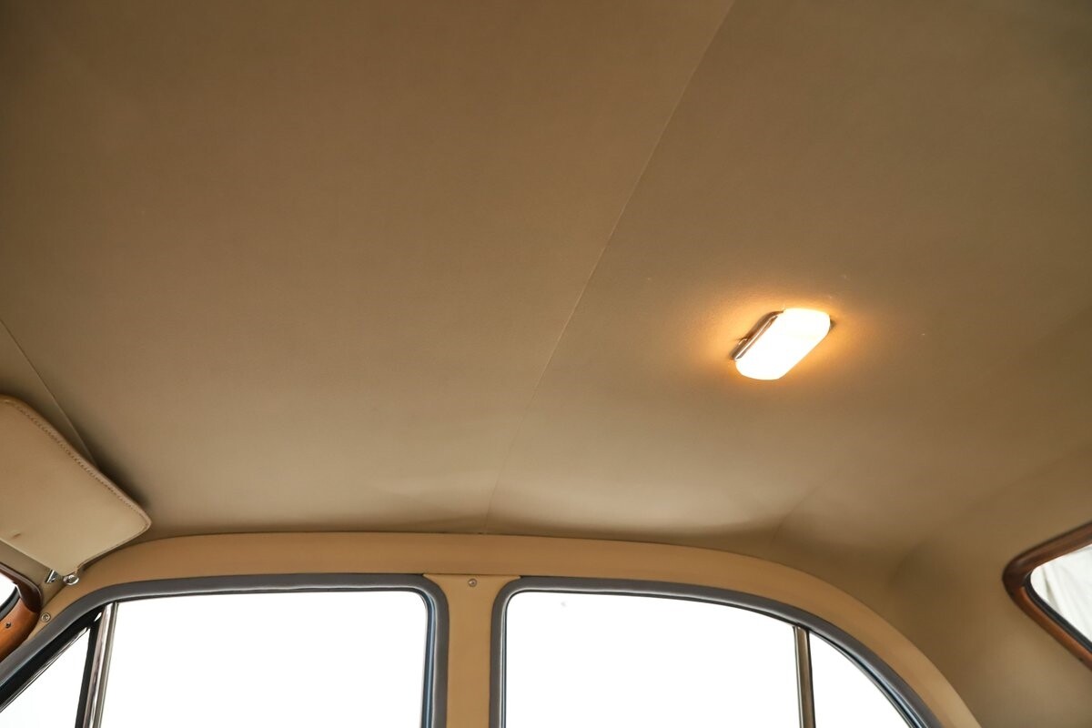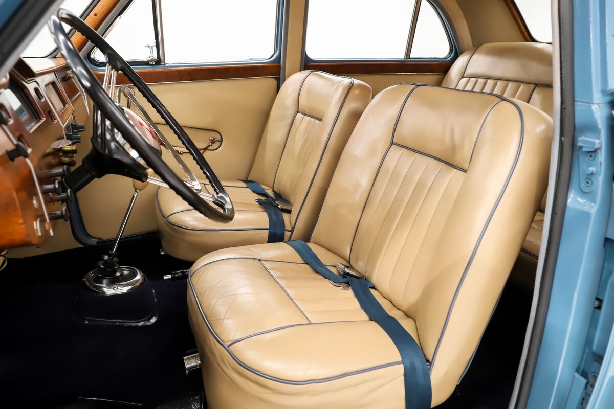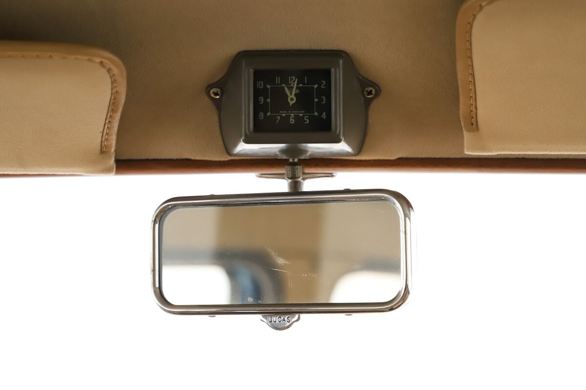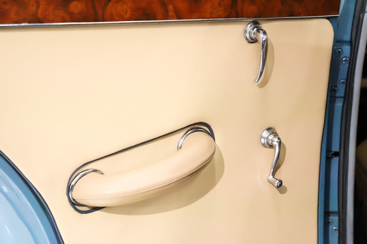 INTERIOR: The cabin is finished with a beautiful cream Connoly leather with blue piping. Bucket seats in front, it has a fold down armrest in back. Seatbelts have been added. It also has a beautiful wood trim. The carpet matches the navy blue accent piping and in great shape. The wood dash, knobs, optional radio and original gauges look nice. It has a hidden stereo under the dash with speakers. The headliner is in great shape. The stylish steering wheel is beautiful and has a working horn. Overall, the interior gives a luxury presence, it reminds me of a Rolls Royce!
