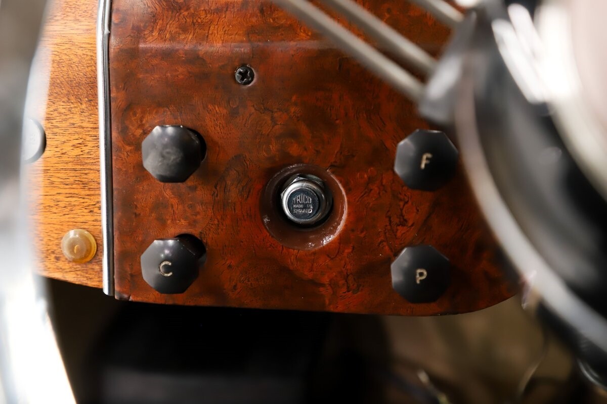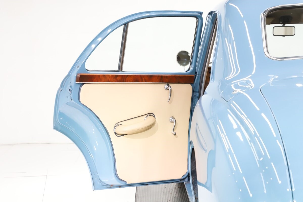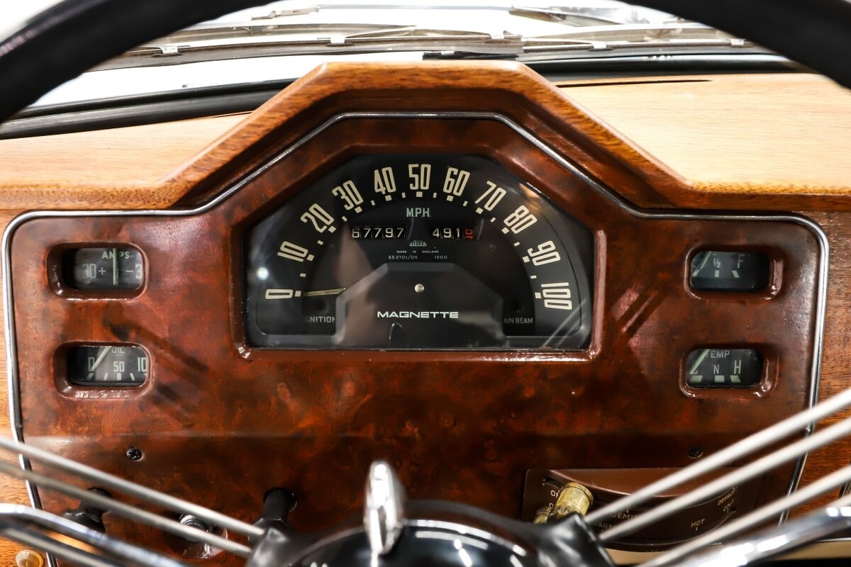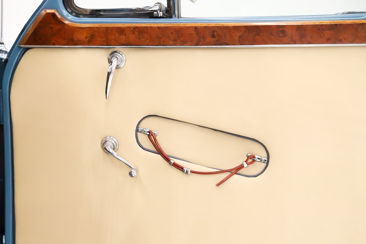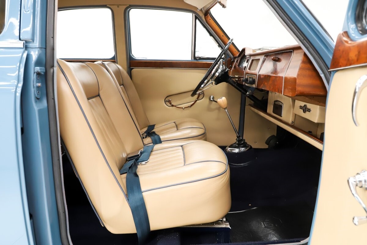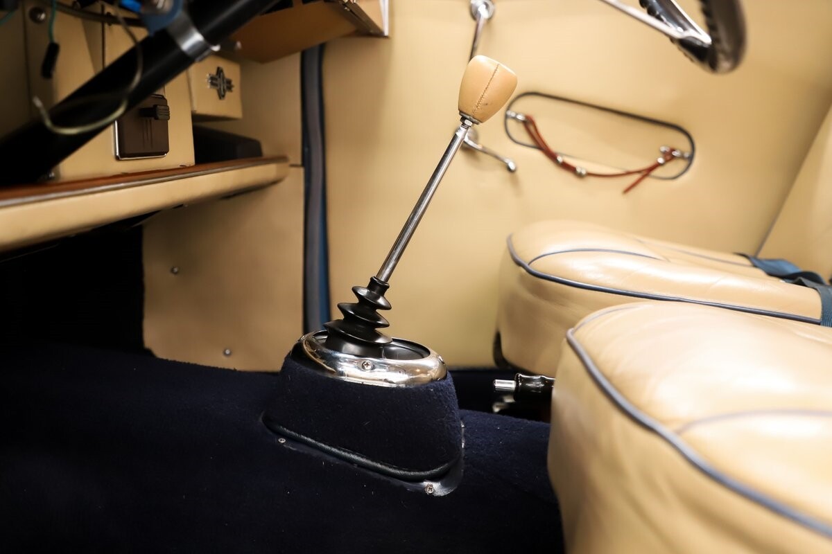 INTERIOR: The cabin is finished with a beautiful cream Connoly leather with blue piping. Bucket seats in front, it has a fold down armrest in back. Seatbelts have been added. It also has a beautiful wood trim. The carpet matches the navy blue accent piping and in great shape. The wood dash, knobs, optional radio and original gauges look nice. It has a hidden stereo under the dash with speakers. The headliner is in great shape. The stylish steering wheel is beautiful and has a working horn. Overall, the interior gives a luxury presence, it reminds me of a Rolls Royce!