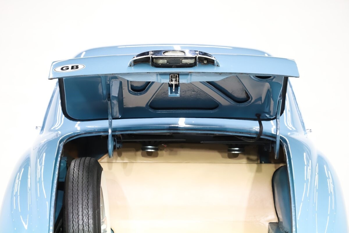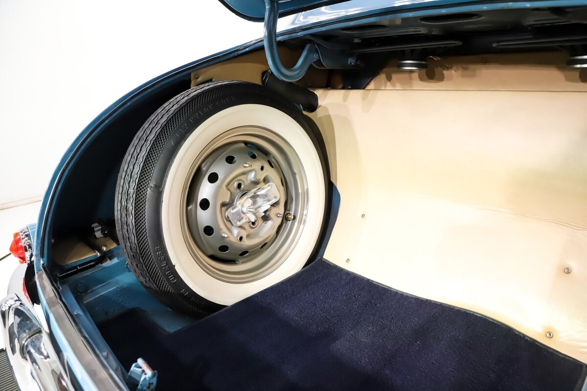 TRUNK COMPARTMENT: The trunk compartment is complete: it has a spare tire, the tool kit, air pump and jack. There's also some literature, British license plates and front badge bar. It is solid and painted nicely. It also has a cream color liner and blue carpet mat.
