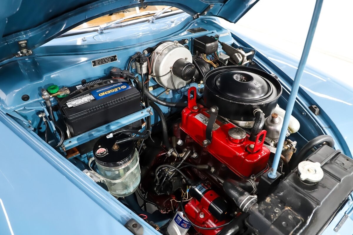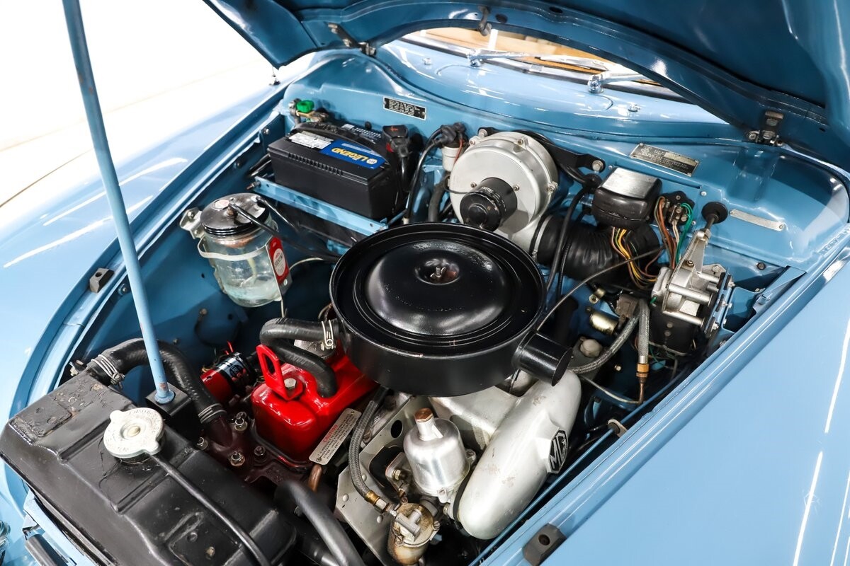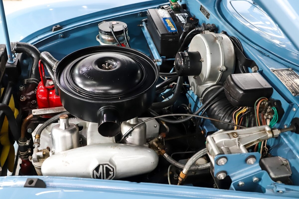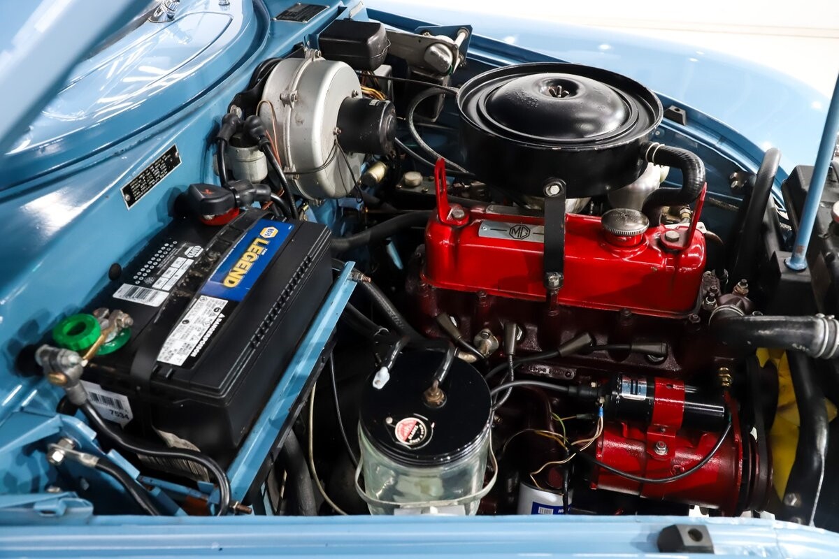 ENGINE COMPARTMENT: Upgraded with the more powerful B series 1798cc 4cyl MGB engine paired with twin carbs. Everything is nice, clean and proper. The engine is painted nicely, it has a clean glossy engine bay too. 12 volt battery with a disconnect swtich.