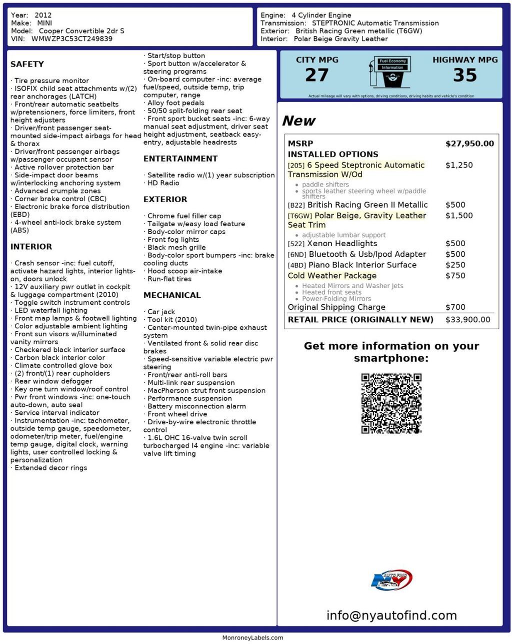 Take a look at this 2012 British Racing Green Metallic MINI Cooper S Convertible with Polar Beige Gravity Leather Interior, a Clean Carfax and only 105,280 miles. This is a convertible that is not only fun, but very practical. It is made for any weather conditions with it's Cold Weather Package, has a clean history and even has relatively low mileage. This is a car that shines in every way. It comes equipped with a 1.6L 4-cylinder engine paired to a 6-speed Automatic Transmission, Cold Weather Package (with Heated Front Seats, Heated Mirrors and Washer Jets, Power-Folding Mirrors), Gravity Leather Seat Trim, Sports Leather Steering Wheel, Xenon Headlights, Bluetooth & USB Adapter, Piano Black Interior Surface, Cruise Control, AM/FM/HD Radio, Satellite Radio, Steering Wheel Controls, Power Windows, Power Locks, Air Conditioning and so much more. Every NY Auto Find vehicle comes with a complimentary Limited Warranty and a Carfax Vehicle Report. Our vehicles are priced to sell quickly. Please call to check availability and to schedule an appointment. -